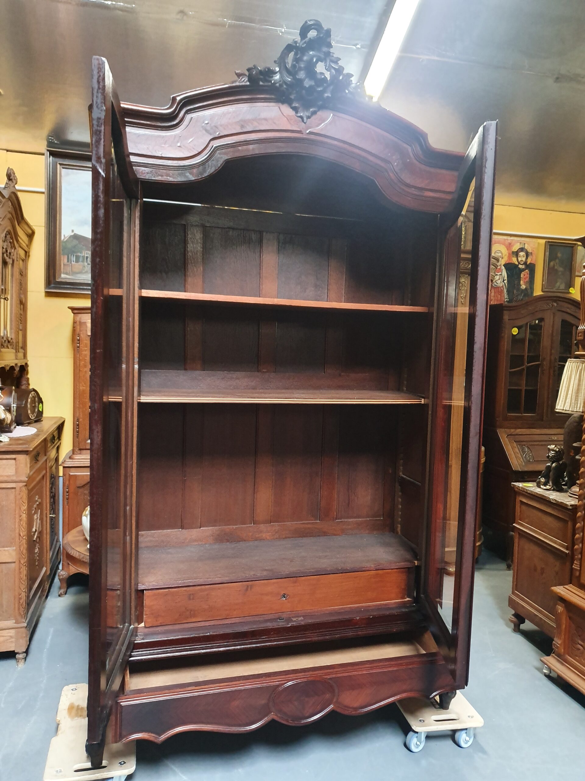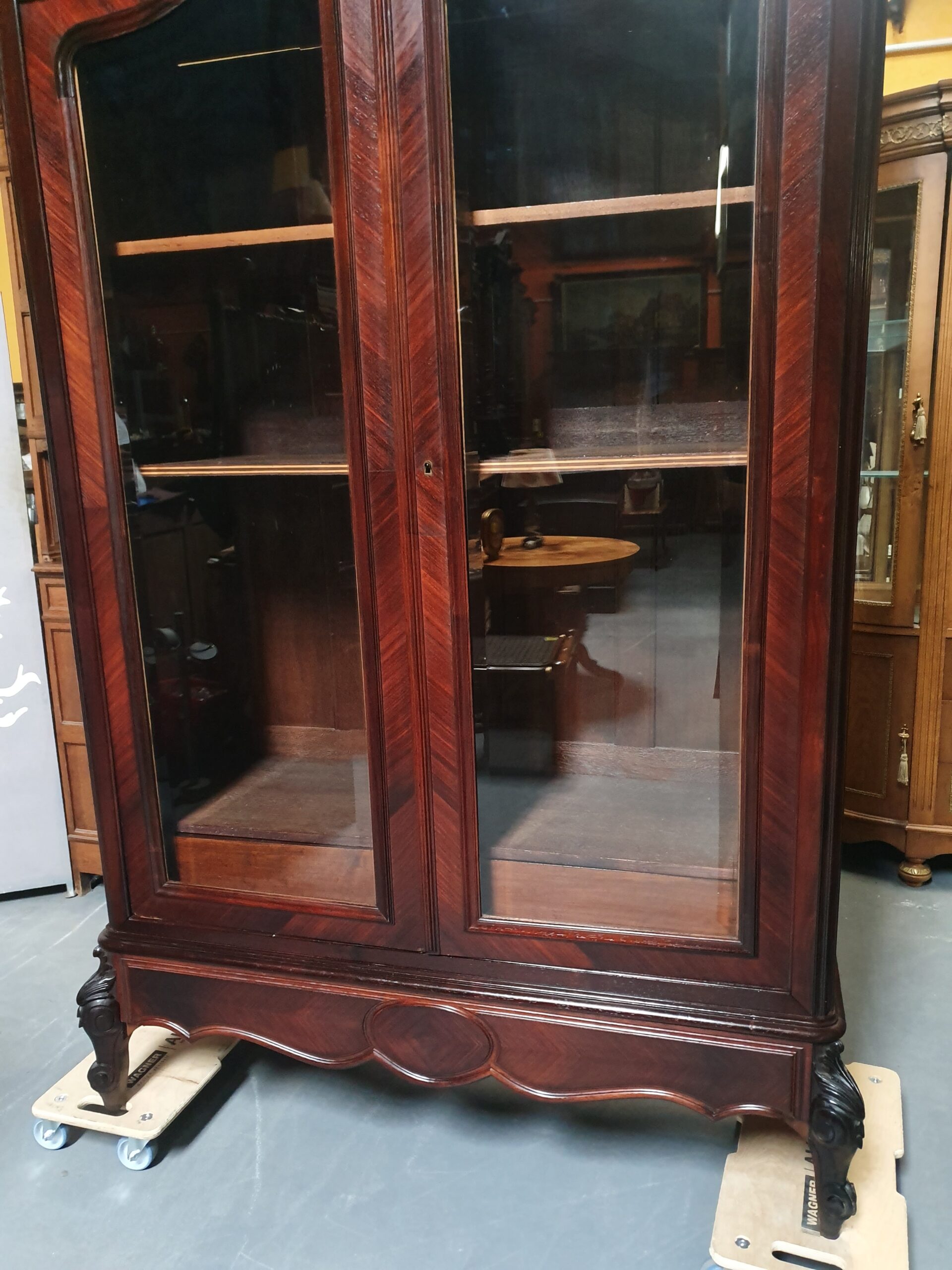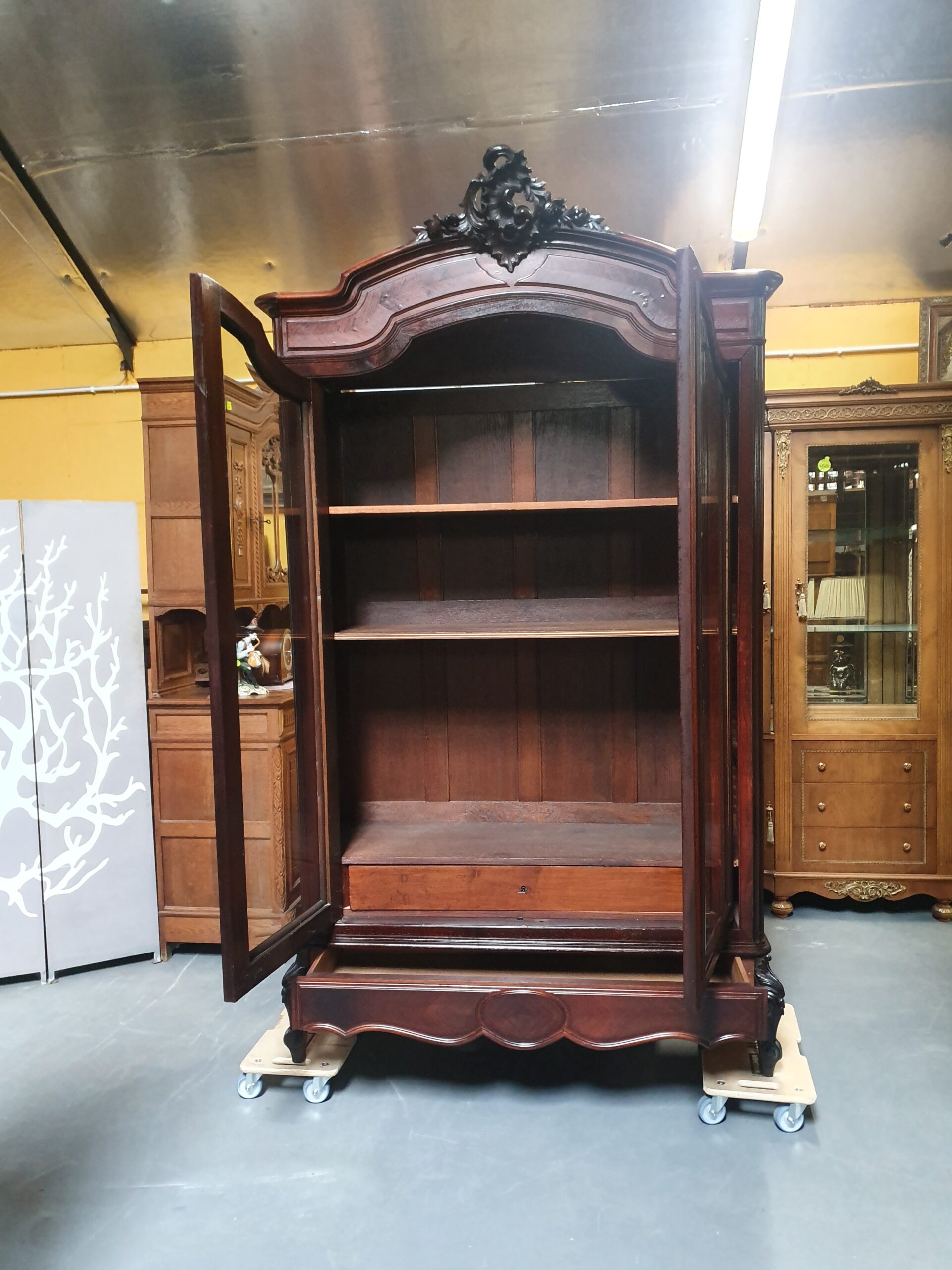 Stara, piękna biblioteka. Mebel został wykonany w stylu ludwikowskim, ozdobiony rzeźbieniami. Za drzwiami z fazowanymi szybami kryją się półki oraz jedna szuflada. Poniżej drzwi zamieszczono dodatkową szufladę.