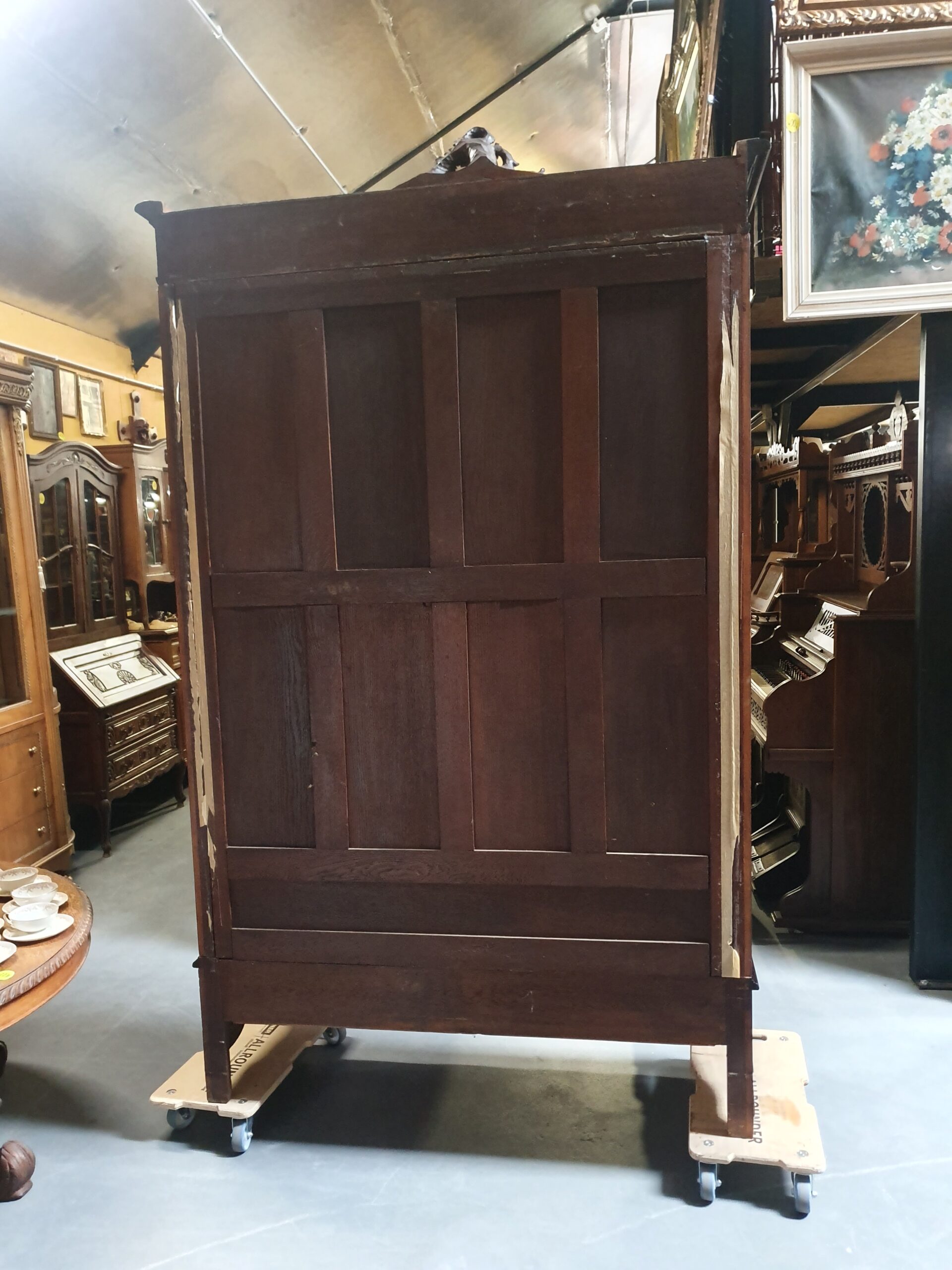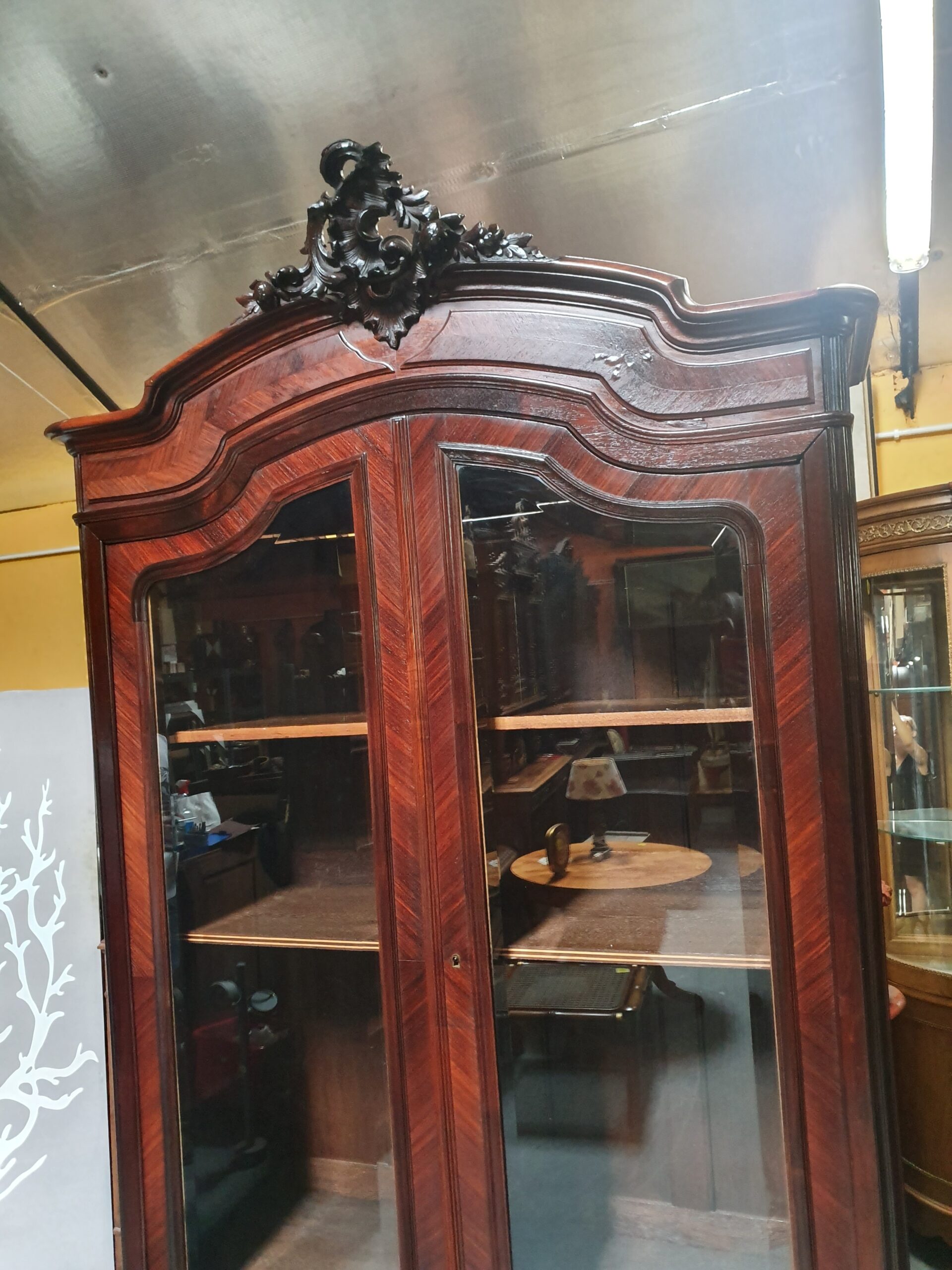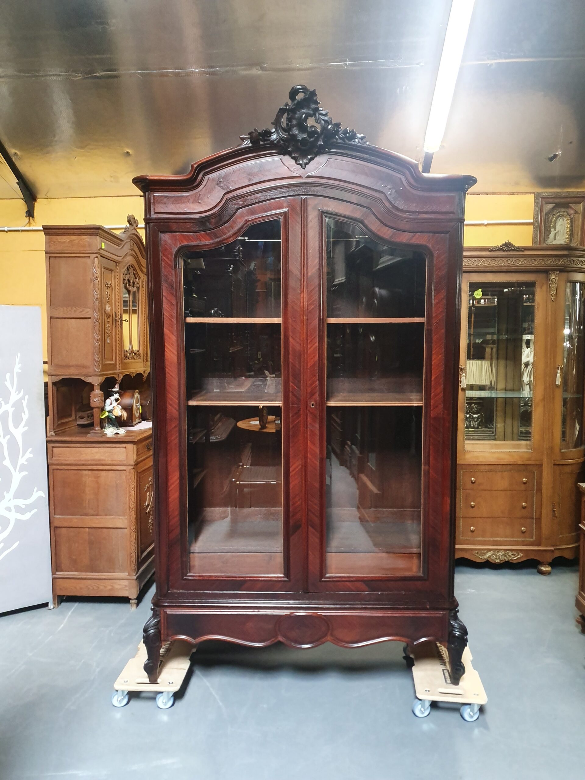 Stara, piękna biblioteka. Mebel został wykonany w stylu ludwikowskim, ozdobiony rzeźbieniami. Za drzwiami z fazowanymi szybami kryją się półki oraz jedna szuflada. Poniżej drzwi zamieszczono dodatkową szufladę.