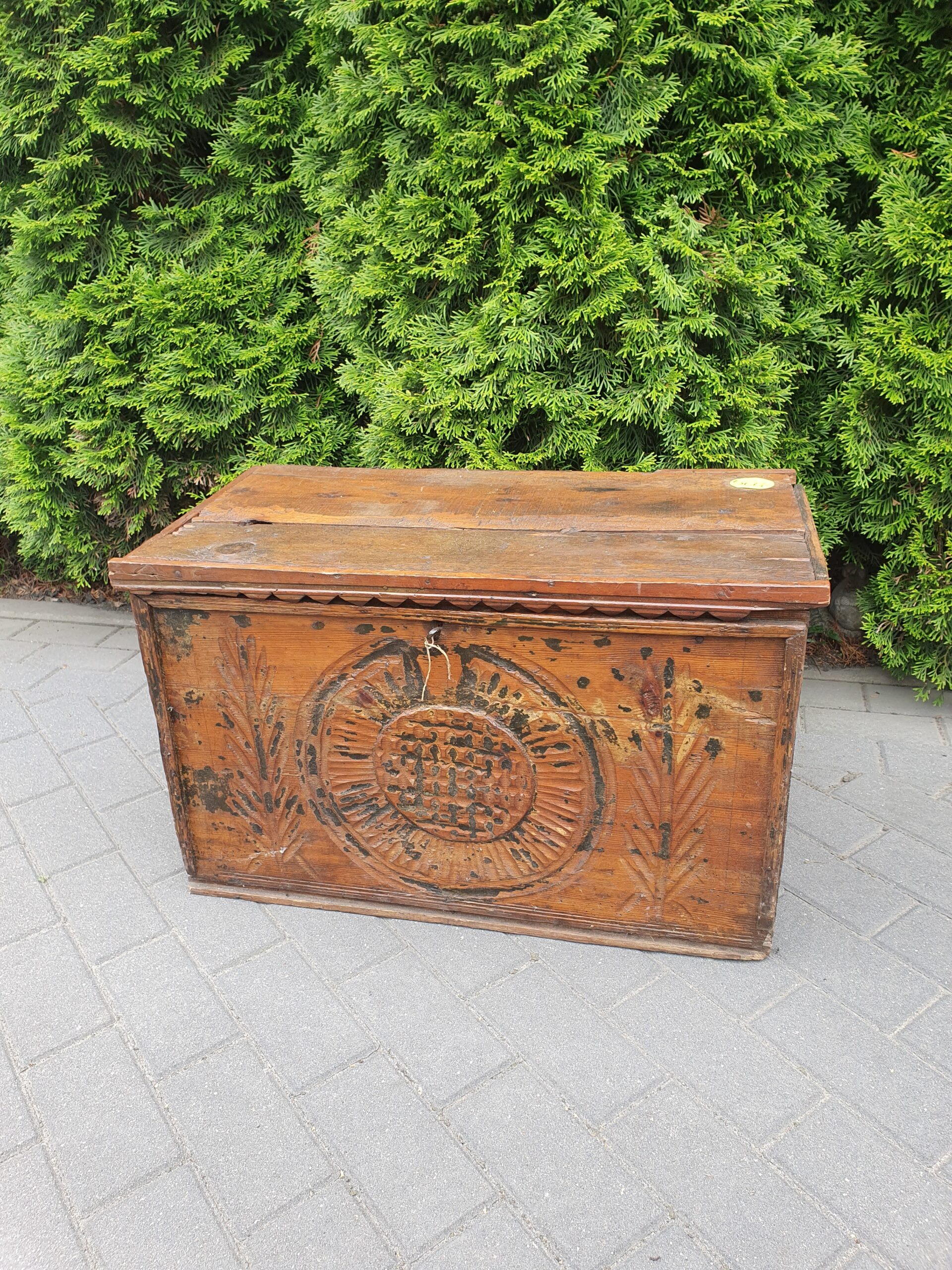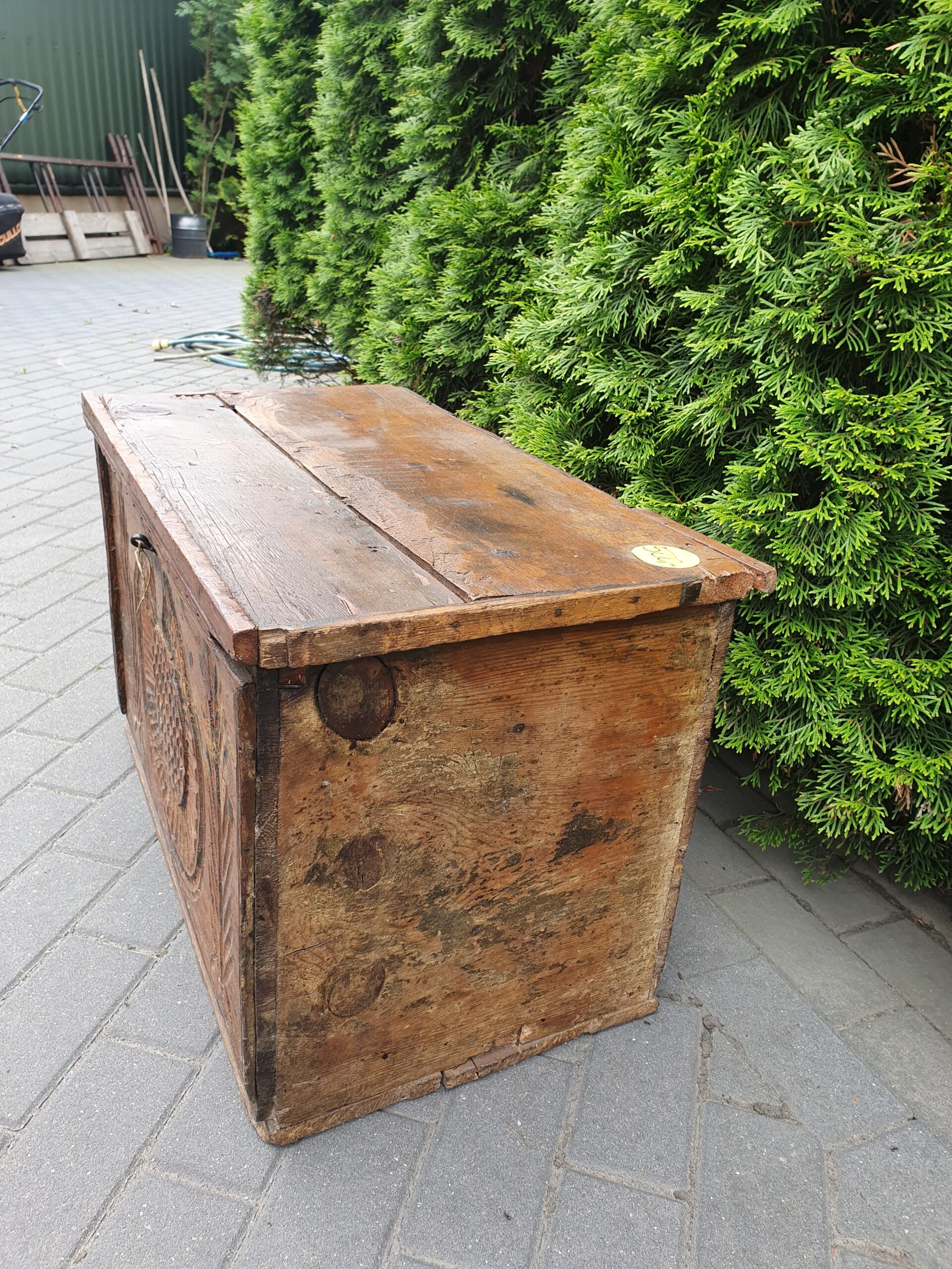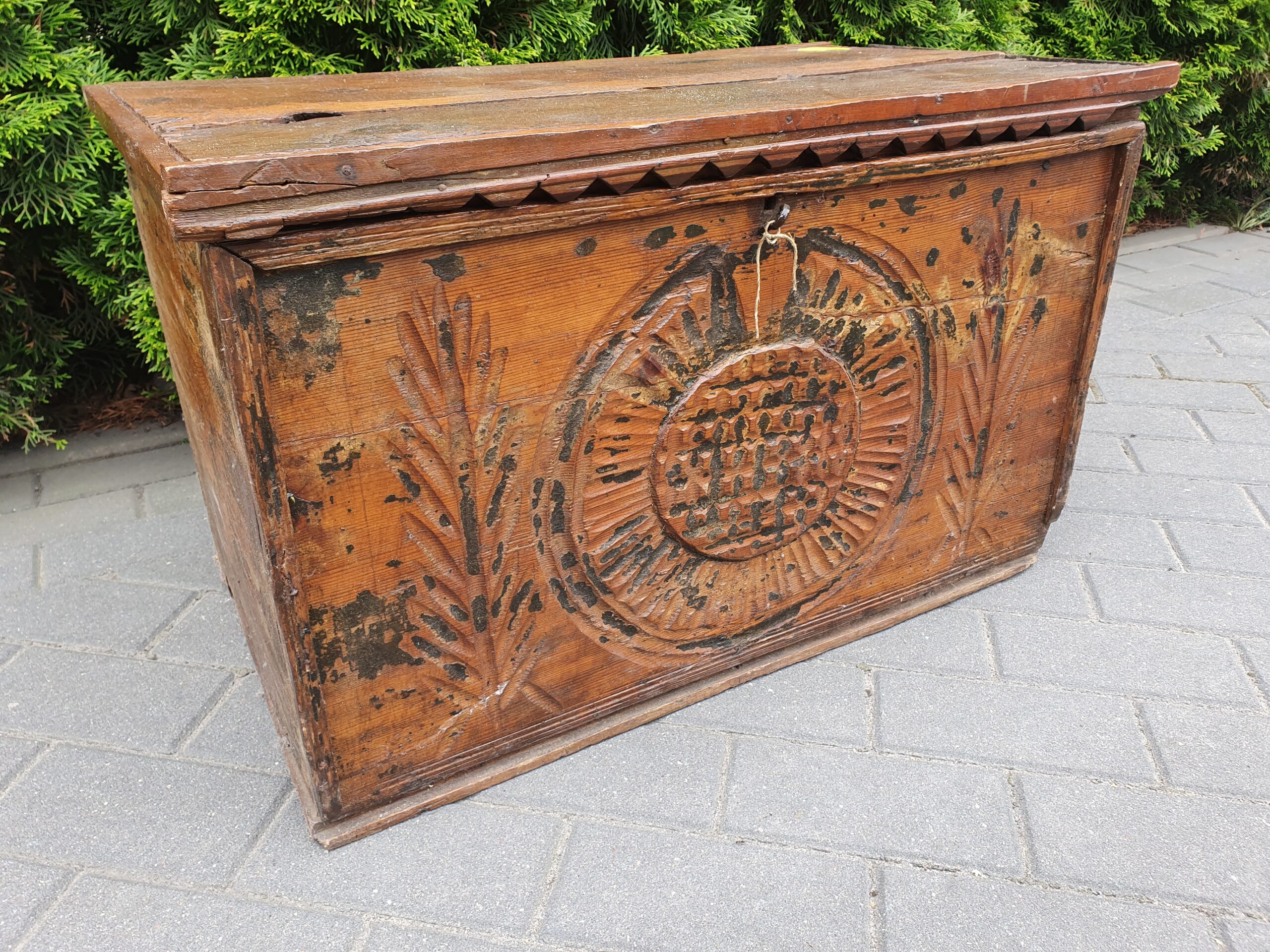 Stara, drewniana skrzynia ozdobiona rzeźbieniami.