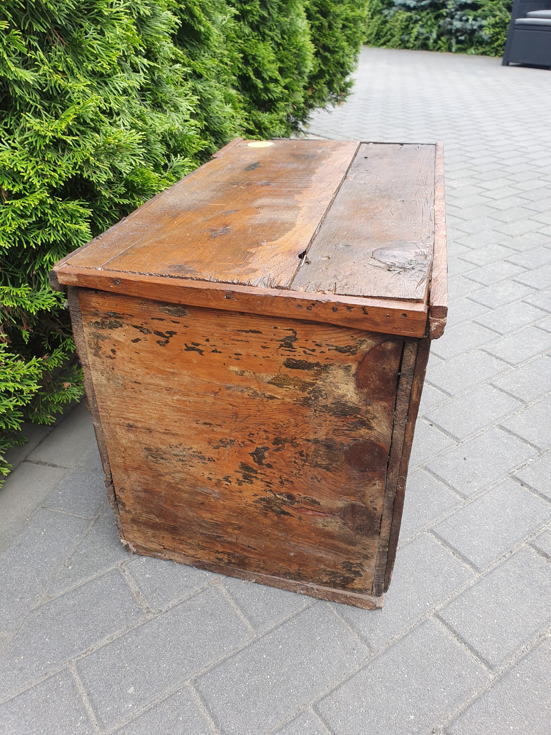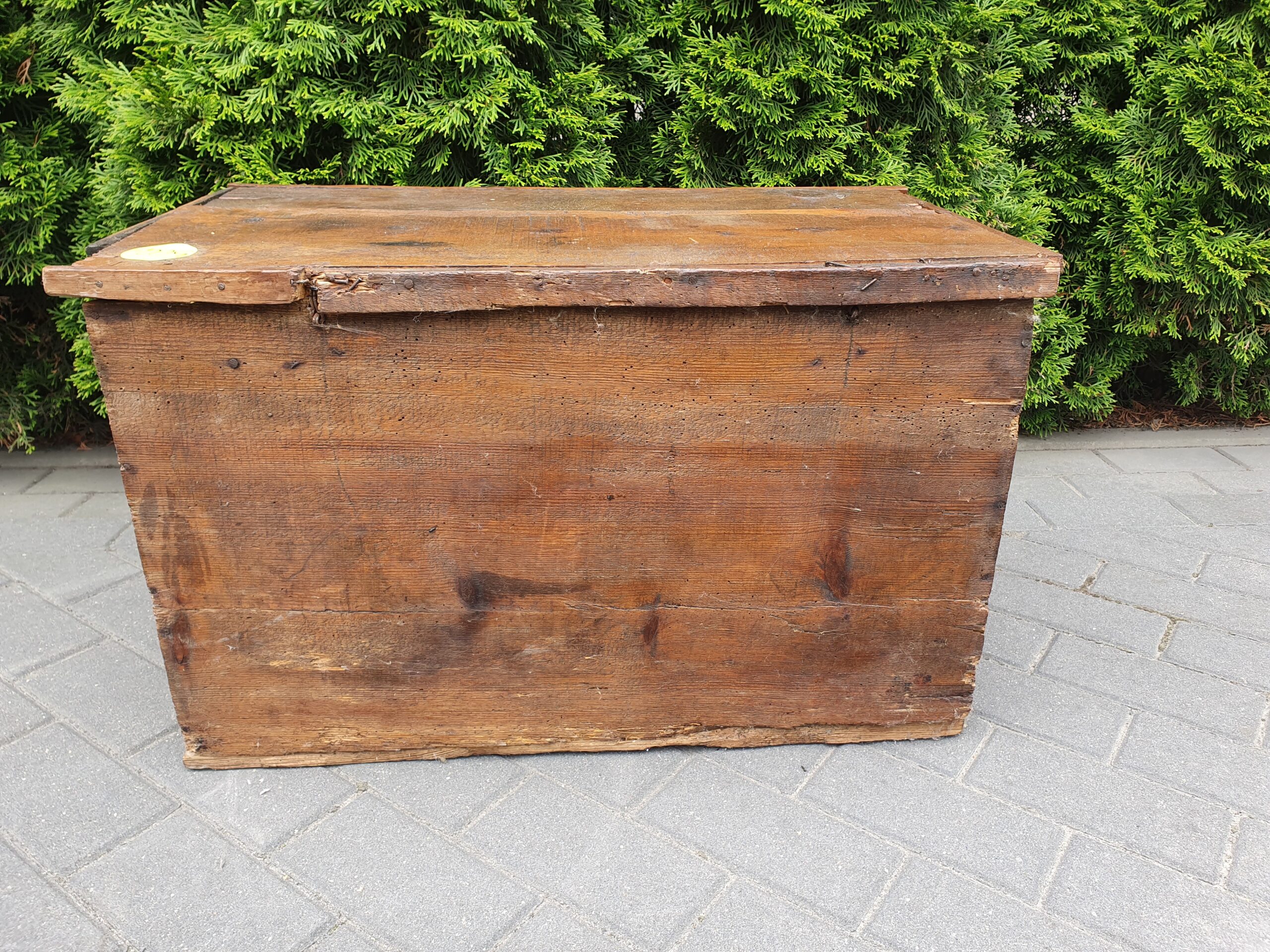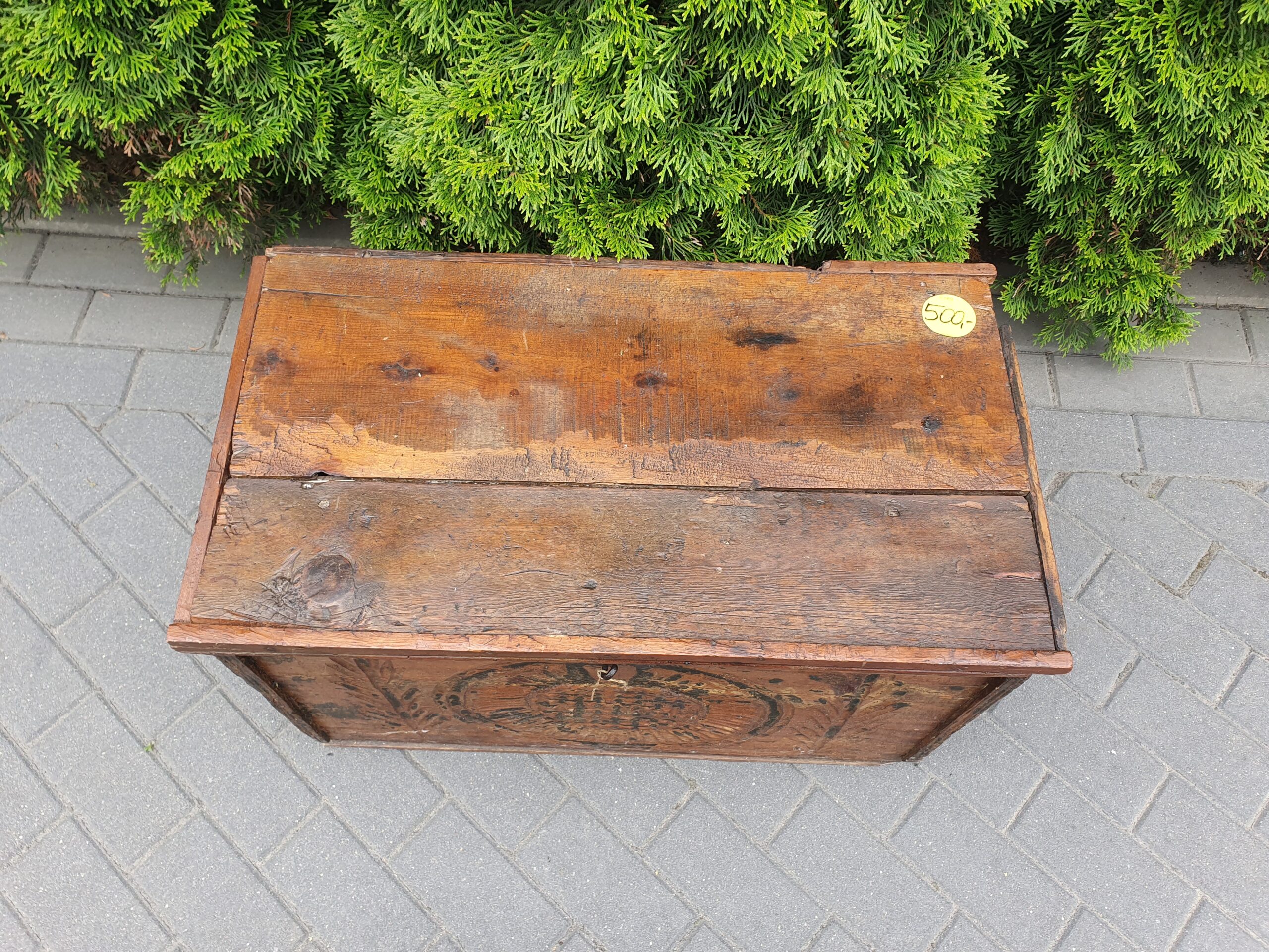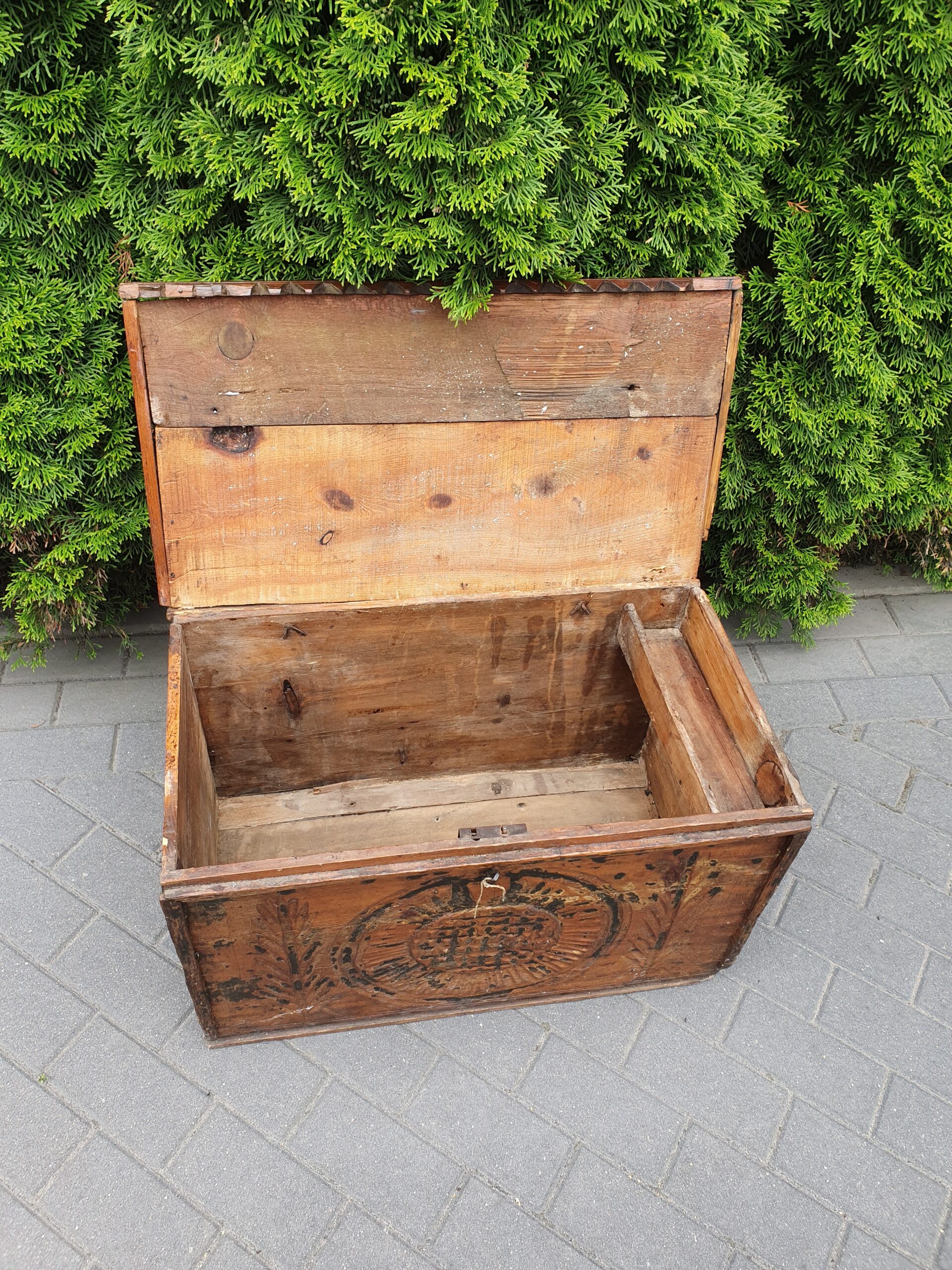 Stara, drewniana skrzynia ozdobiona rzeźbieniami.