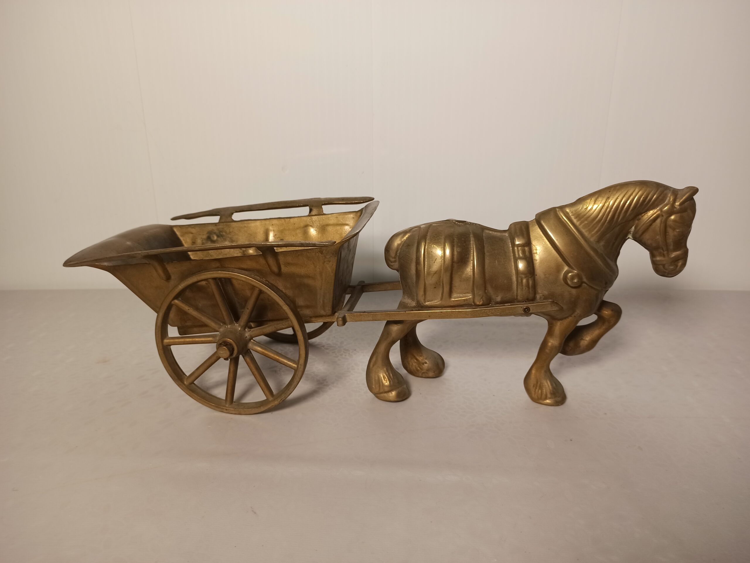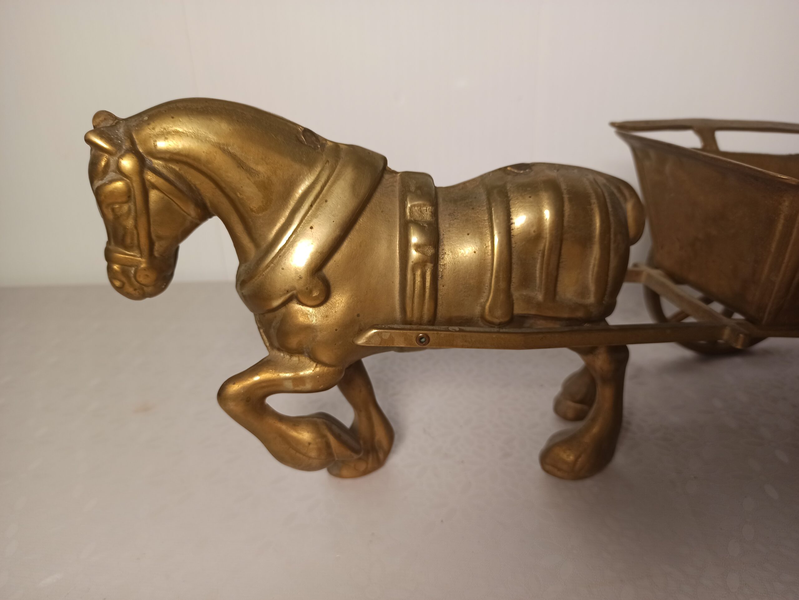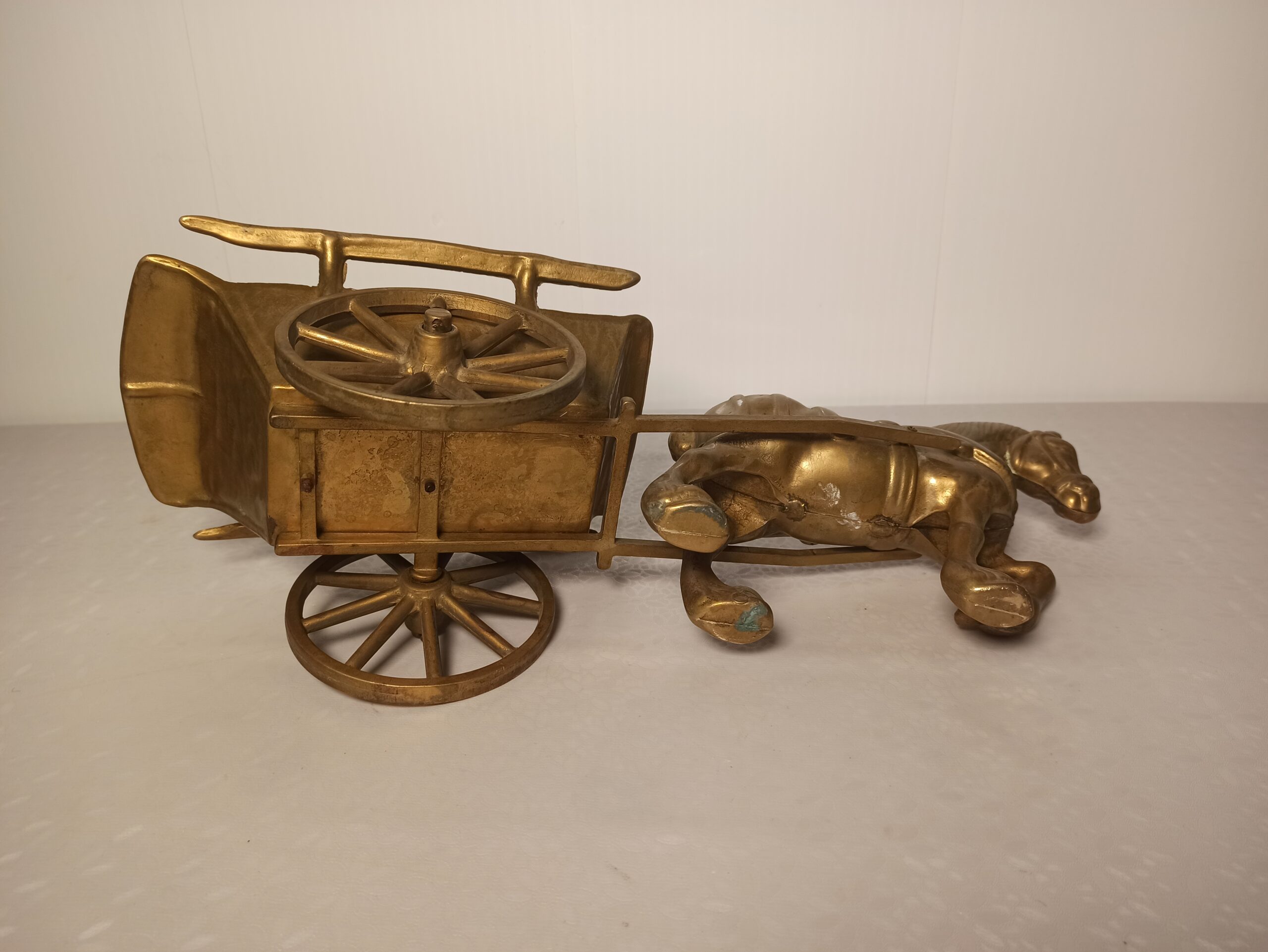 Ciekawy stary koń z wozem wykonany został z mosiądzu.