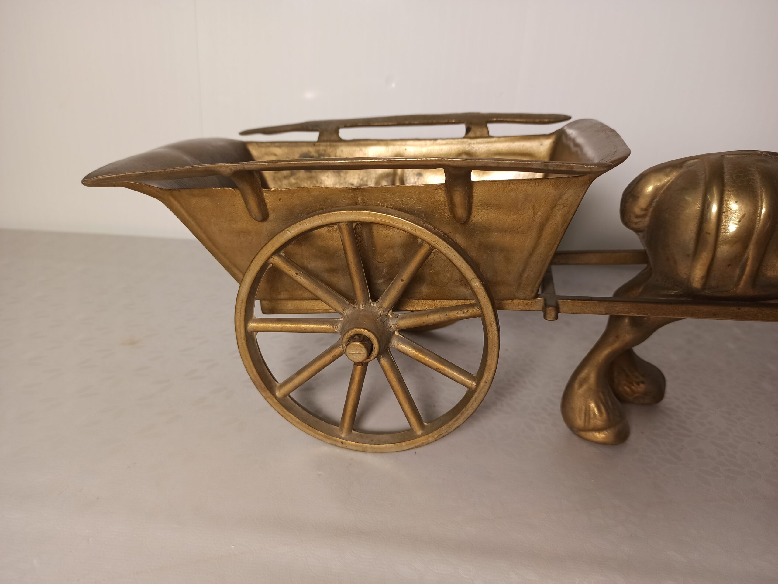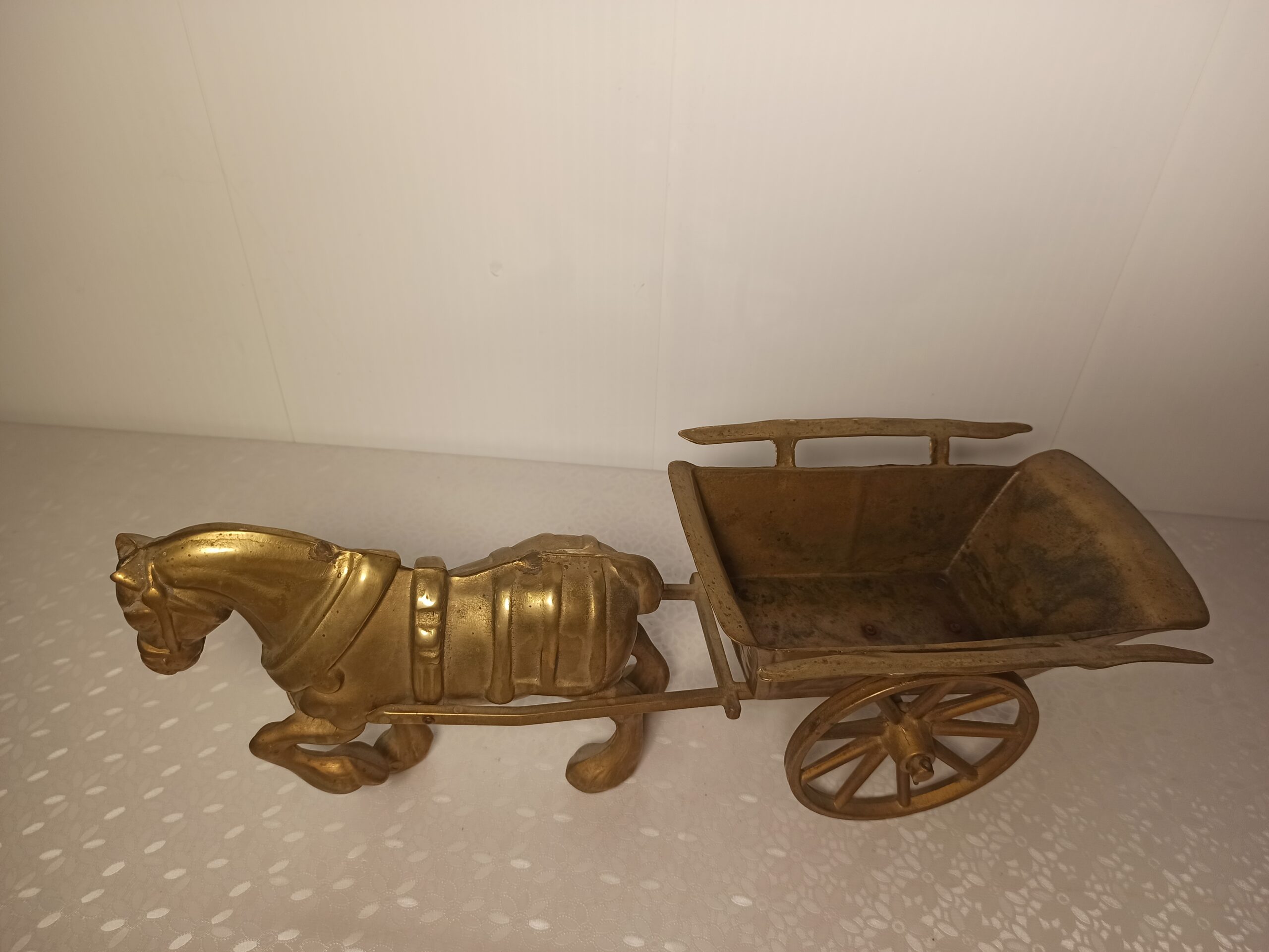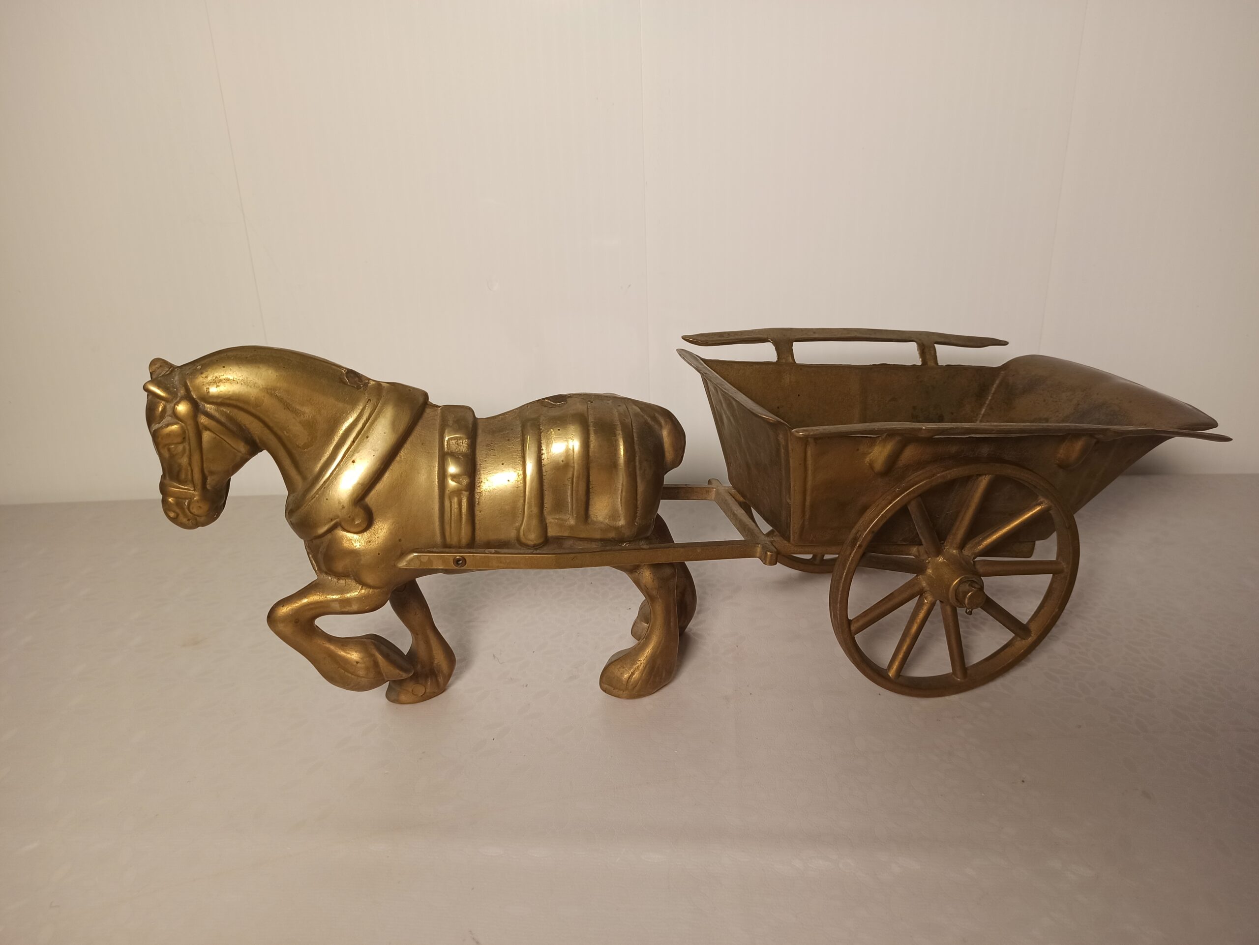 Ciekawy stary koń z wozem wykonany został z mosiądzu.