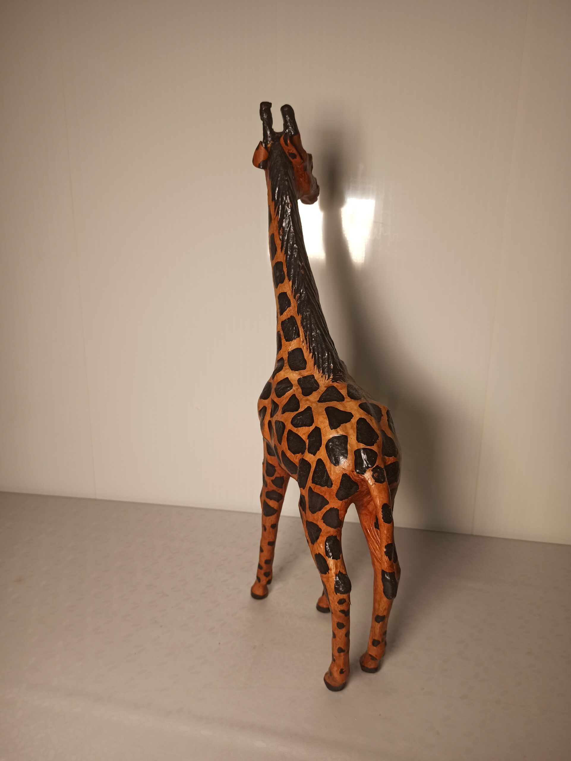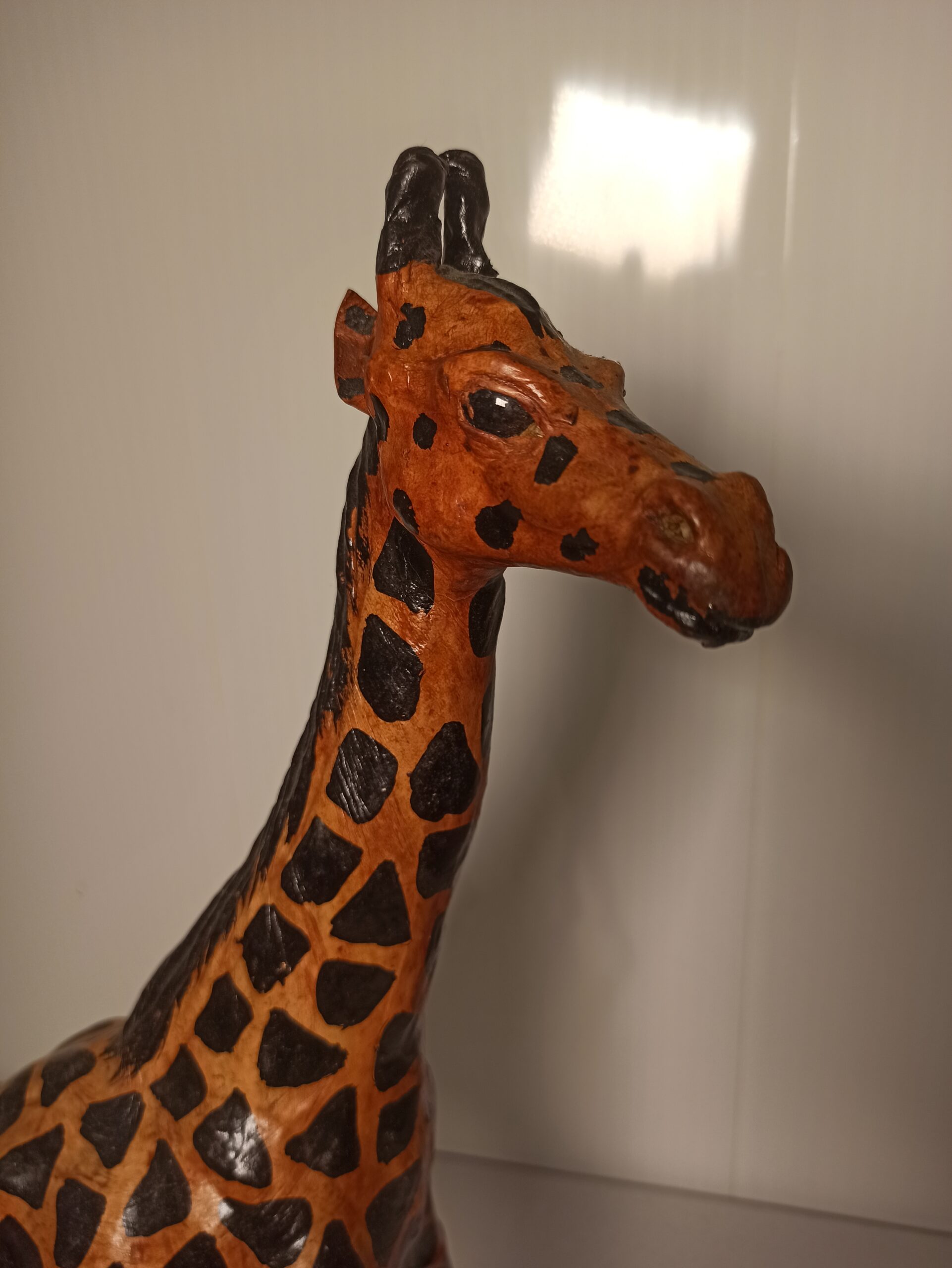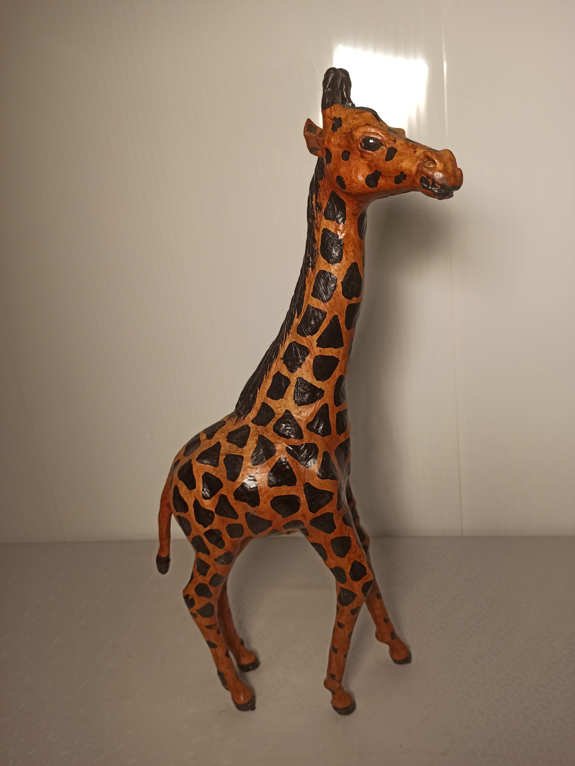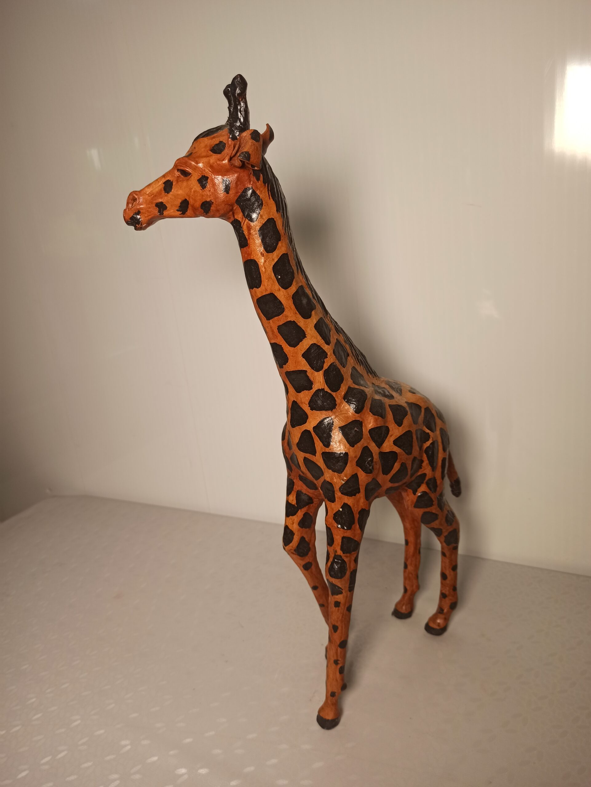 Ciekawa figurka żyrafy wykonana ze skóry.