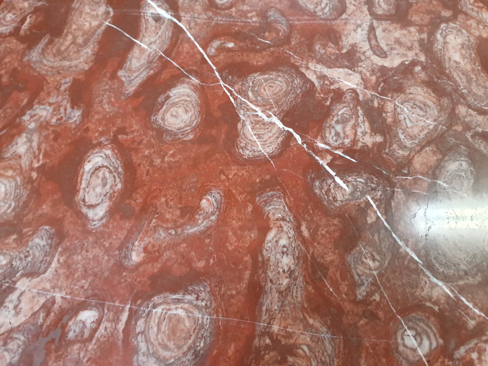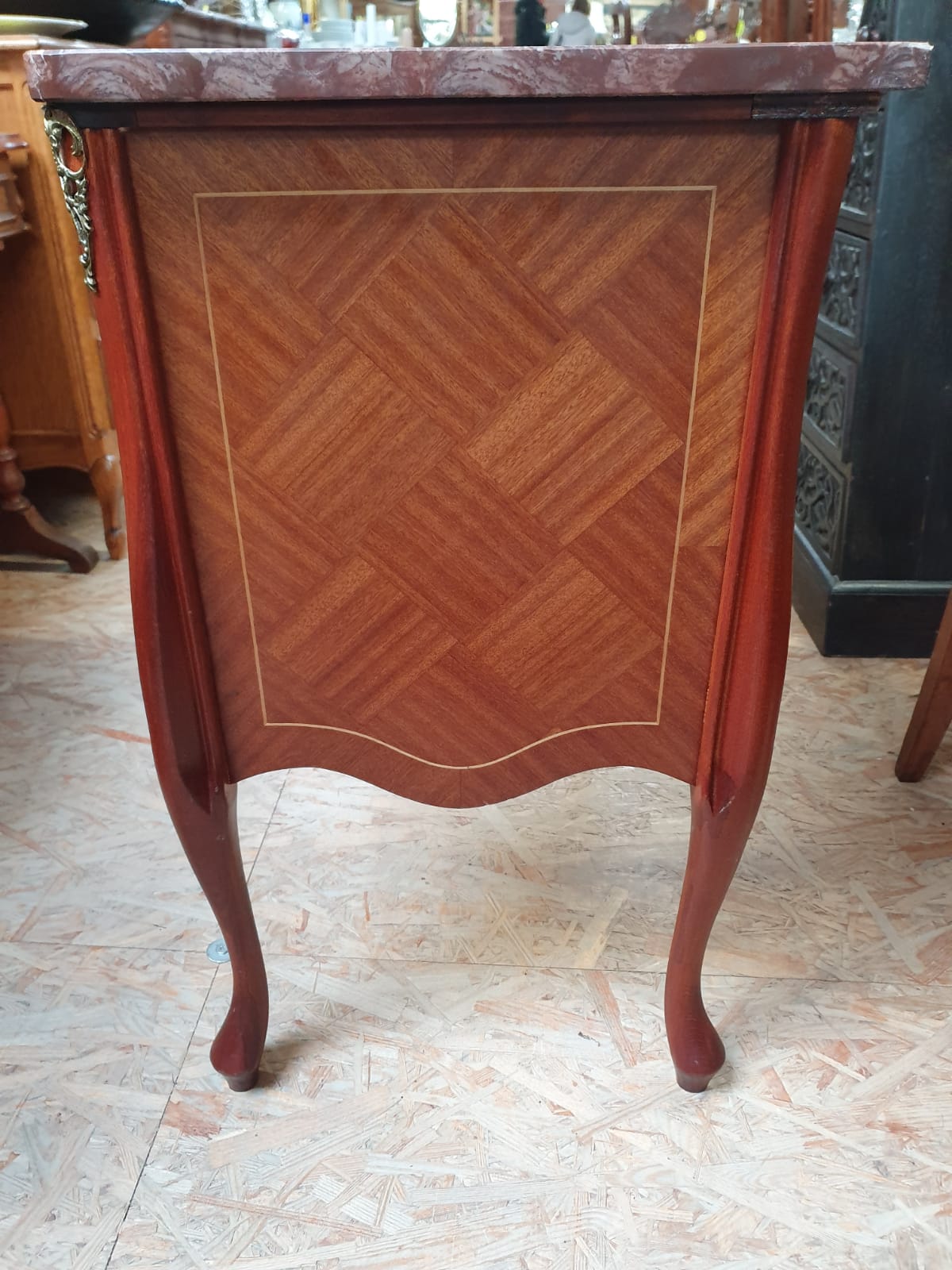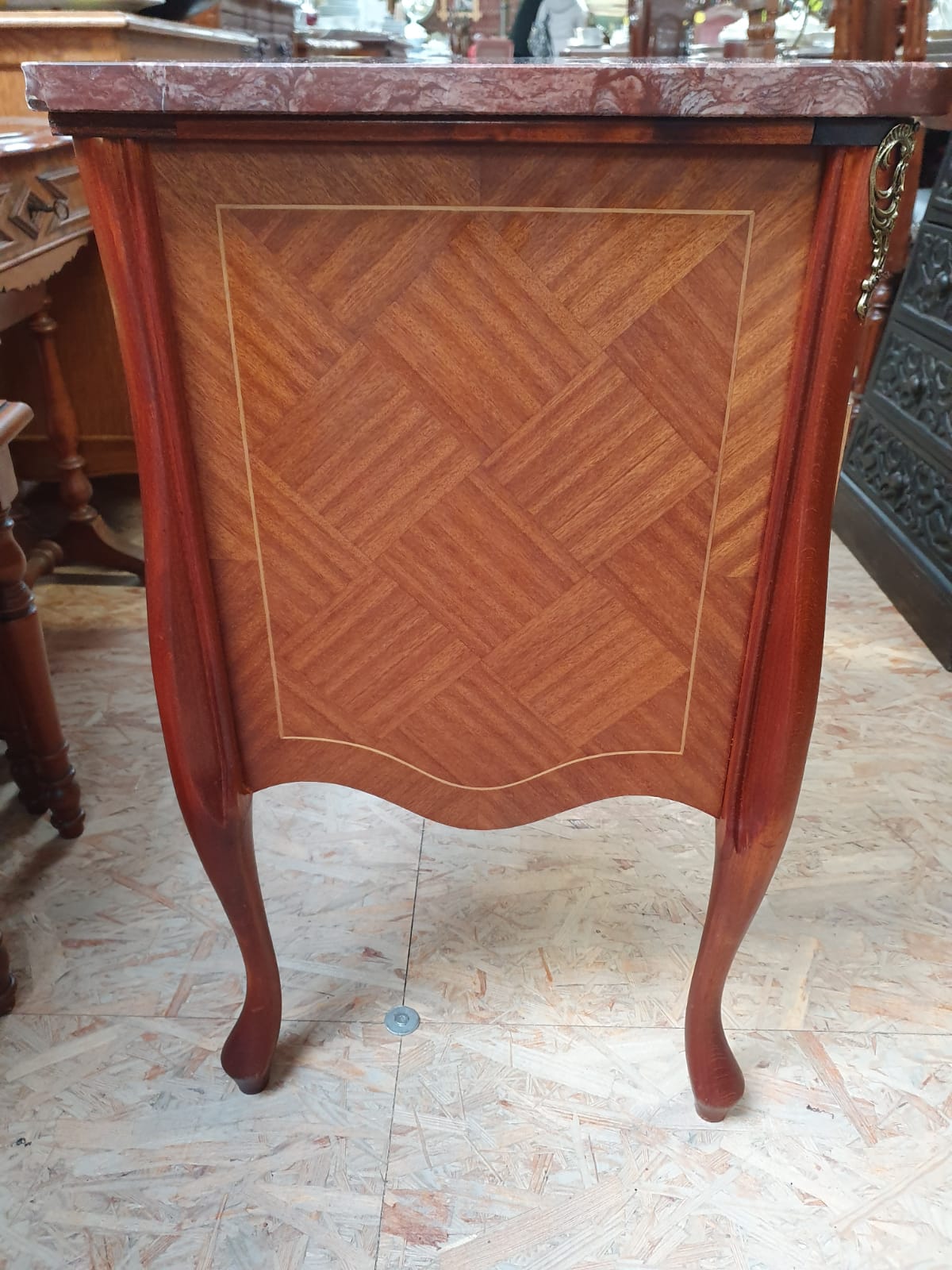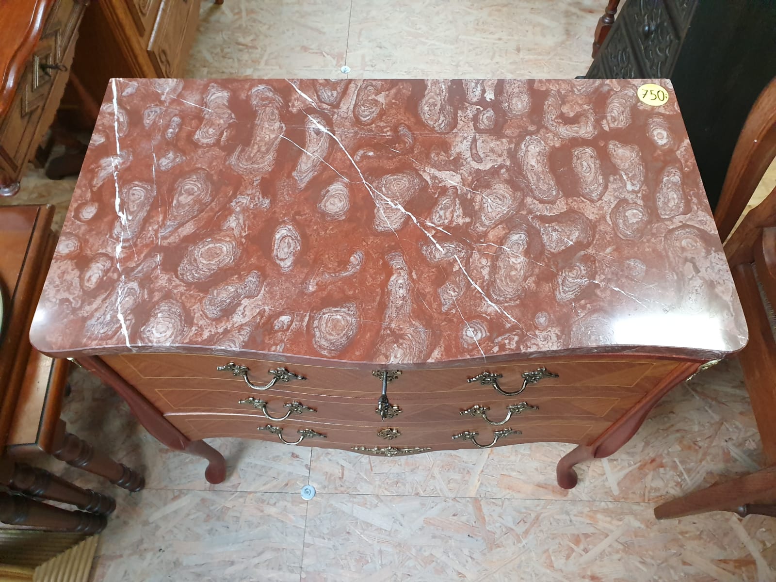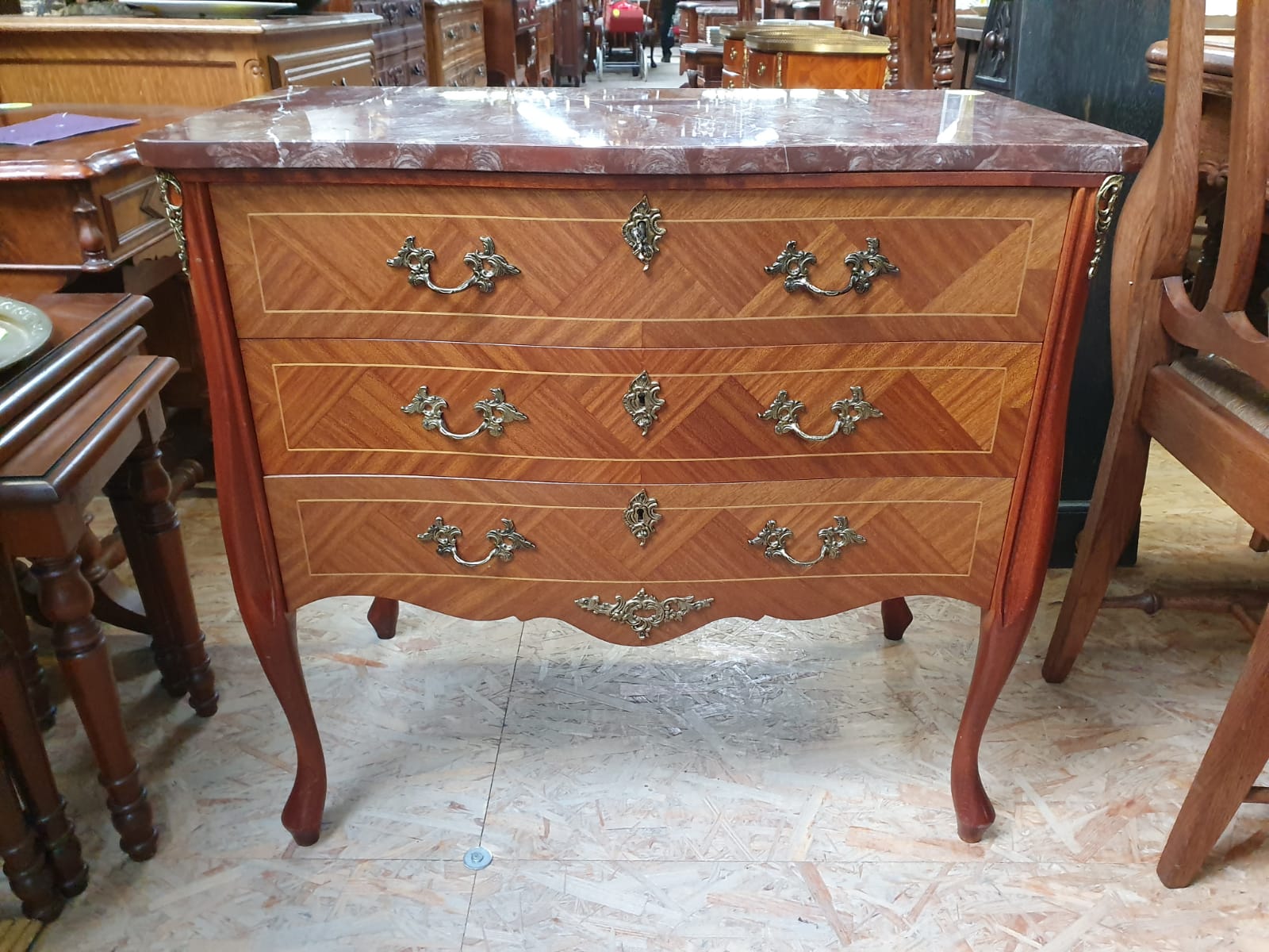 Niewielka komoda w pięknych kolorach. Mebel ozdobiony został gustownymi intarsjami, marmurowym blatem oraz mosiężnymi okuciami.