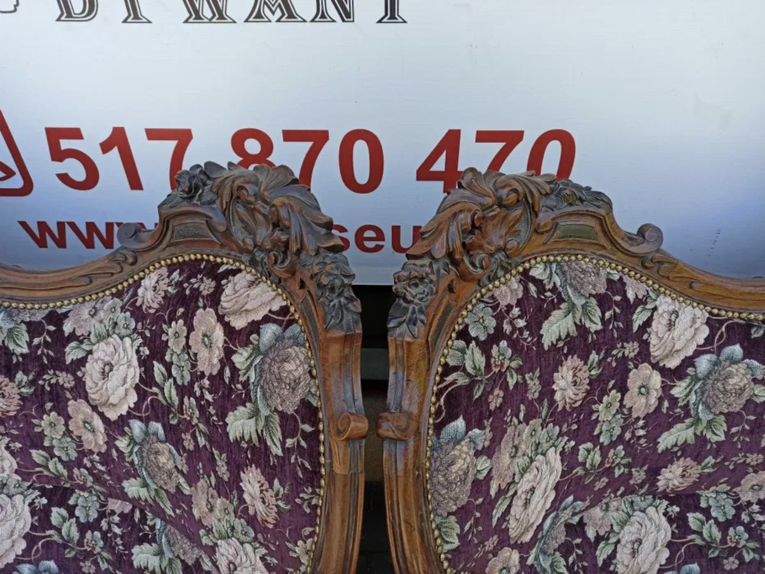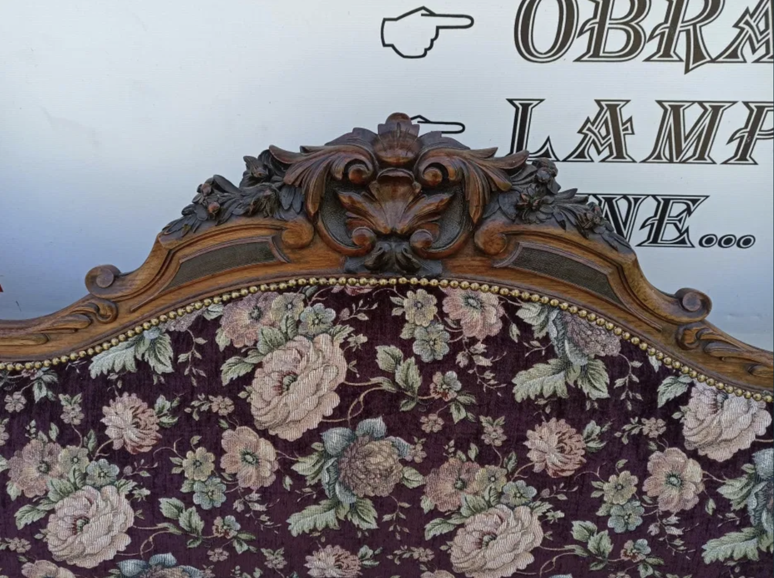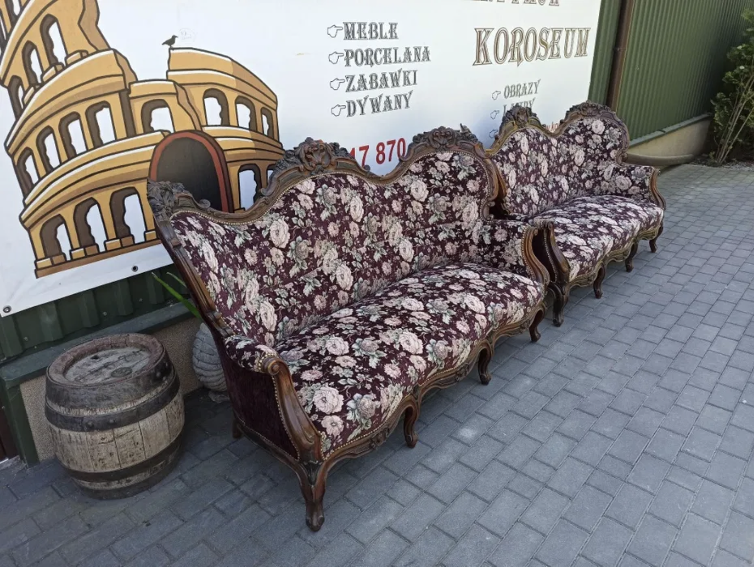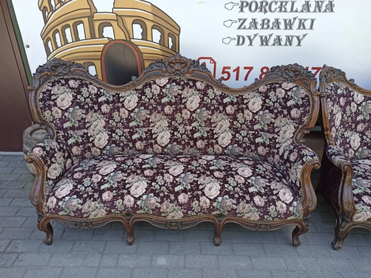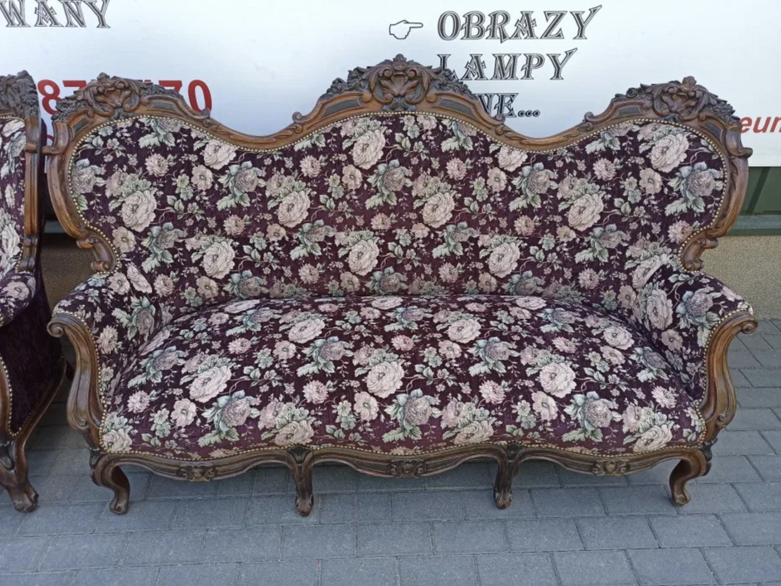 Przepiękna kanapa. Mebel zdobiony gustownymi rzeźbieniami i śliczną, nową tapicerką w róże.