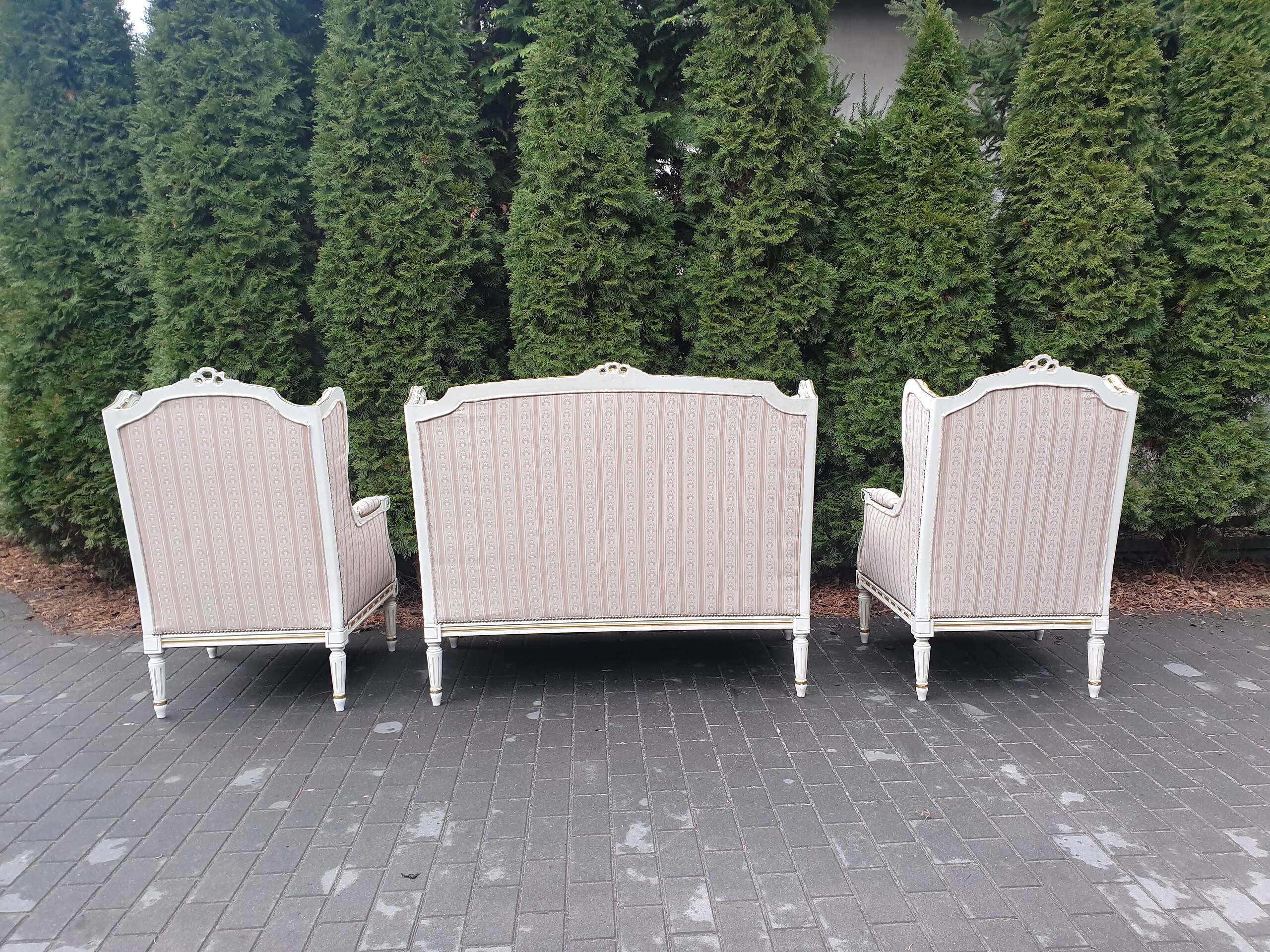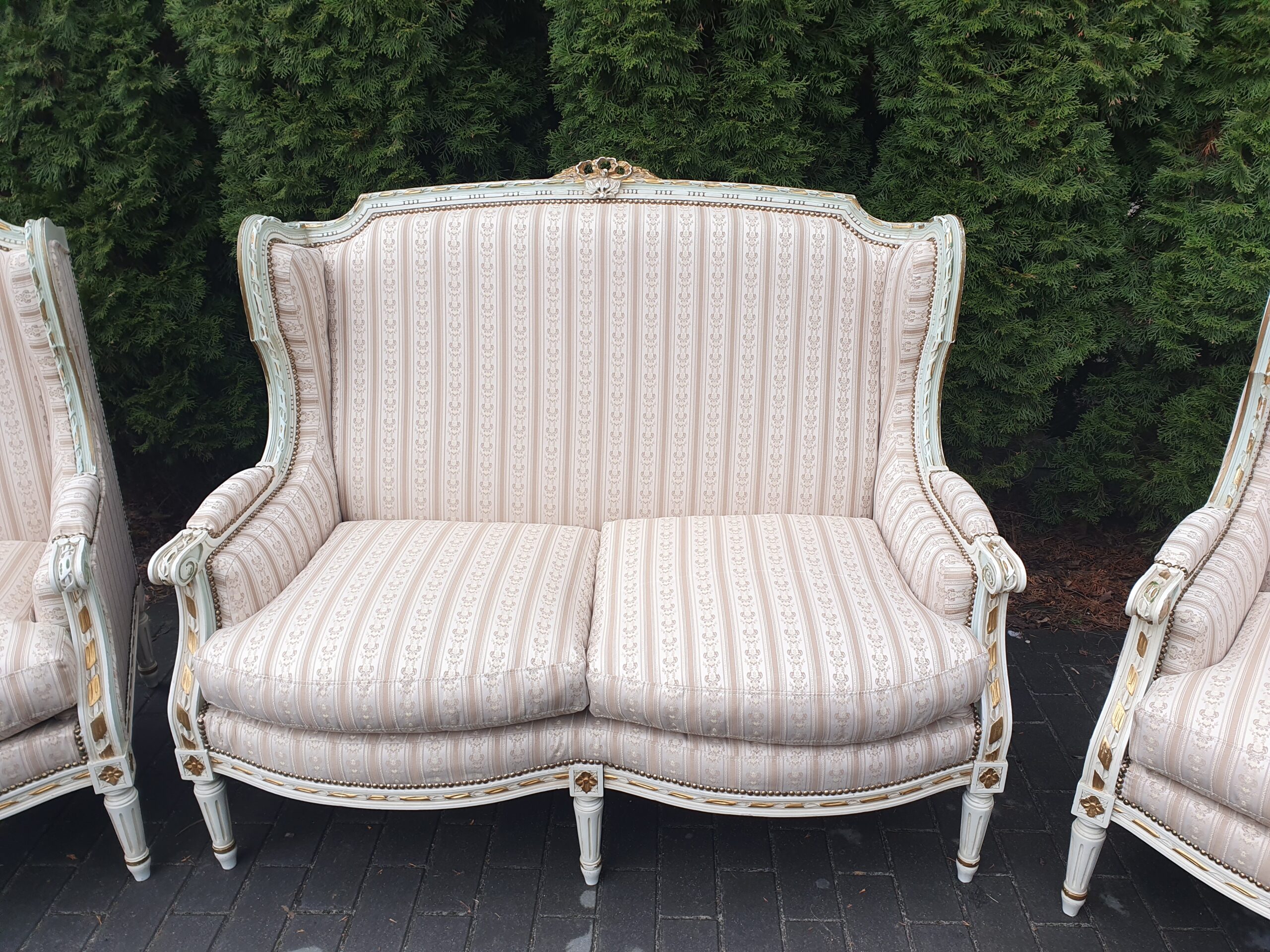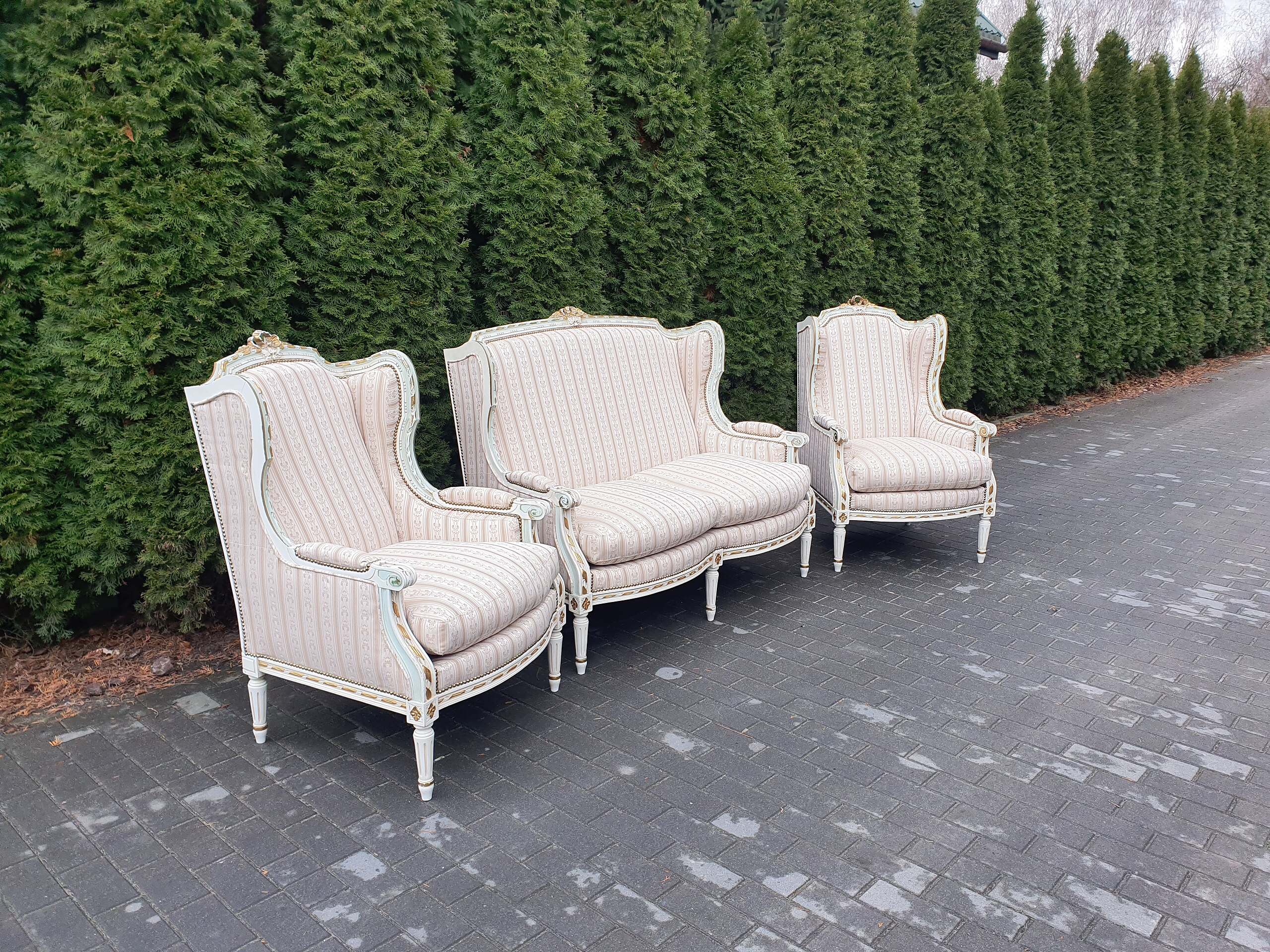 Śliczny zestaw: kanapa plus dwa fotele. Komplet posiada nową żakardową tapicerką.
