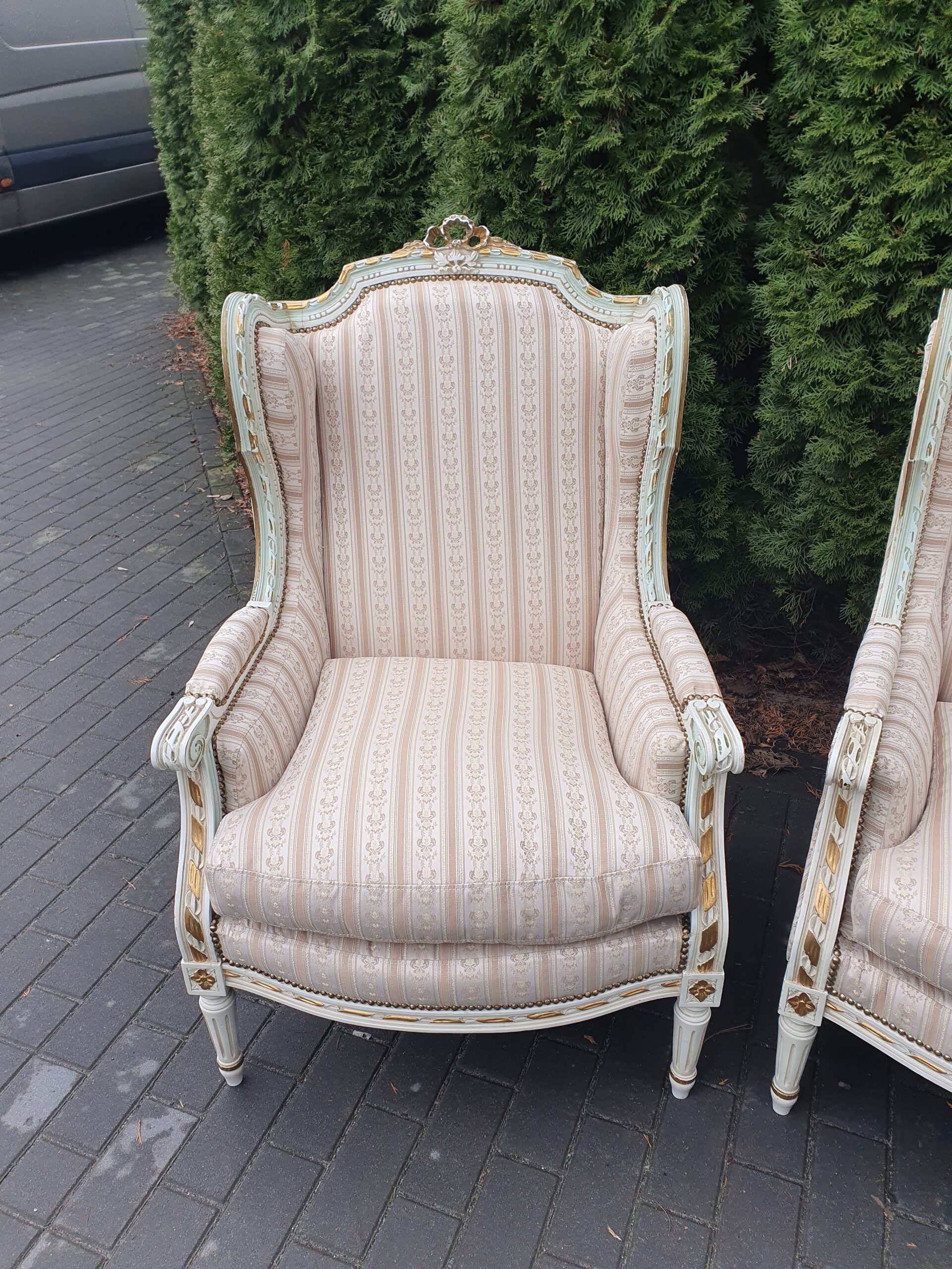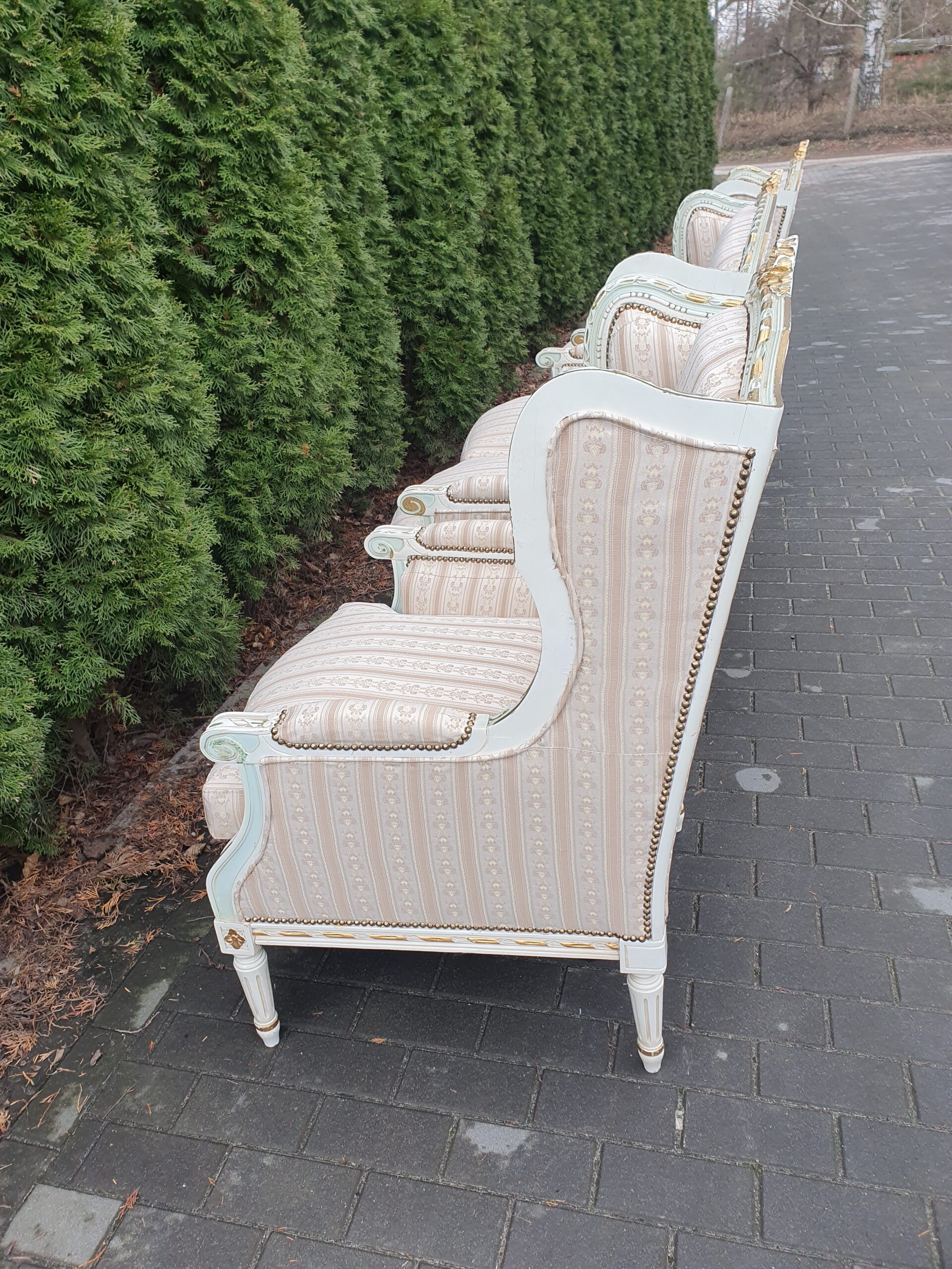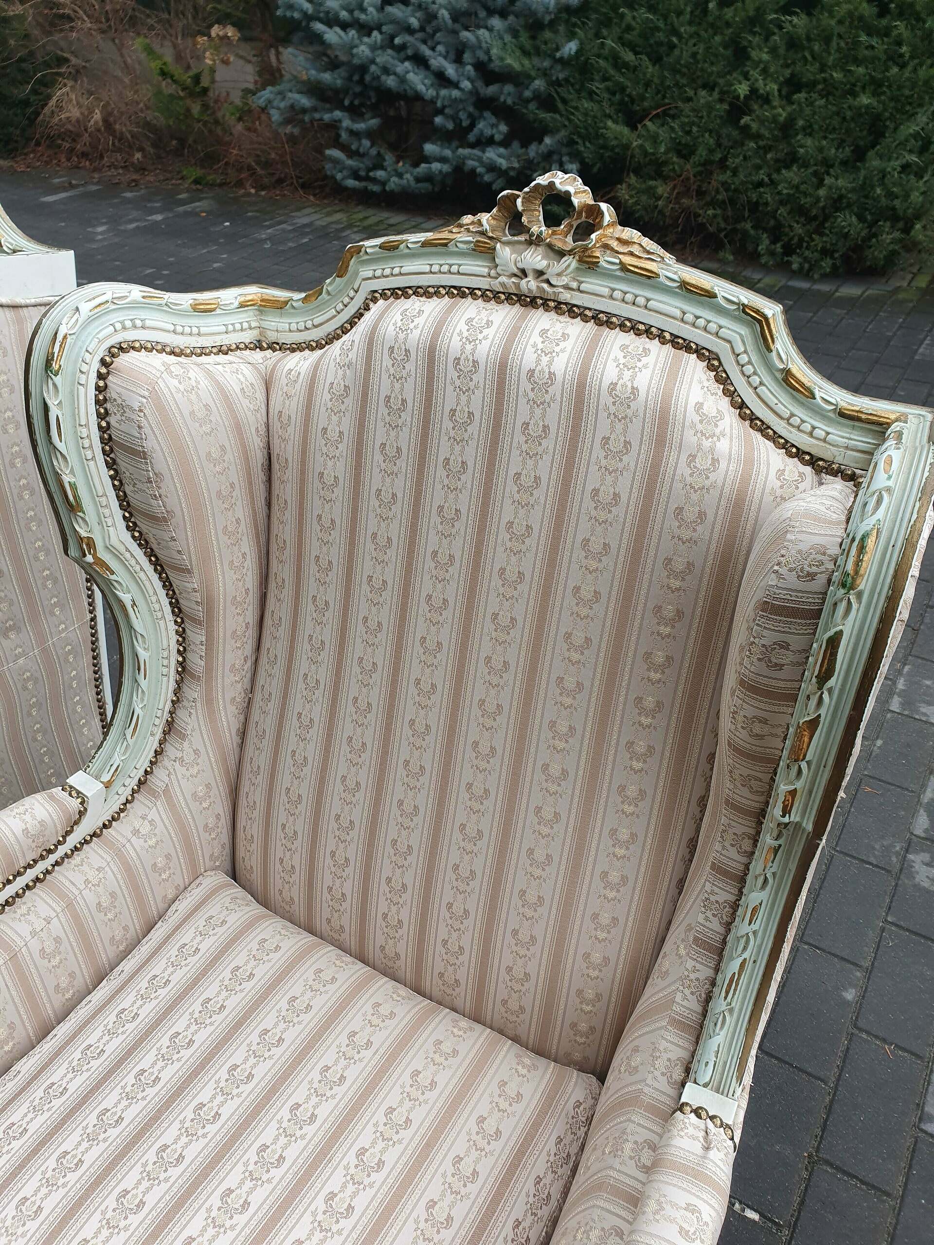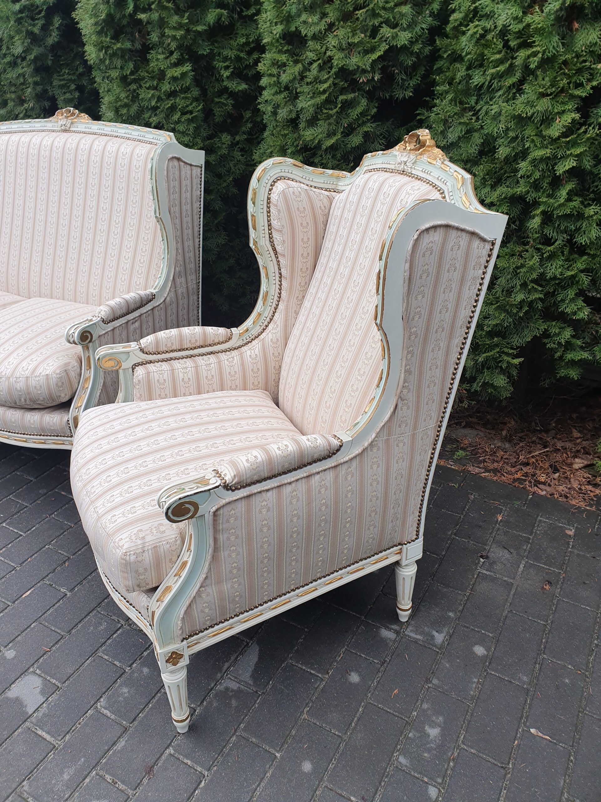 Śliczny zestaw: kanapa plus dwa fotele. Komplet posiada nową żakardową tapicerką.