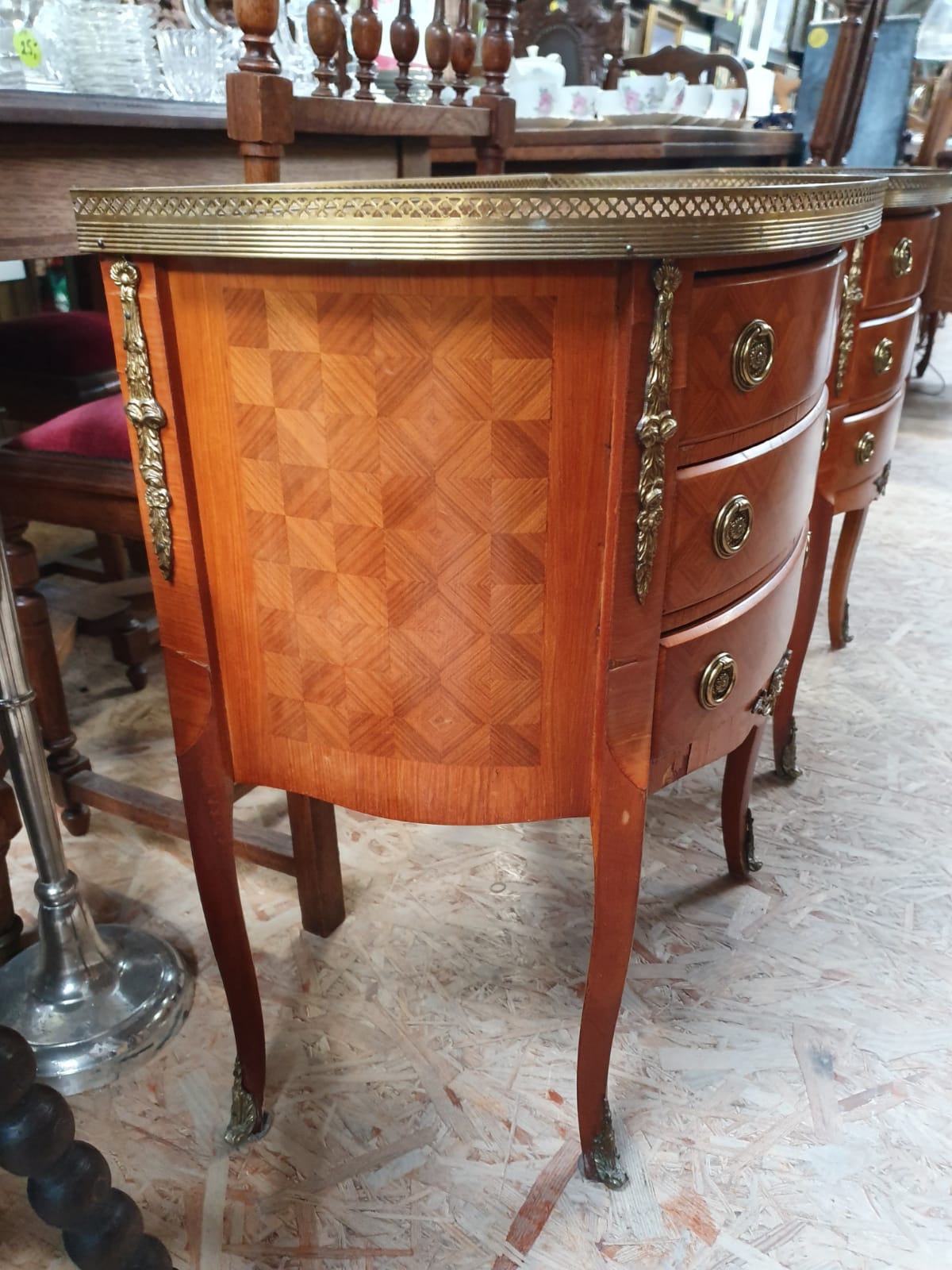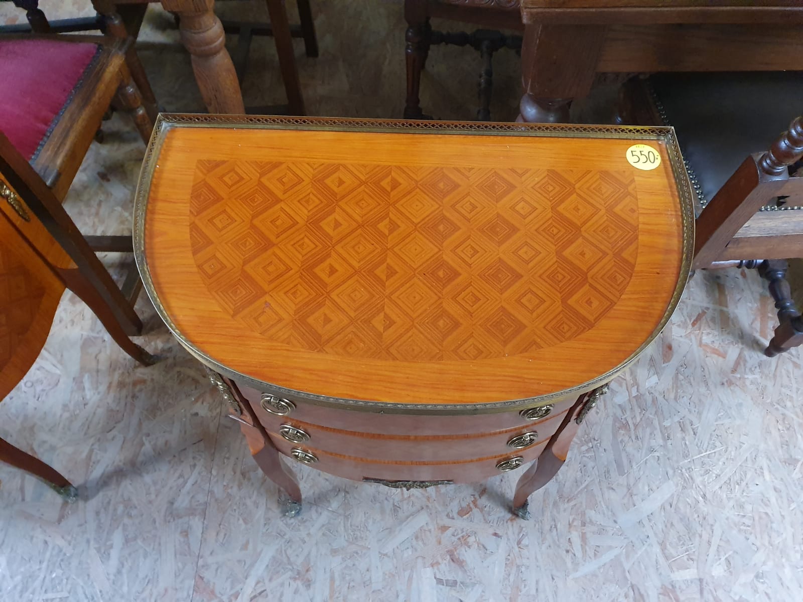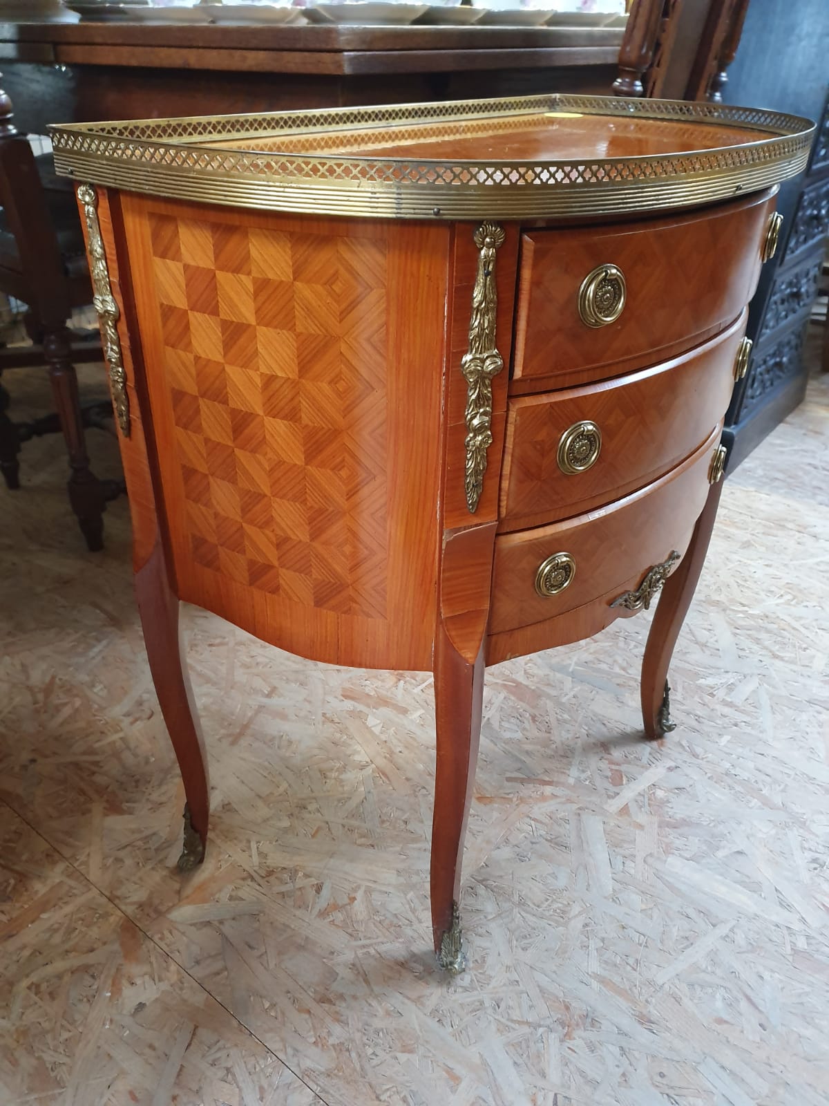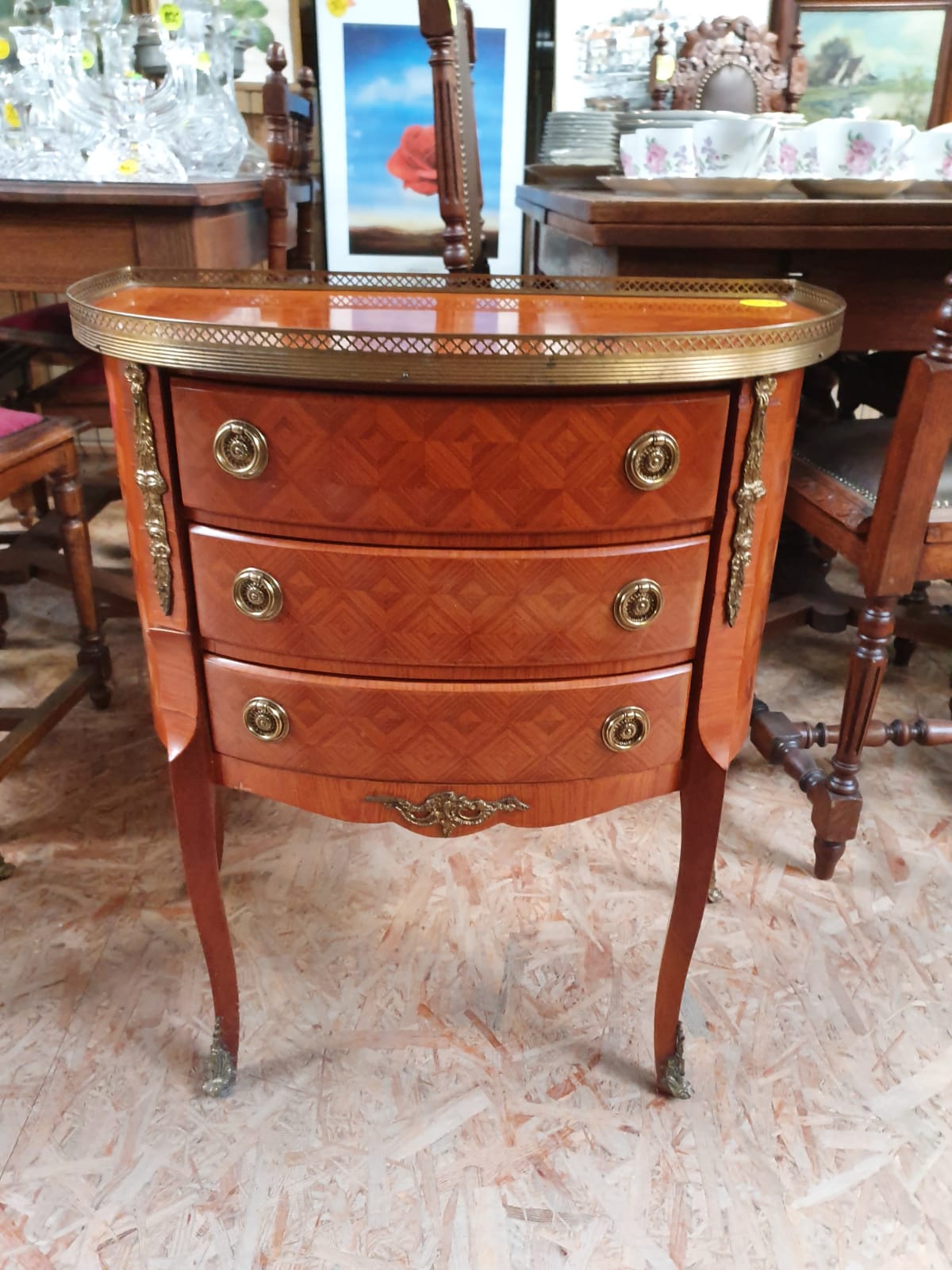 Niewielka komódka zdobiona intarsjami i mosiężnymi okuciami.