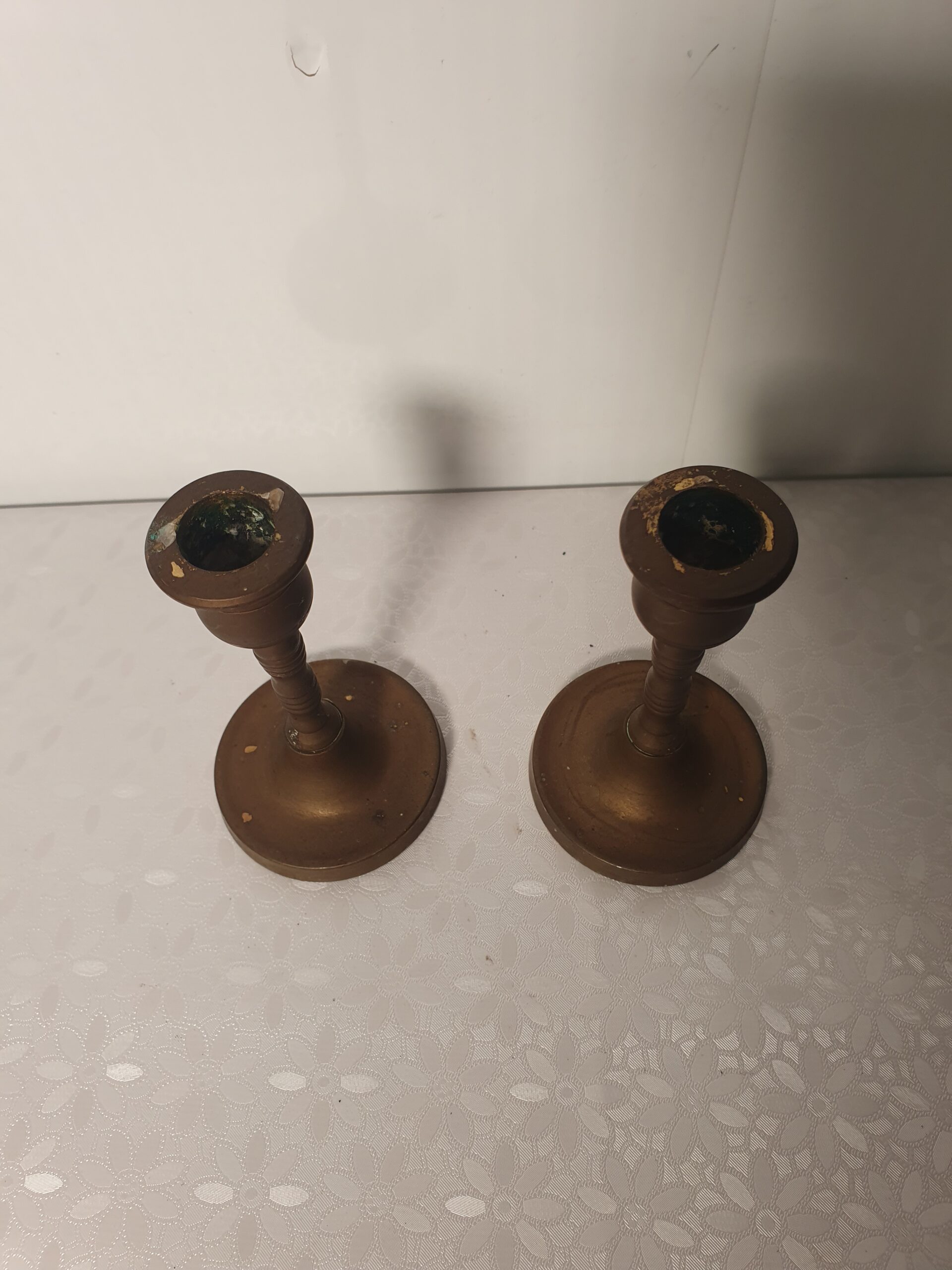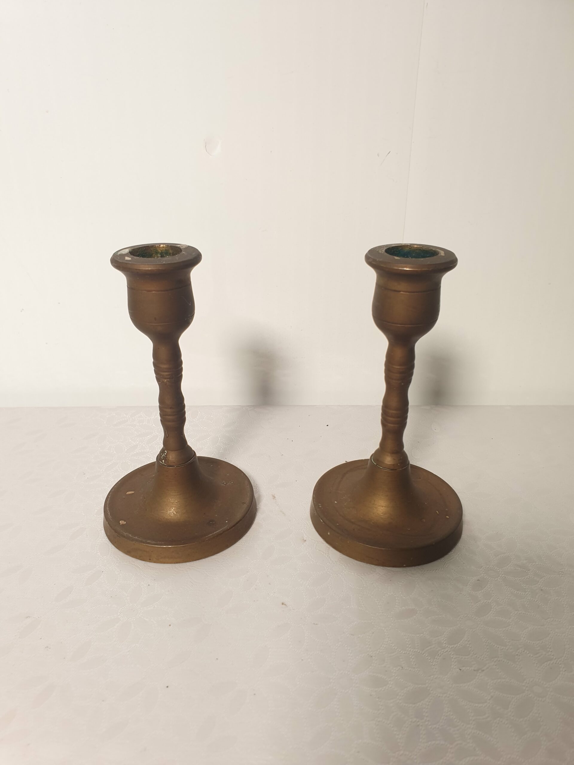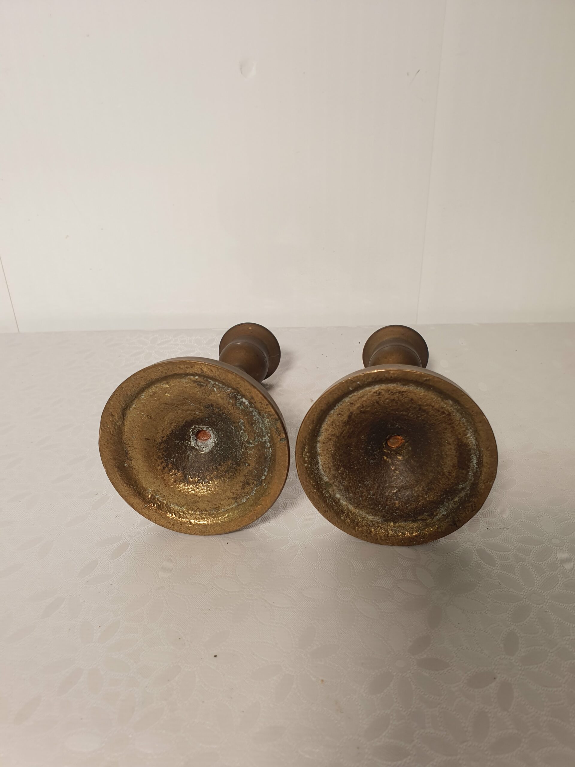 Komplet niewielkich świeczników wykonanych z pełnego mosiądzu. Zestaw zawiera dwie sztuki