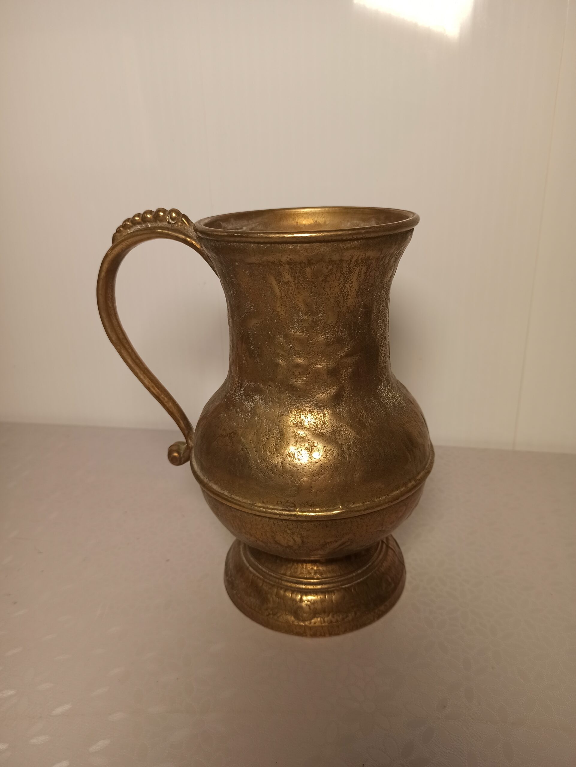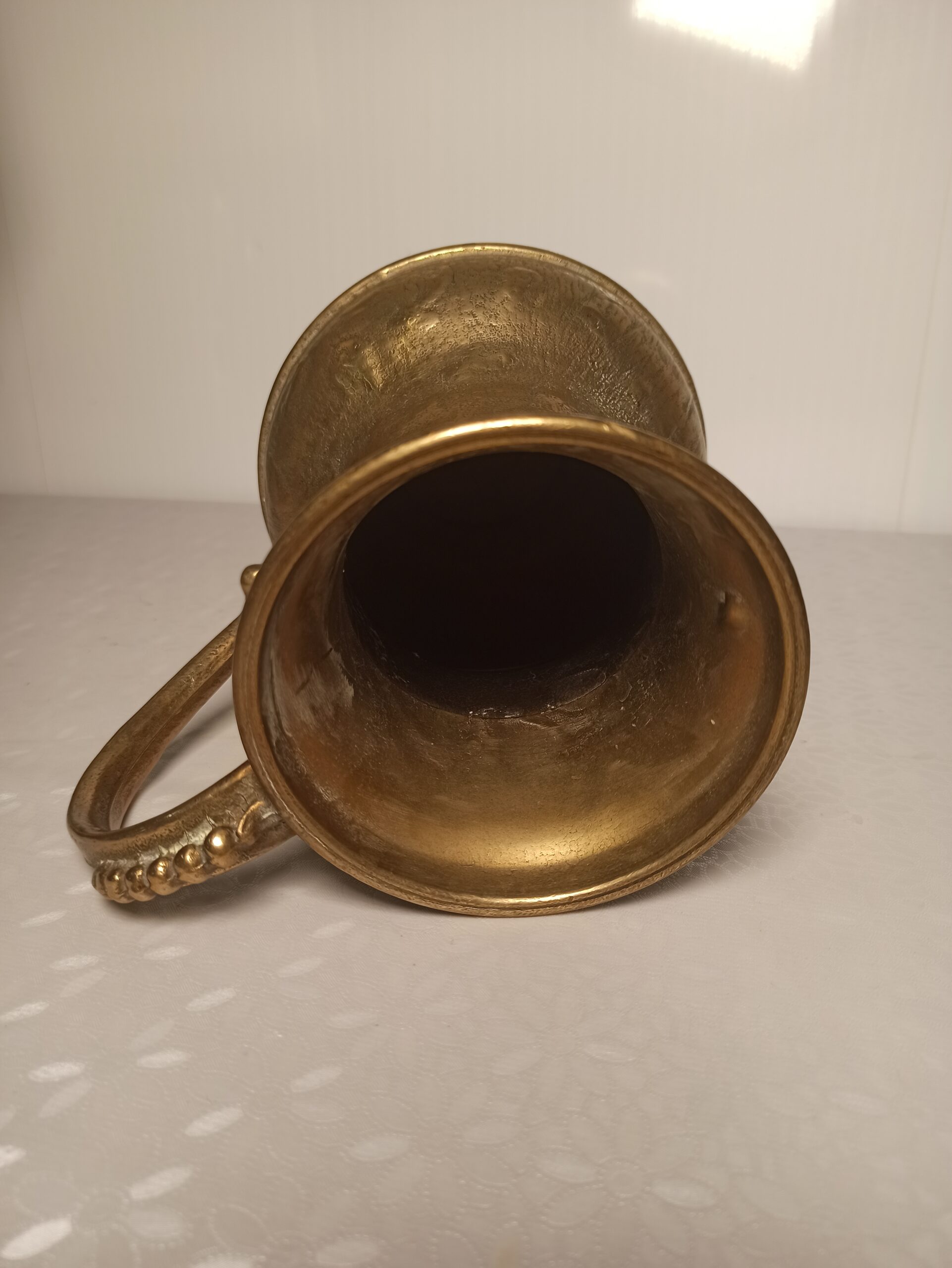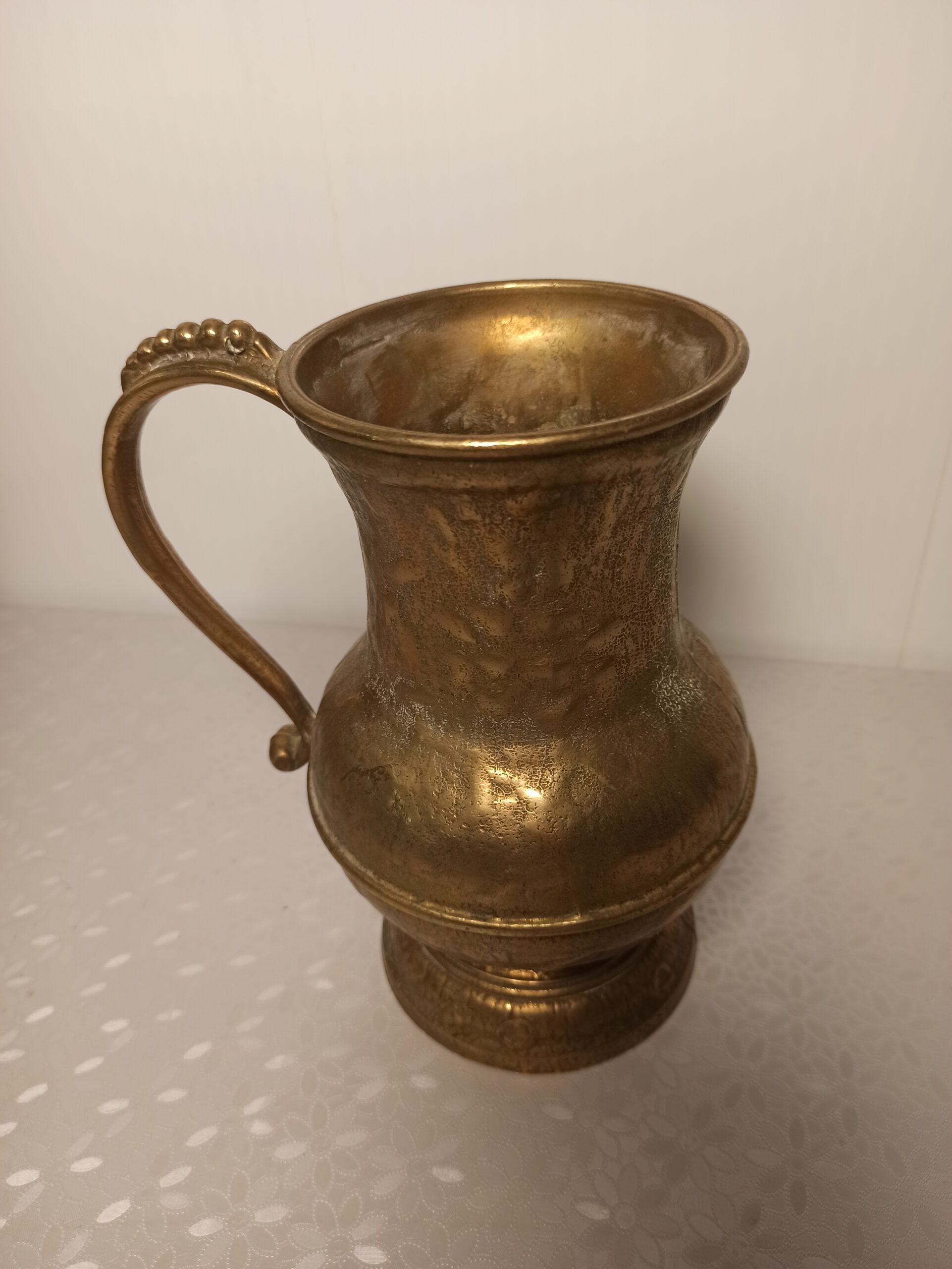 Solidny, ciężki dzbanek wykonany z mosiądzu. Pod spodem znajdujemy wybitą puncę.