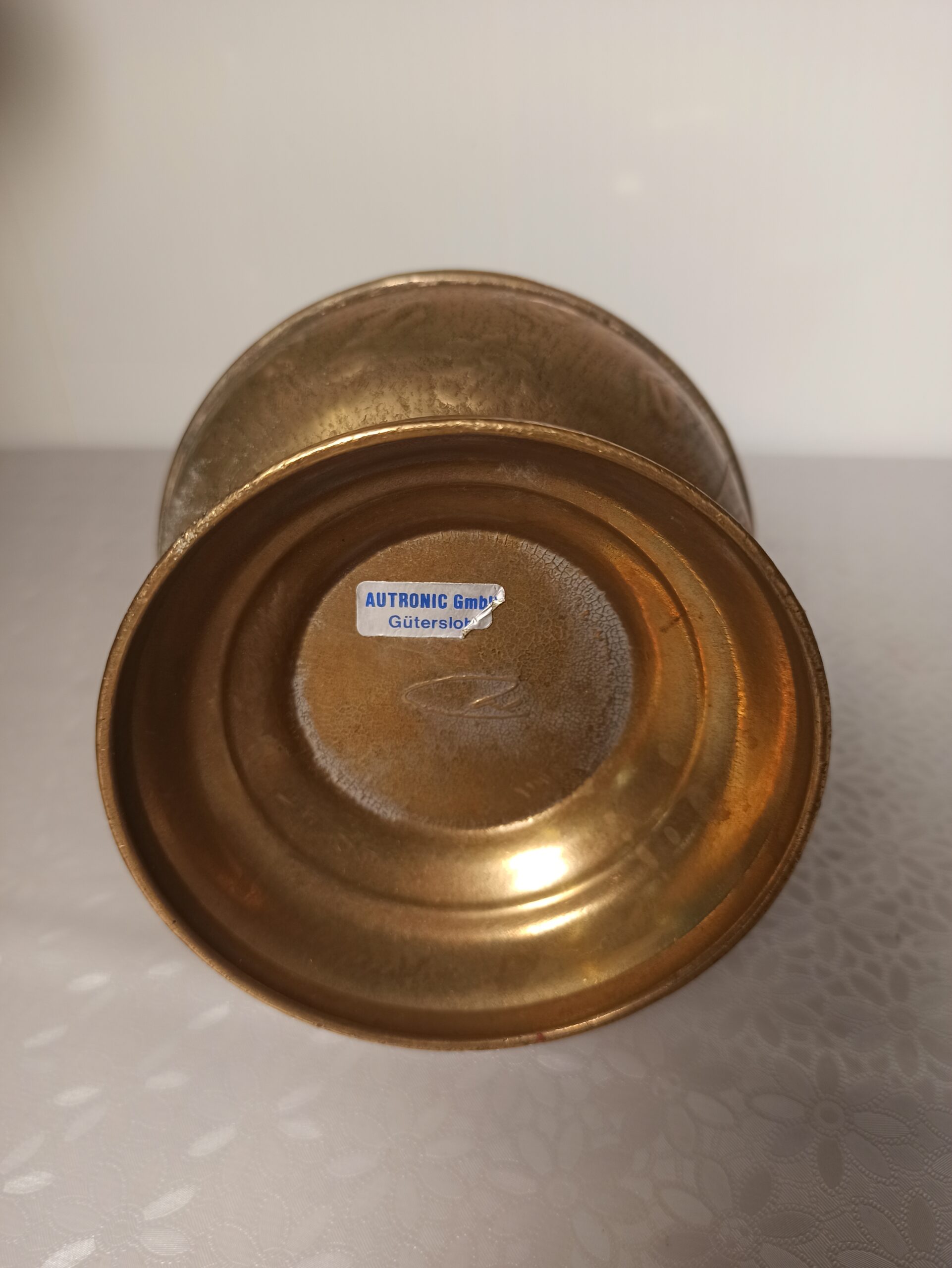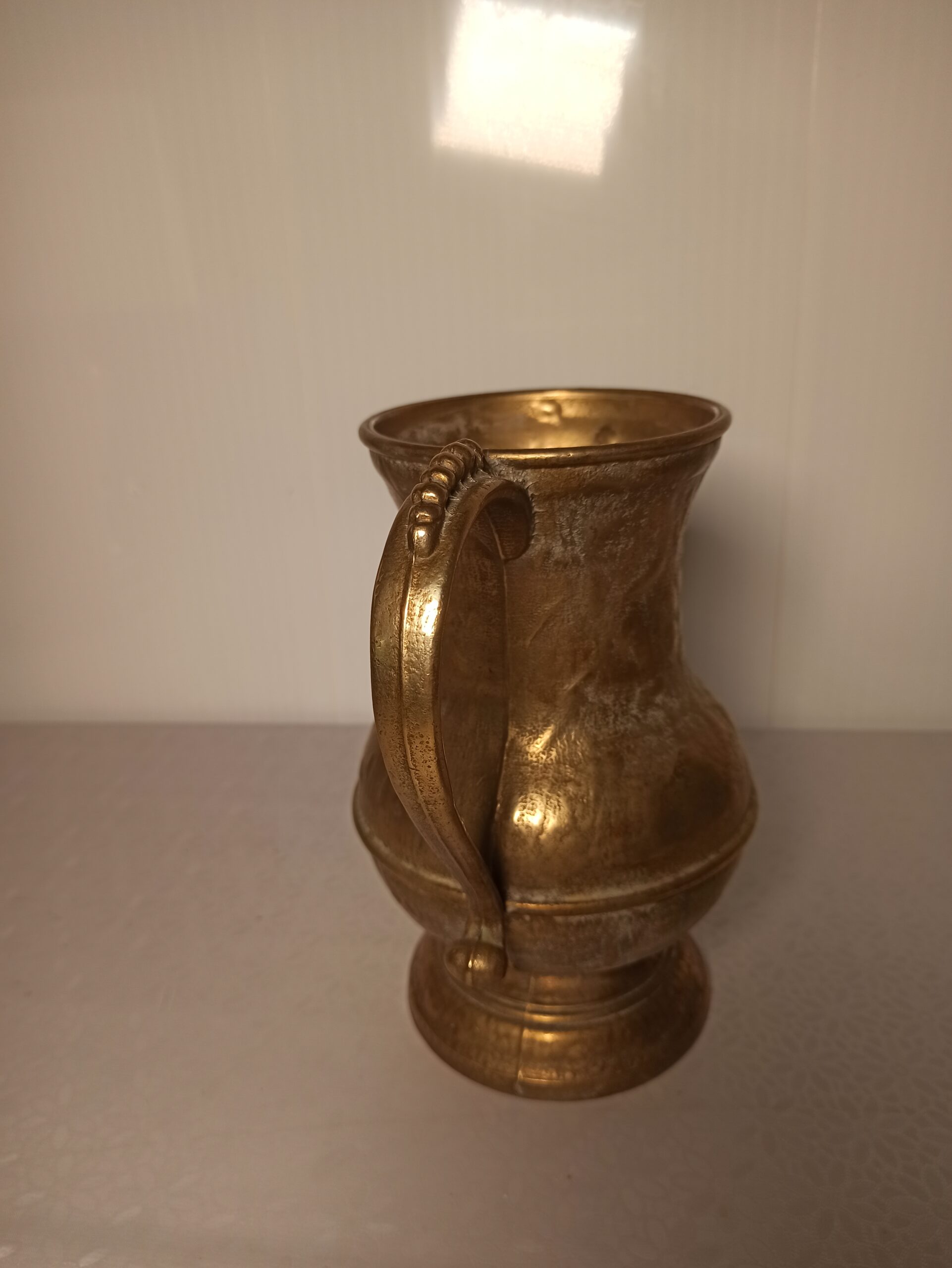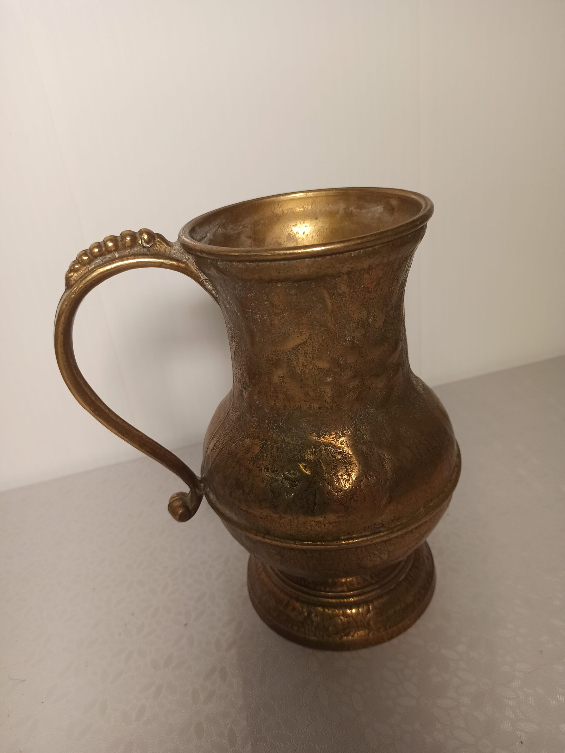 Solidny, ciężki dzbanek wykonany z mosiądzu. Pod spodem znajdujemy wybitą puncę.