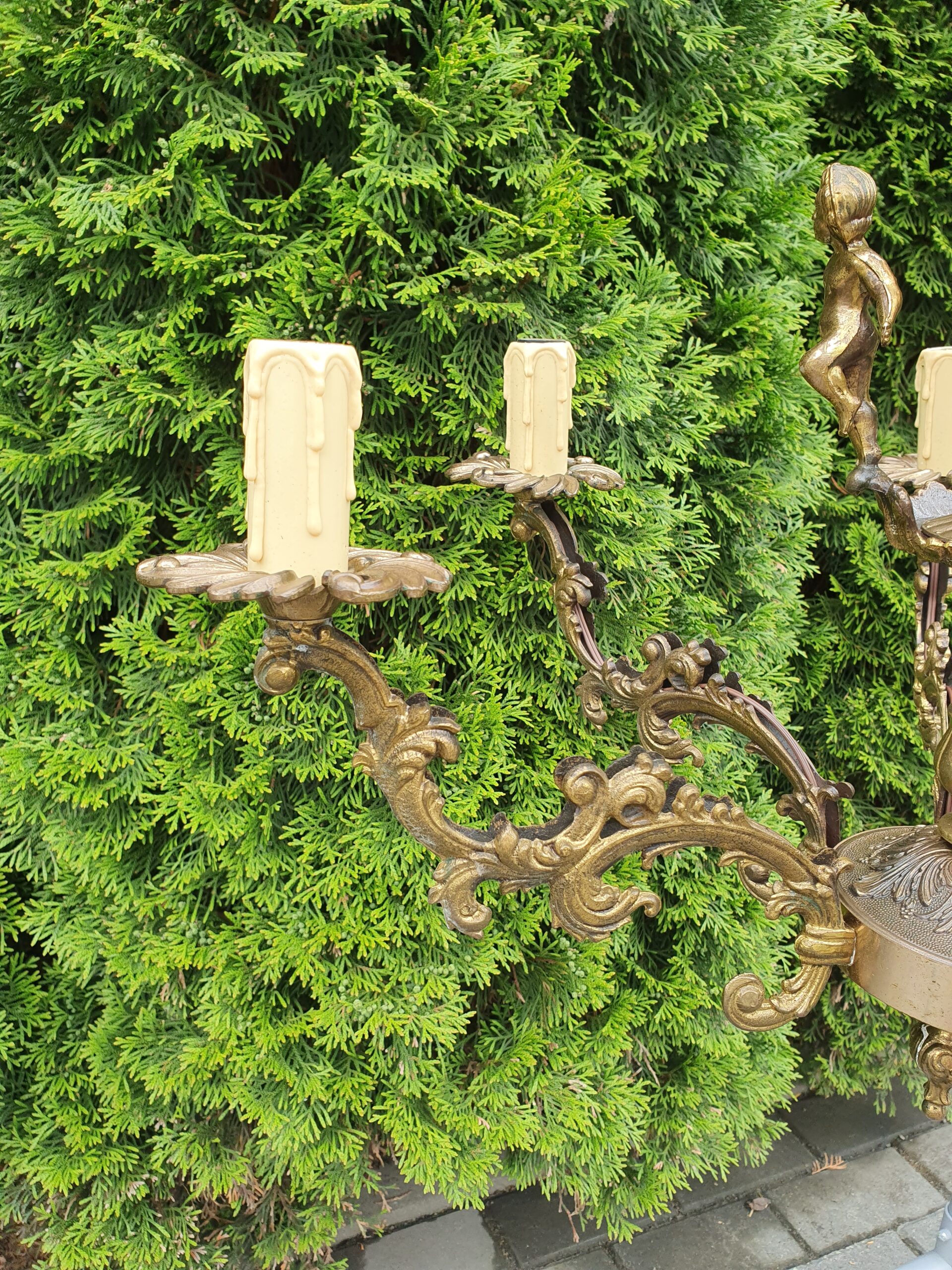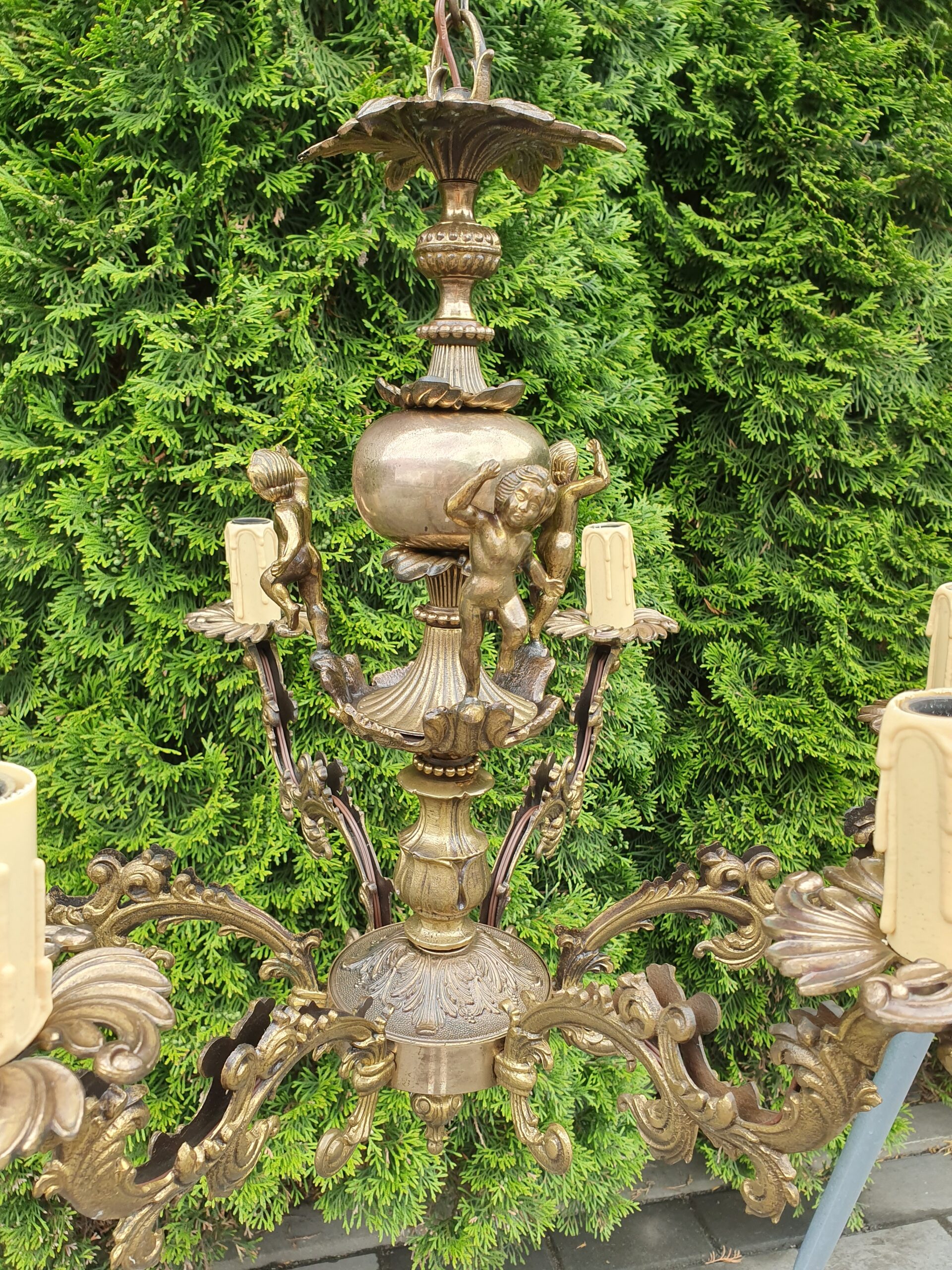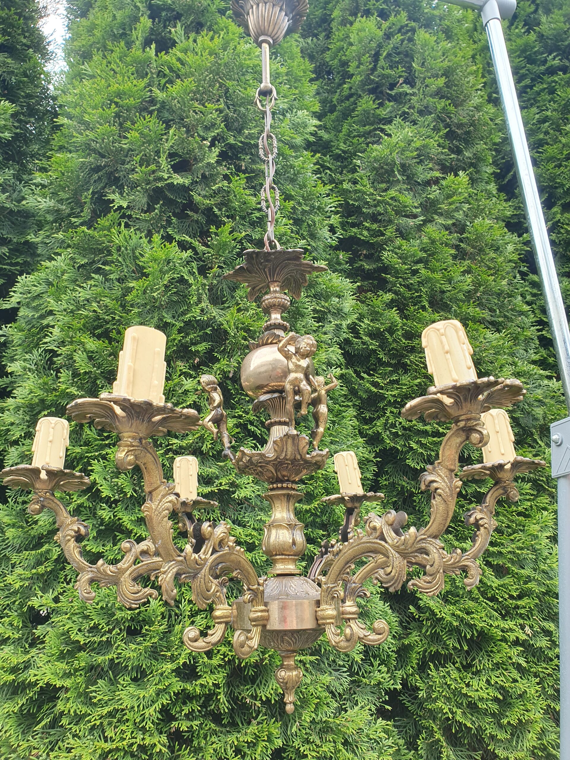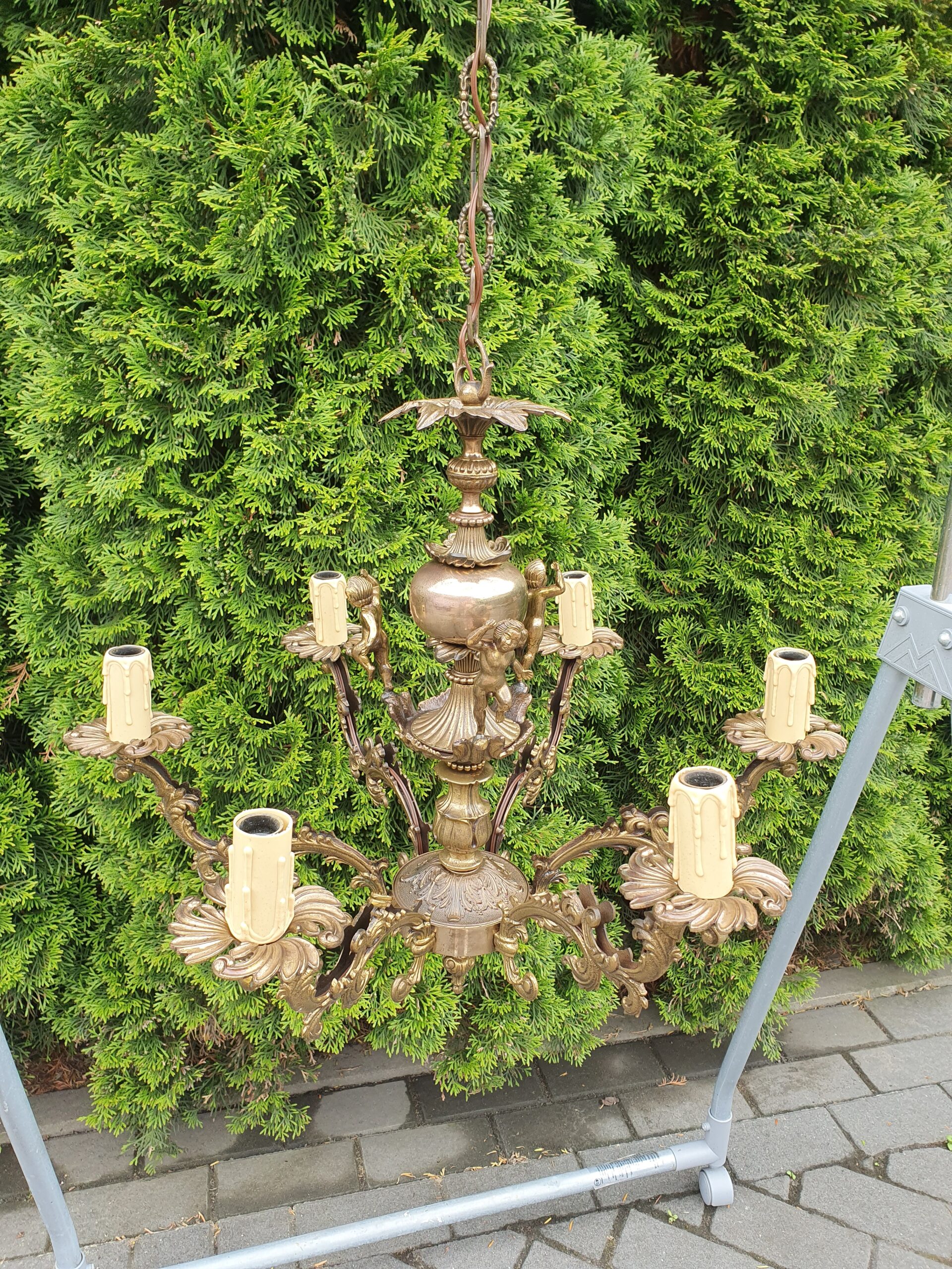 Stary, mosiężny żyrandol z 6 żarówkami na mały gwint. Przedmiot doskonale się prezentuje.