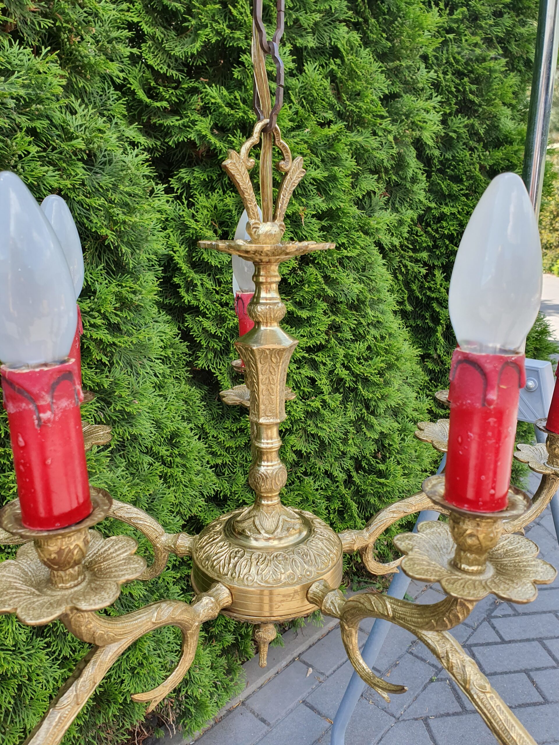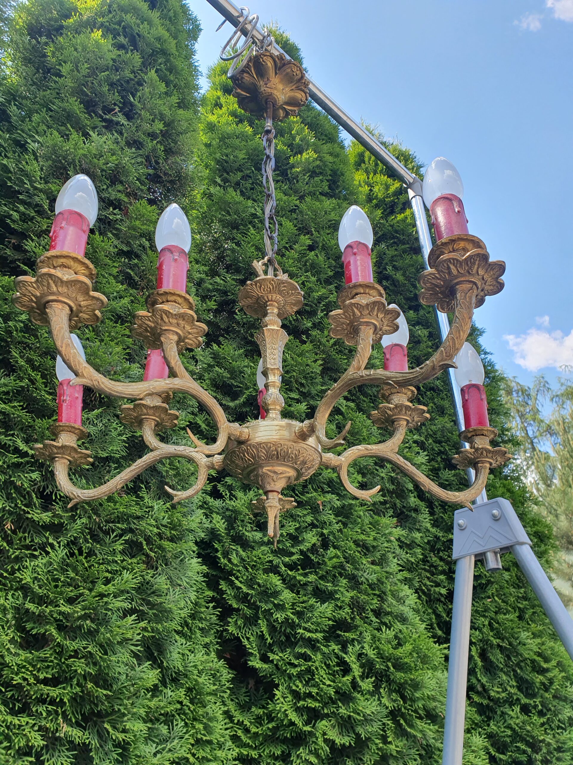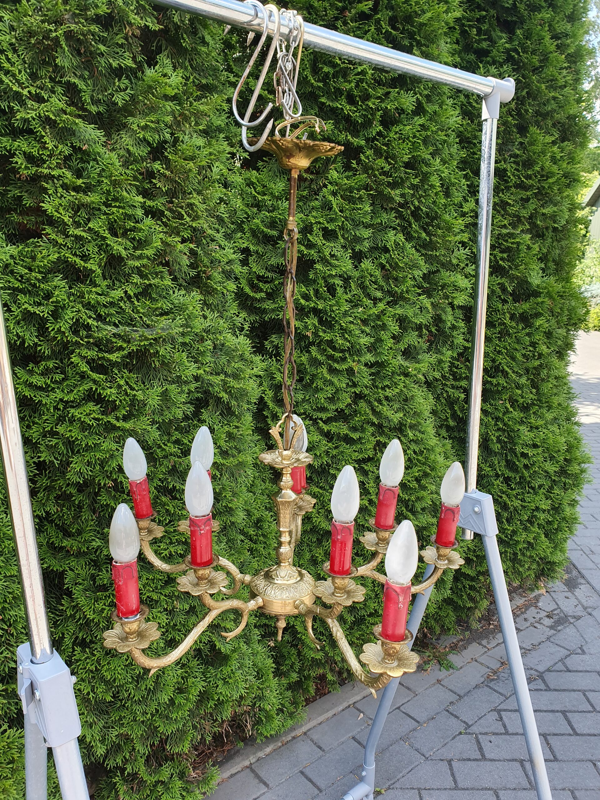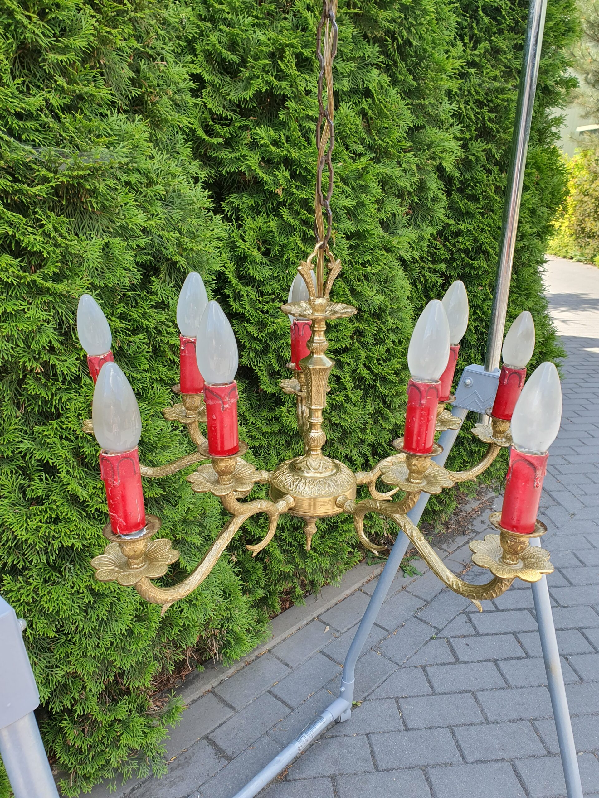 Ciekawy mosiężny żyrandol na 10 żarówek z małym gwintem.