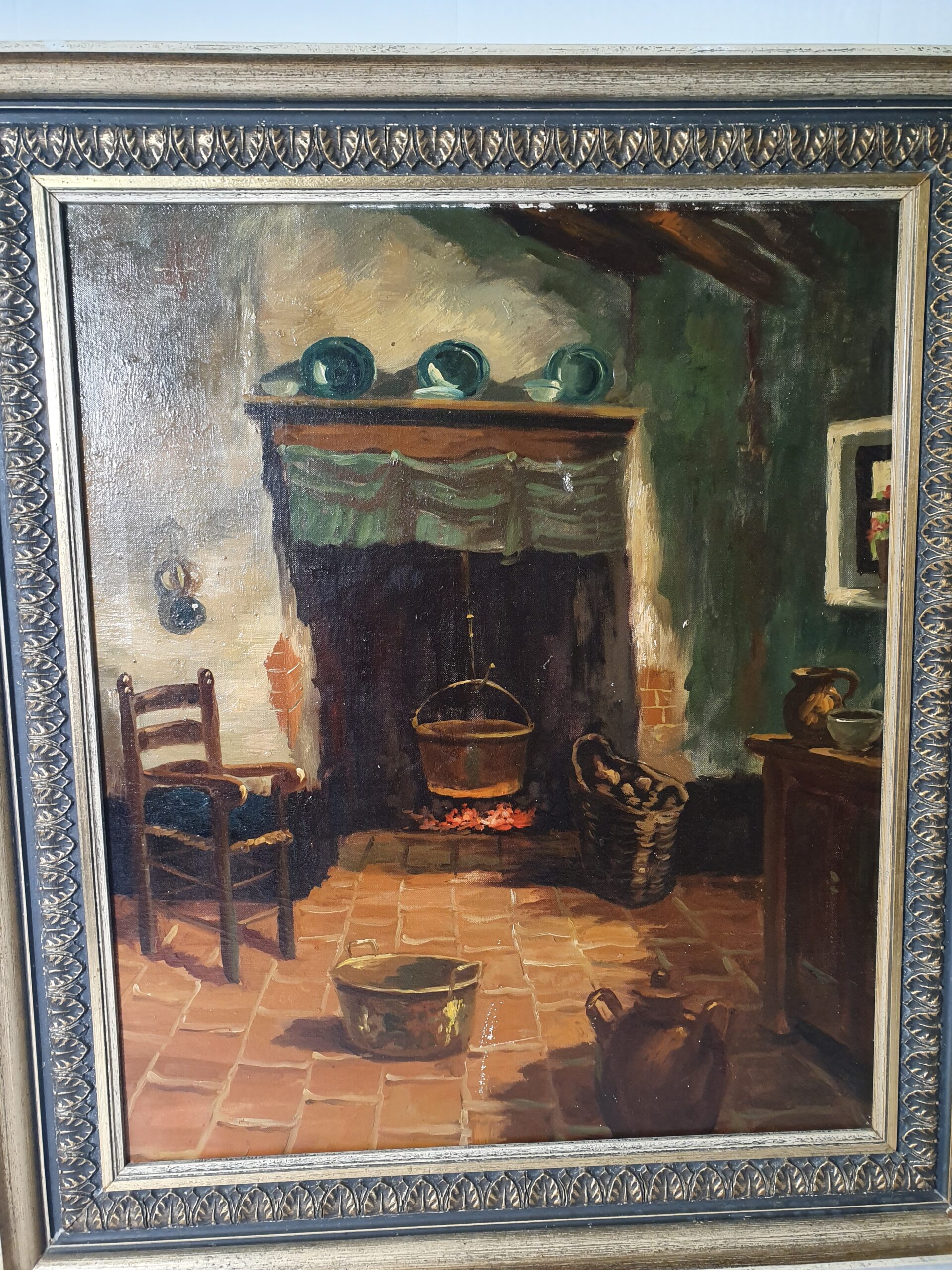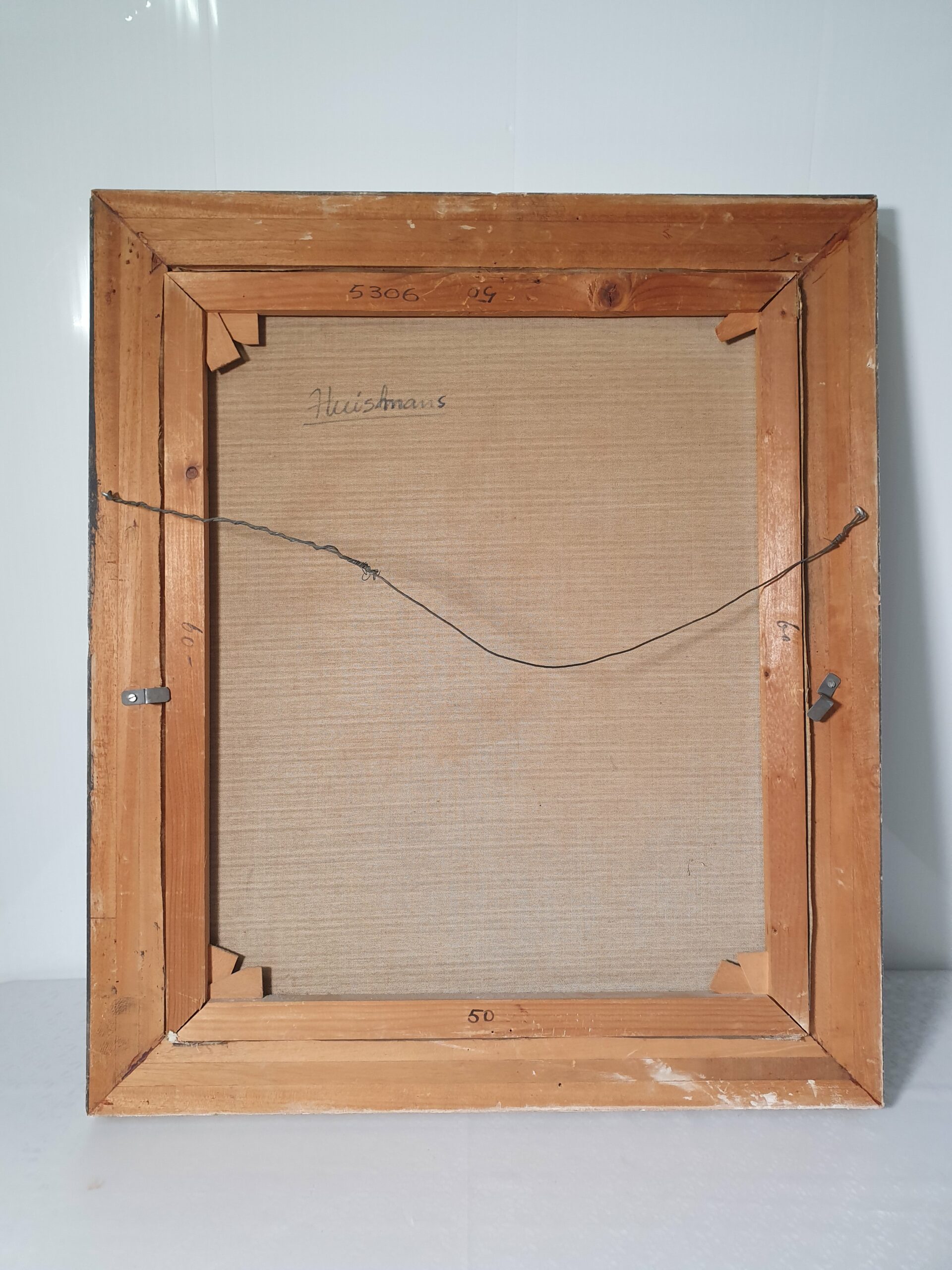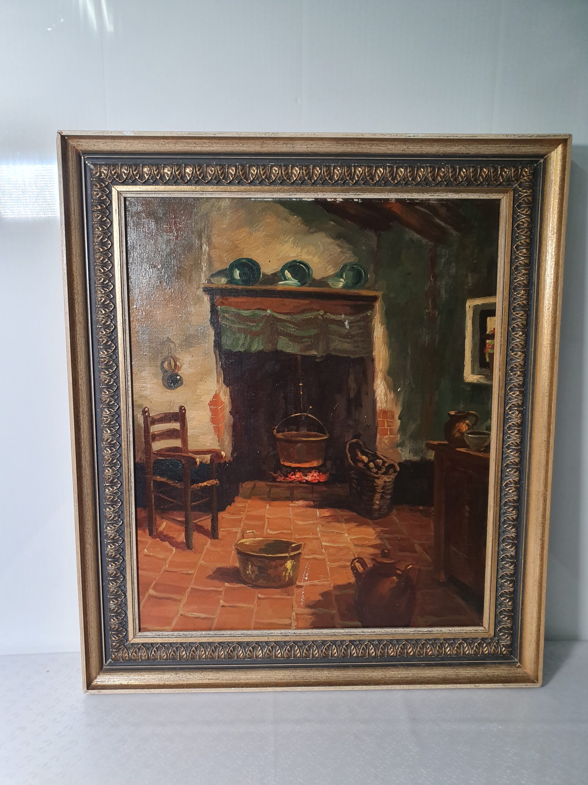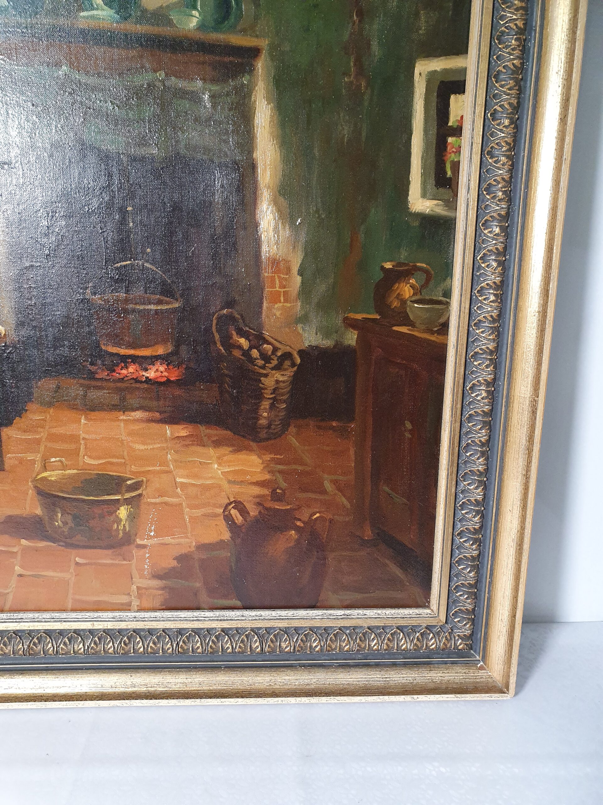 Obraz olejny malowany na płótnie. Malowidło oprawione w drewnianą ramę z gipsowymi zdobieniami.