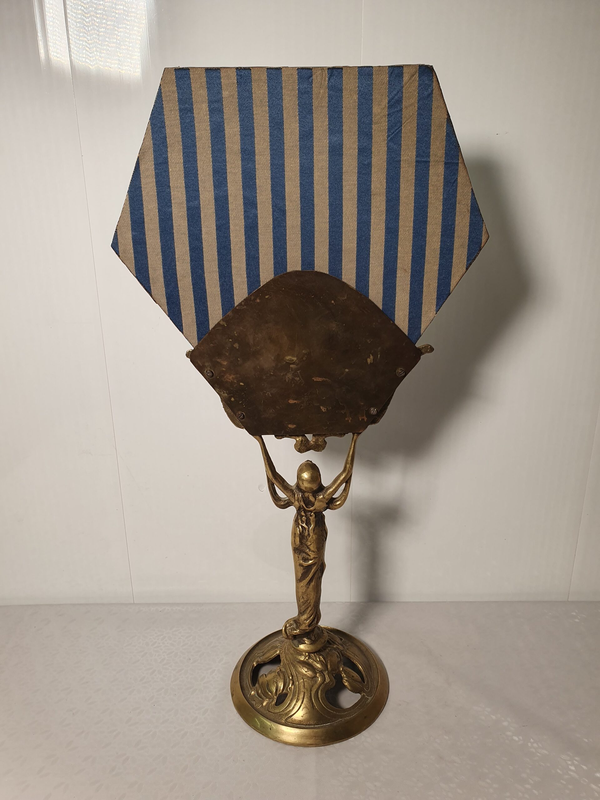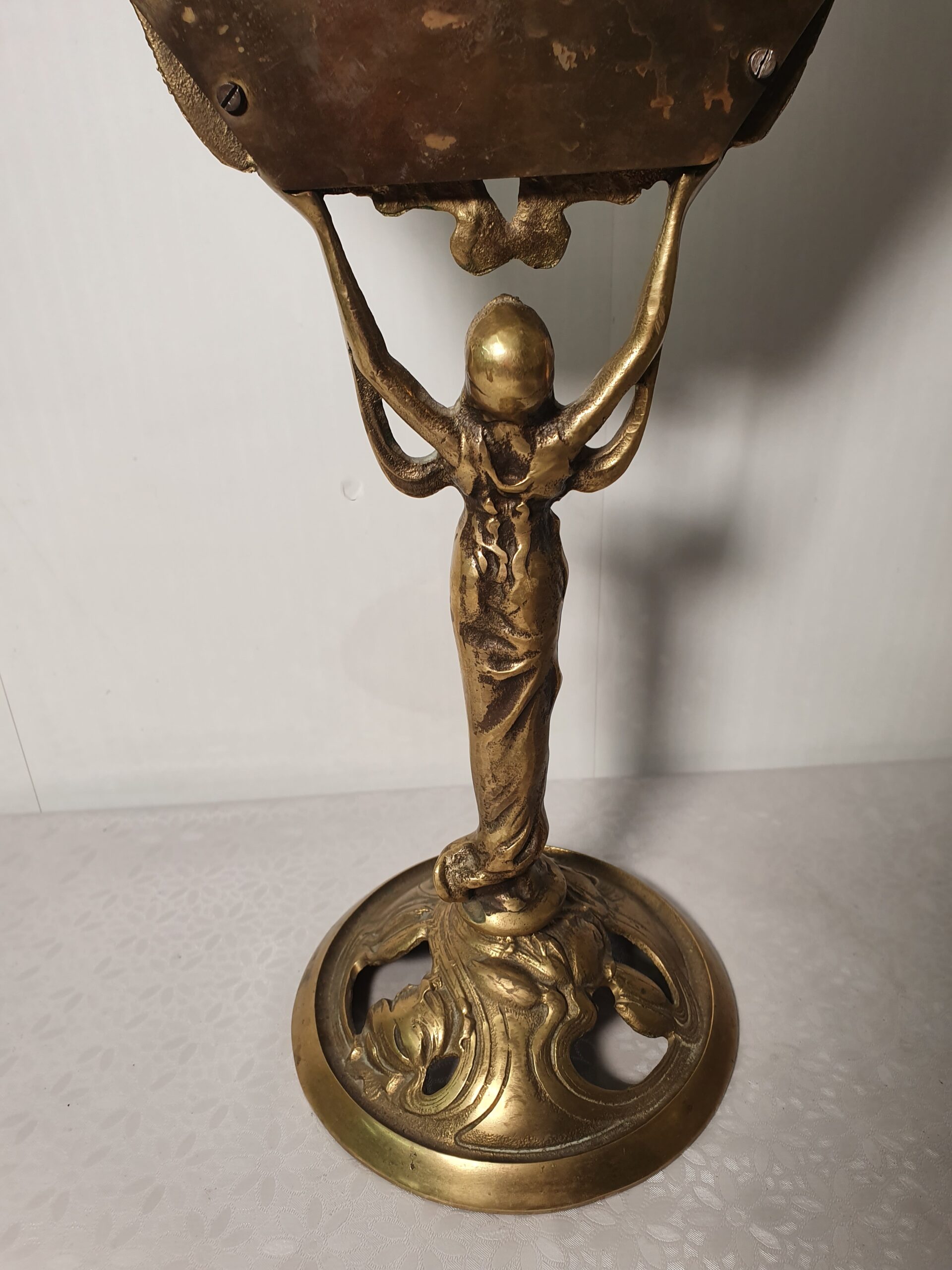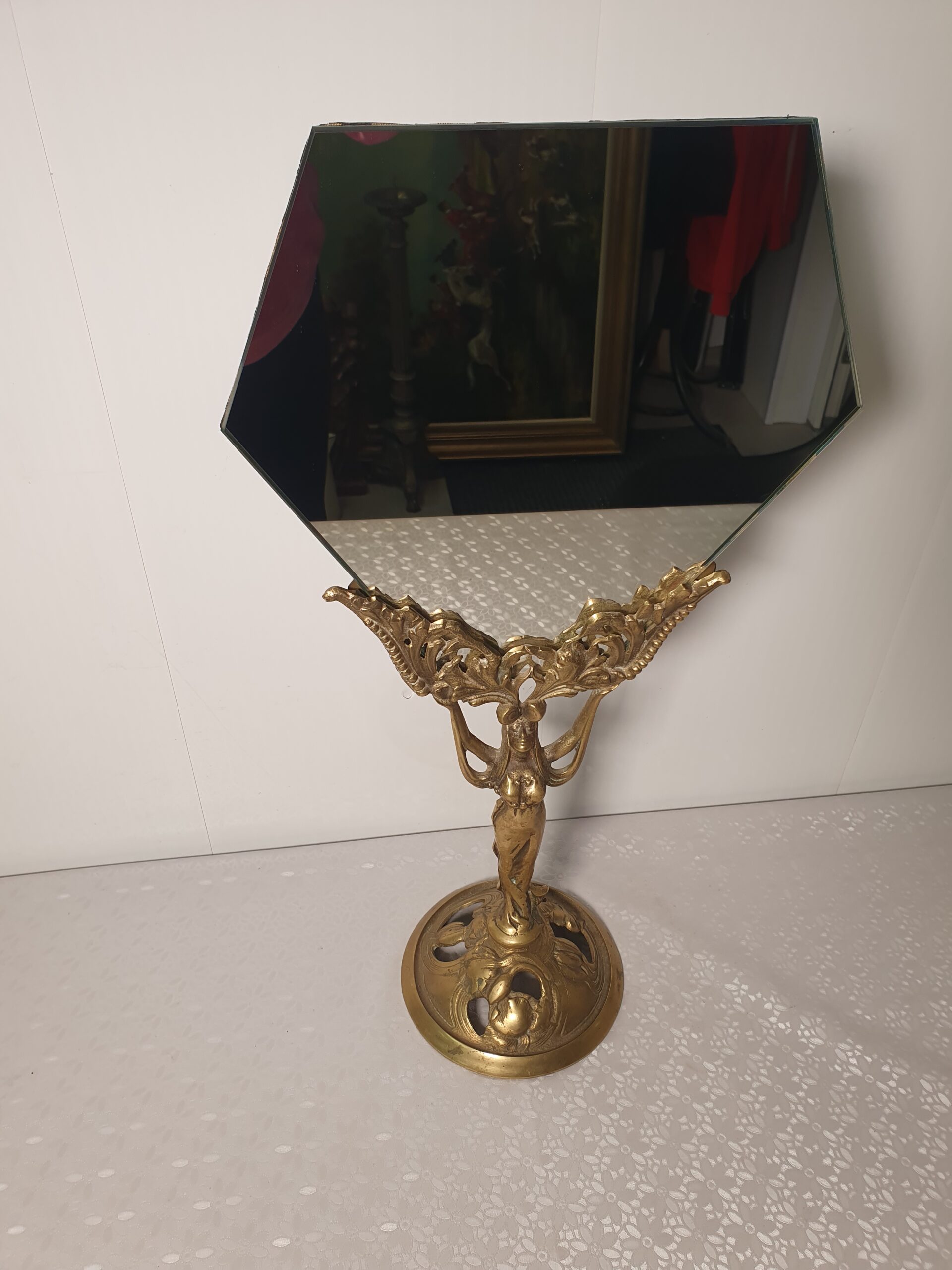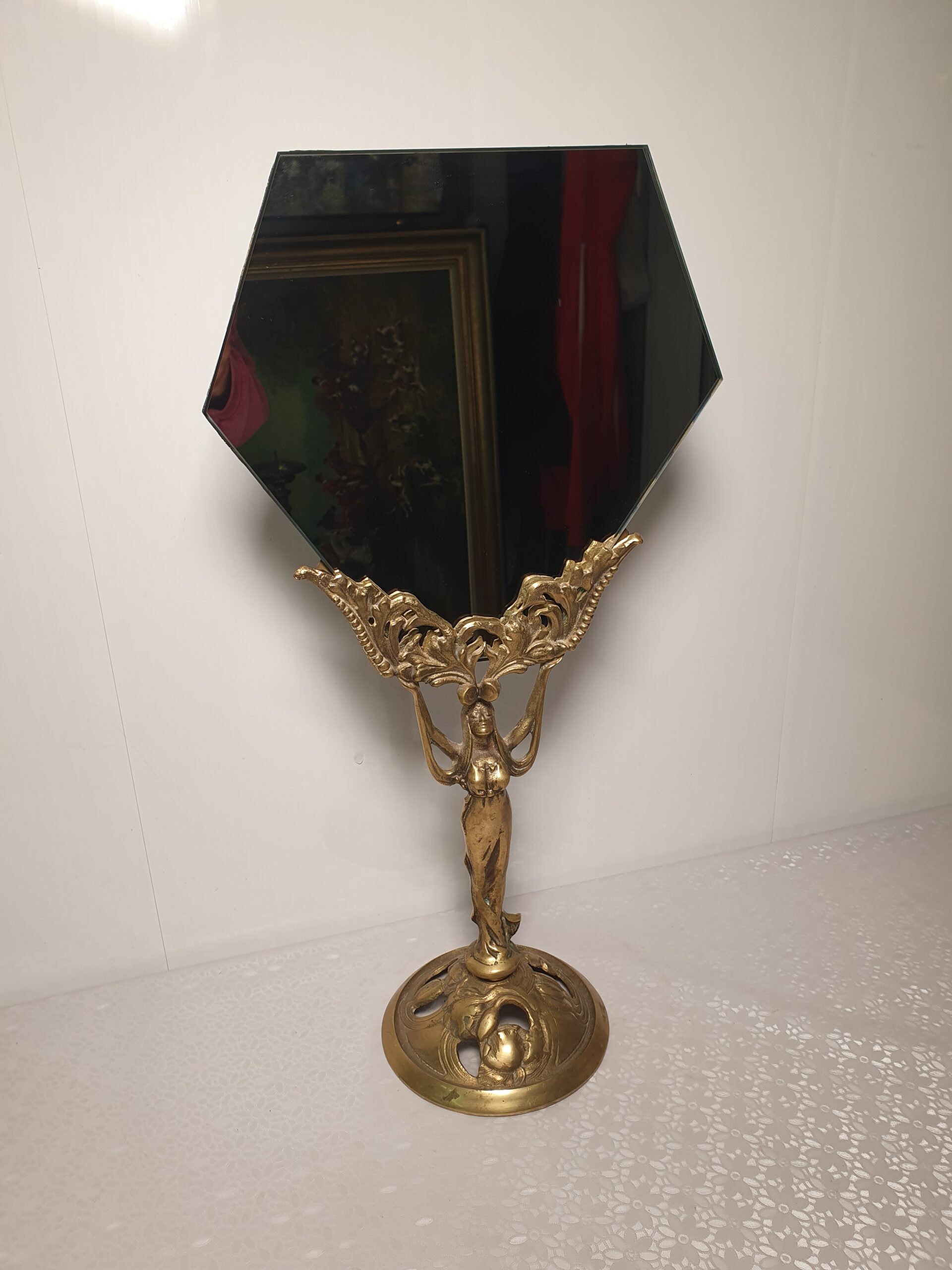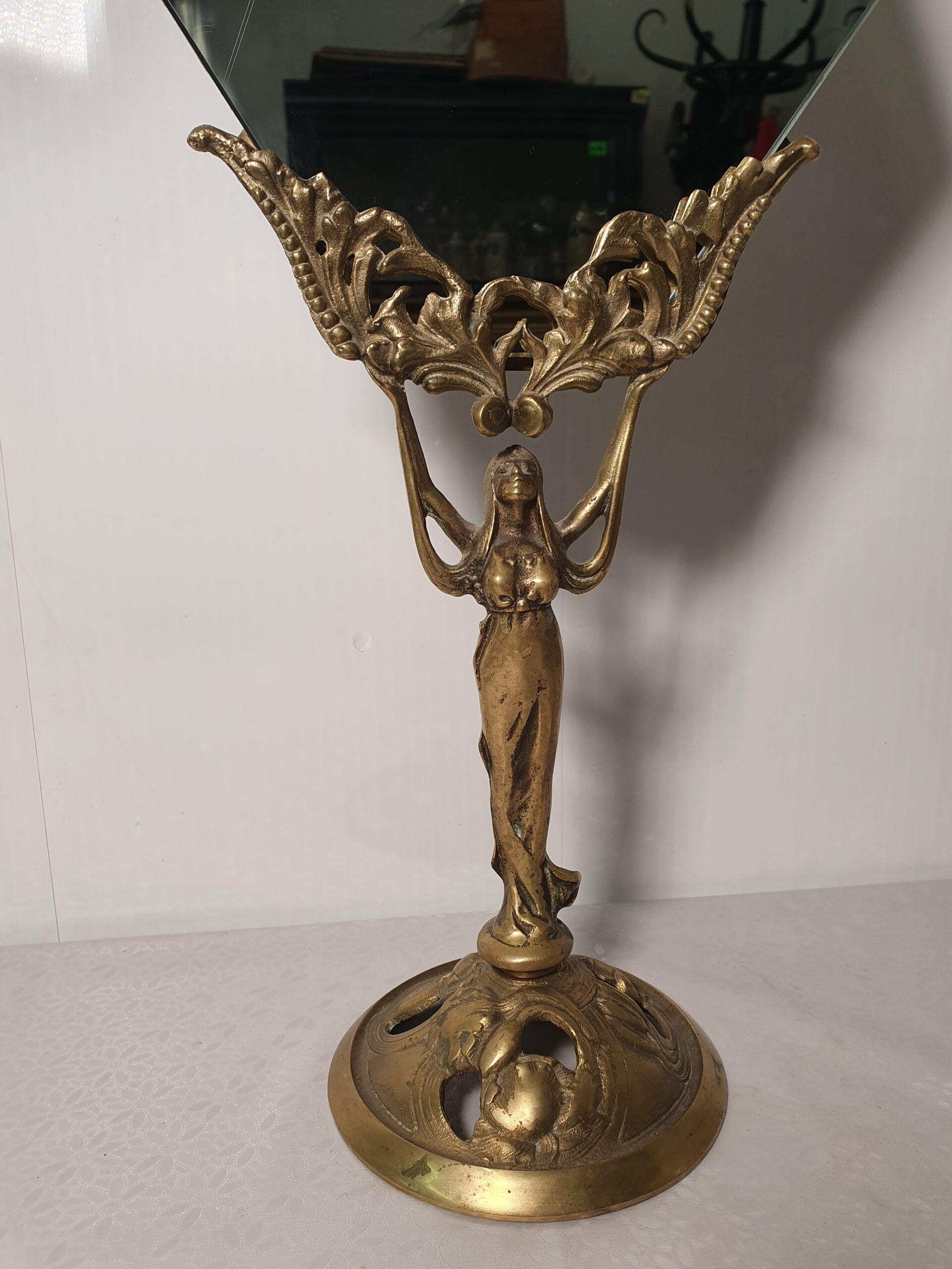 Piękne lusterko wykonane z mosiądzu. Tafla lustra trzymana jest przez kobietę.