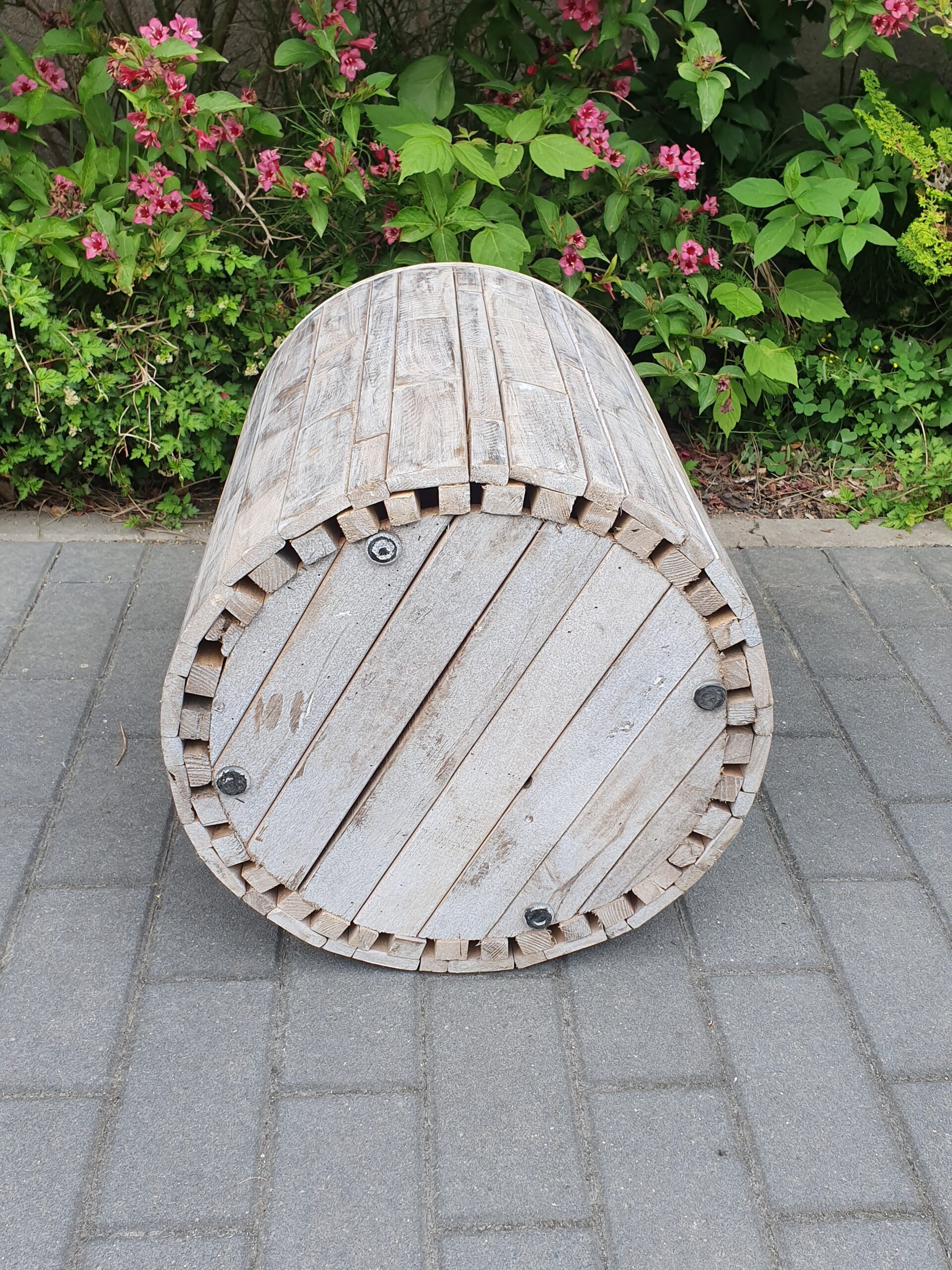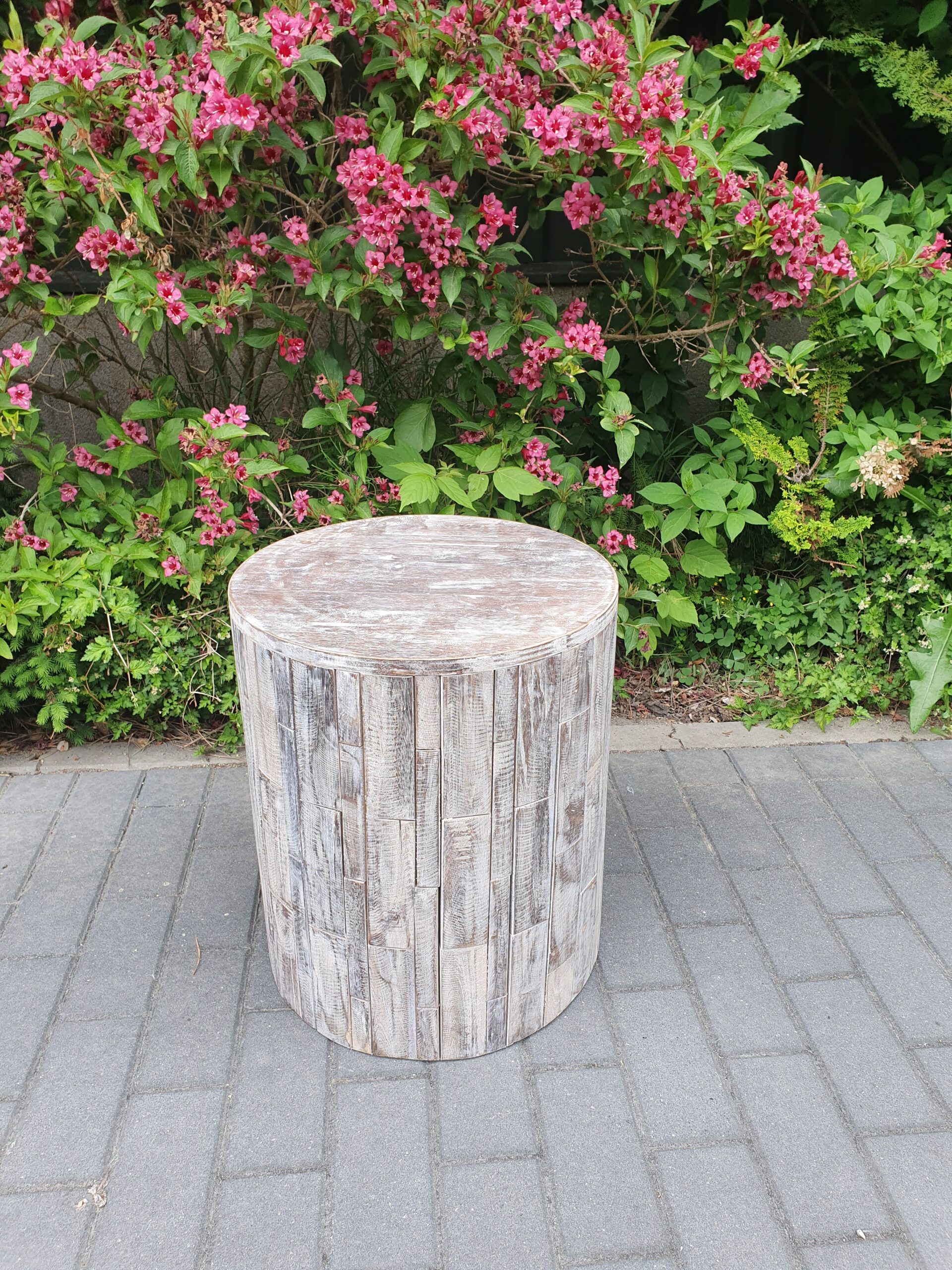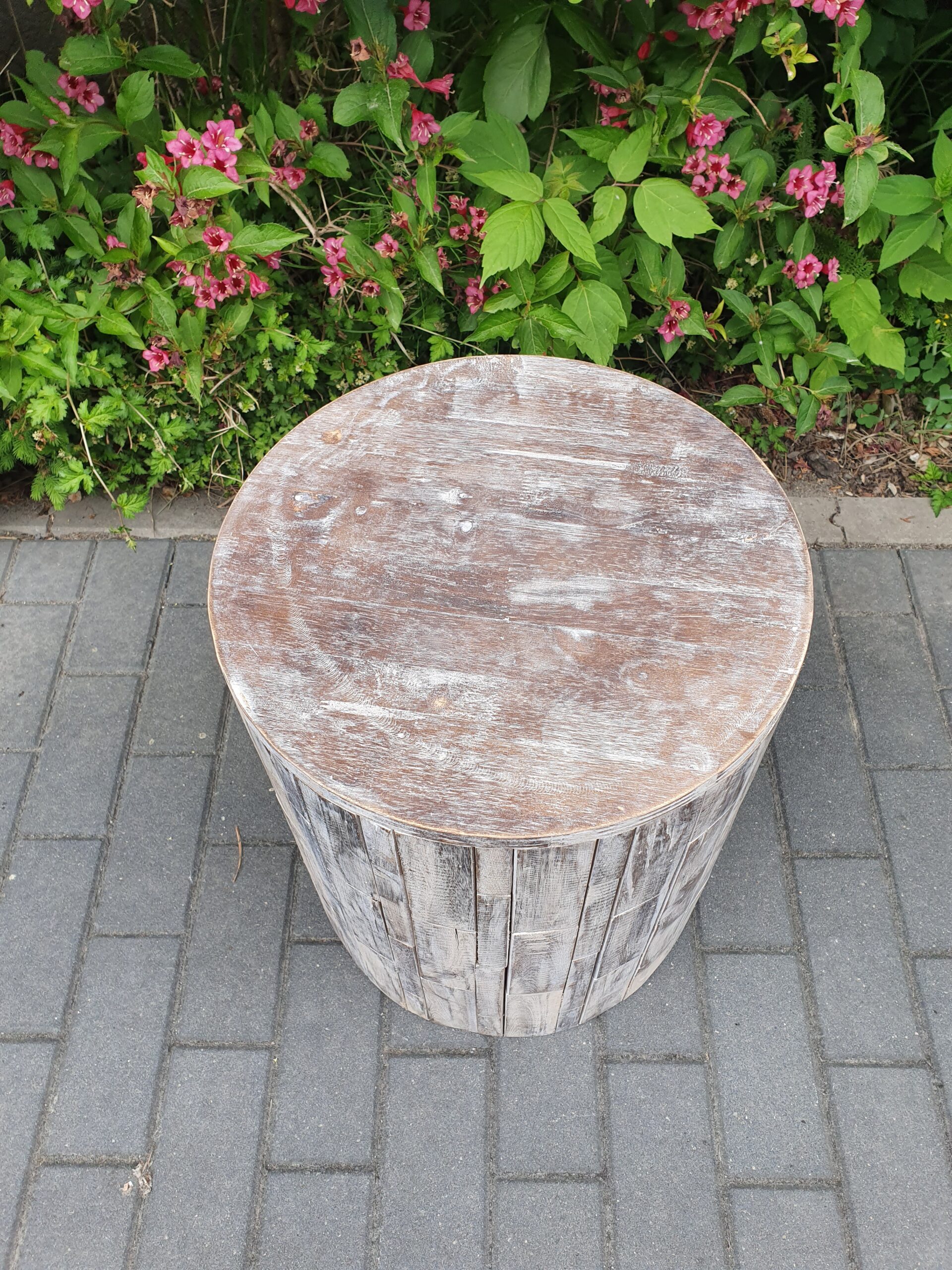 Ciekawy, okrągły stoliczek wykonany został z deseczek.