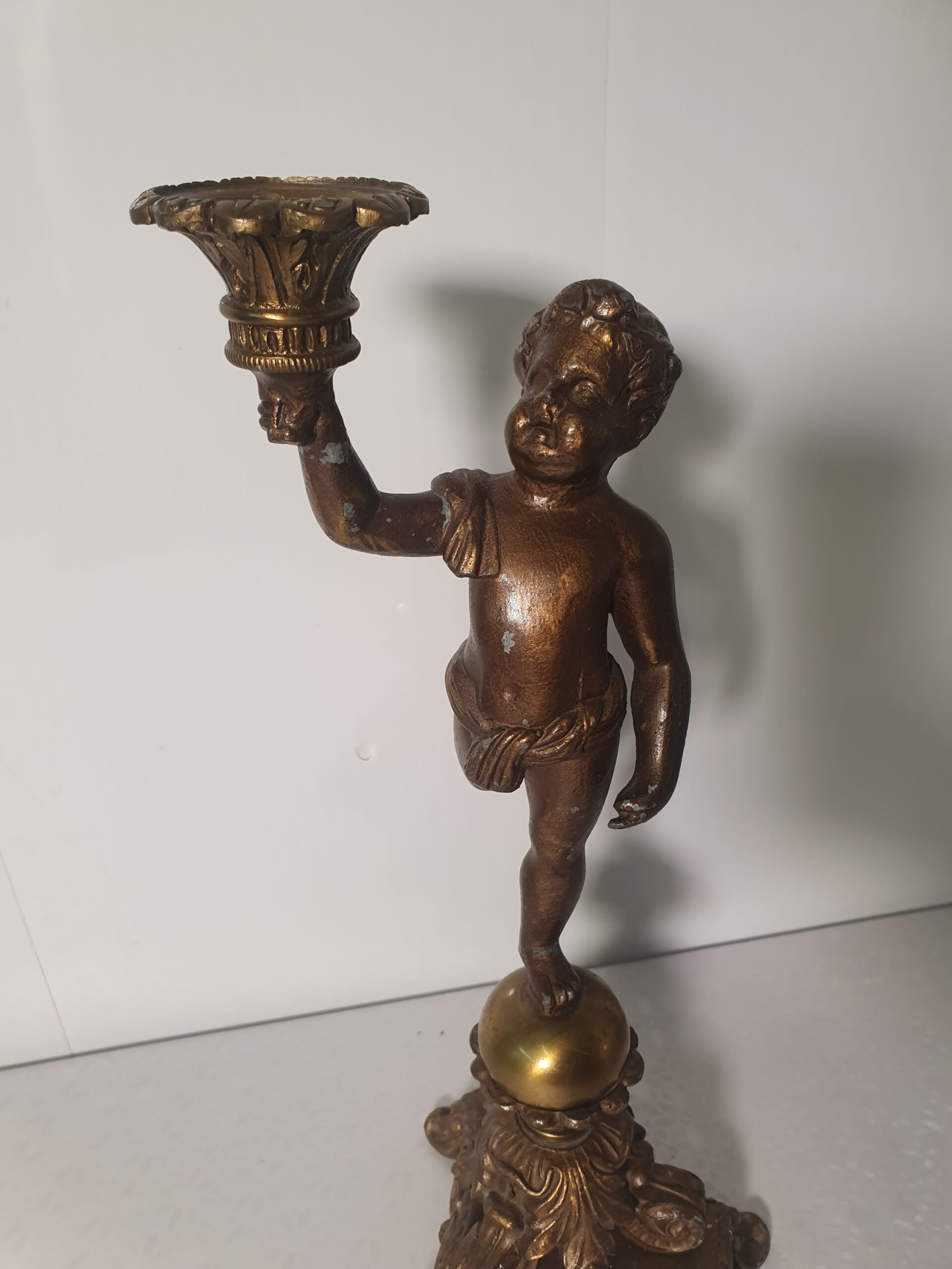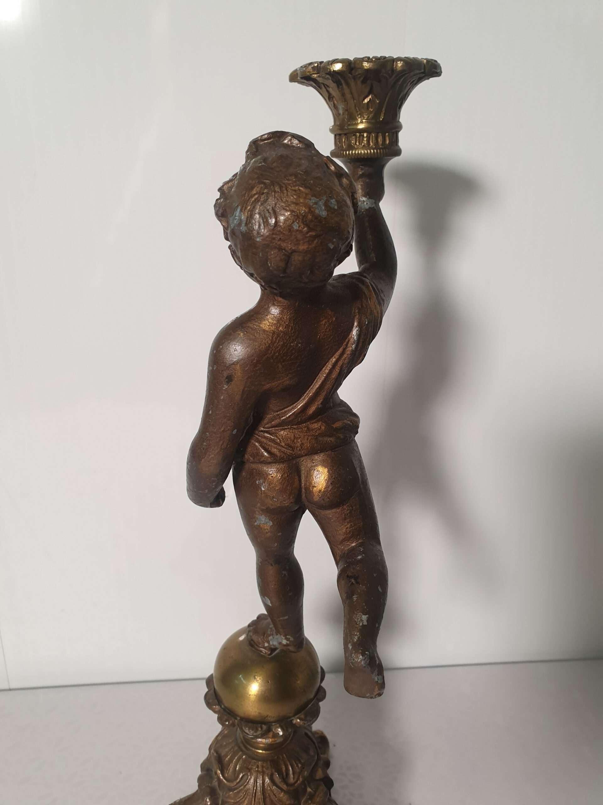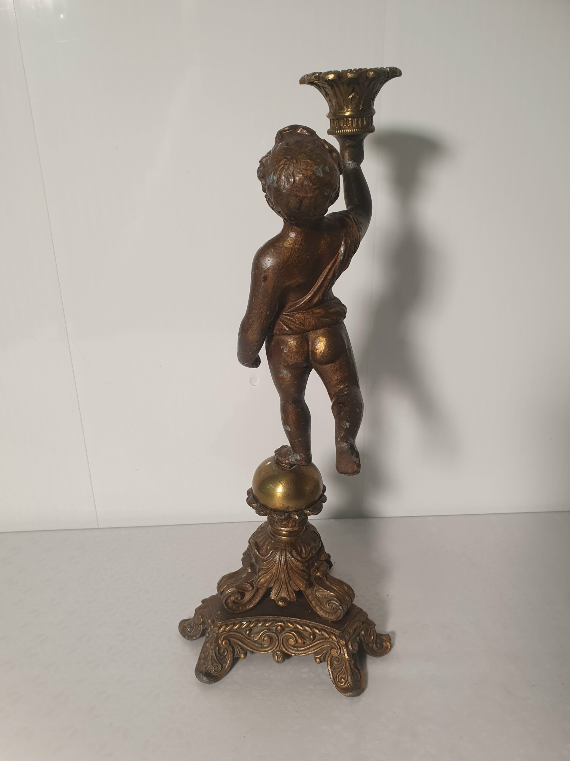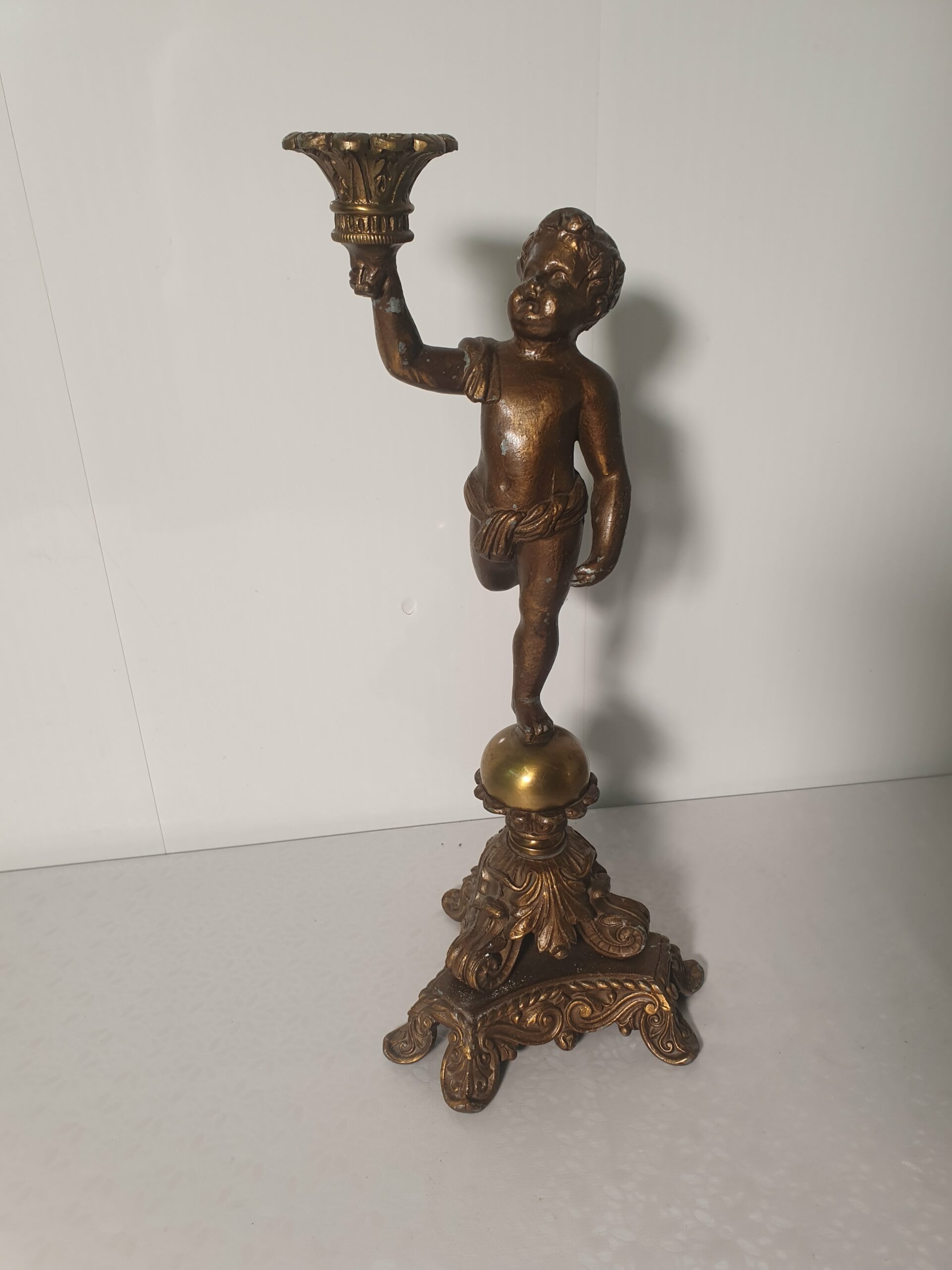 Stary świecznik wykonany z pełnego mosiądzu. Przedmiot przedstawia nagiego chłopca.