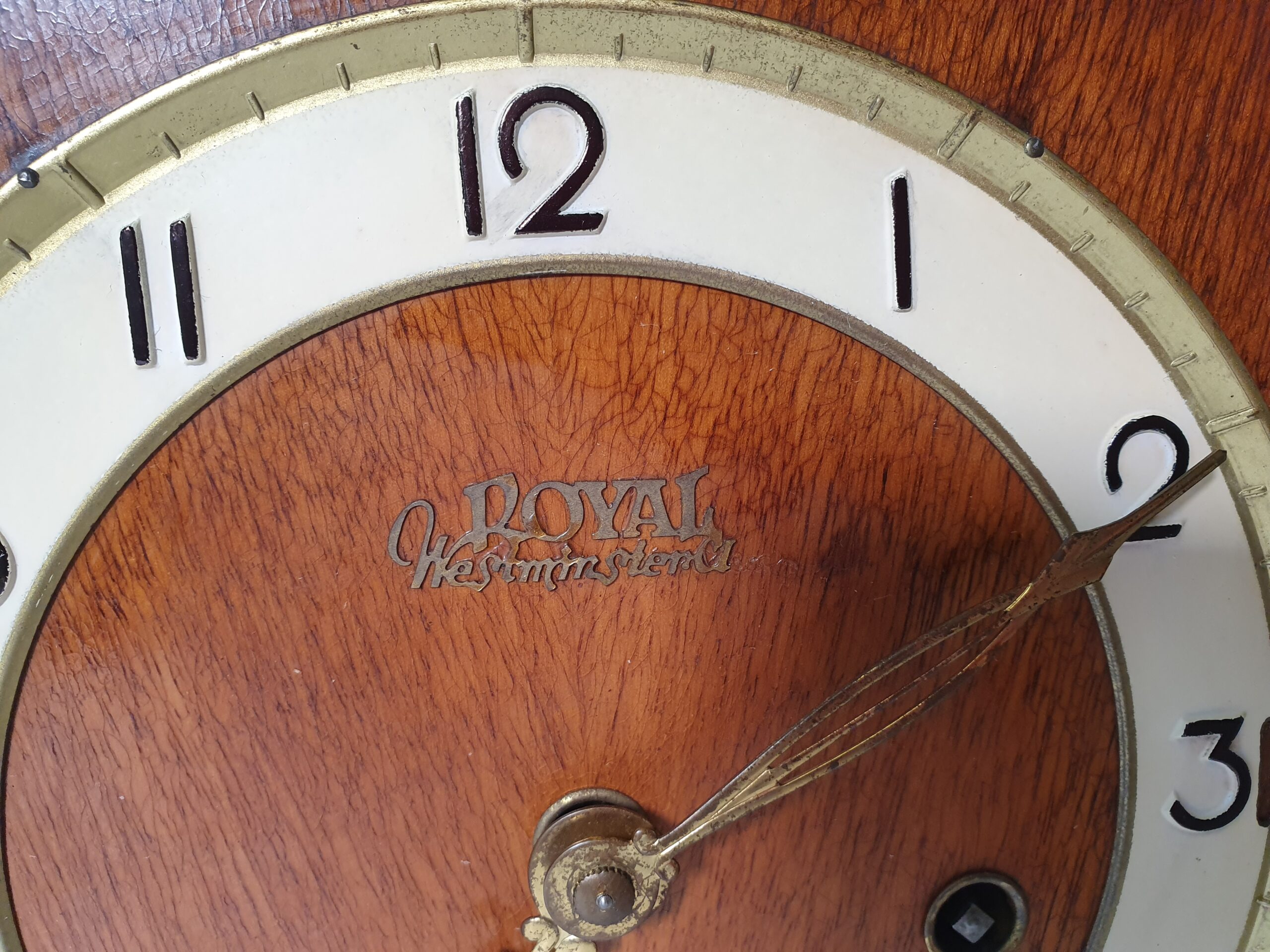 Stary zegar kominkowy z lat 50. – 60. marki Royal Westminster Clock. Zegar bije co piętnaście minut. Jest sprawny.
