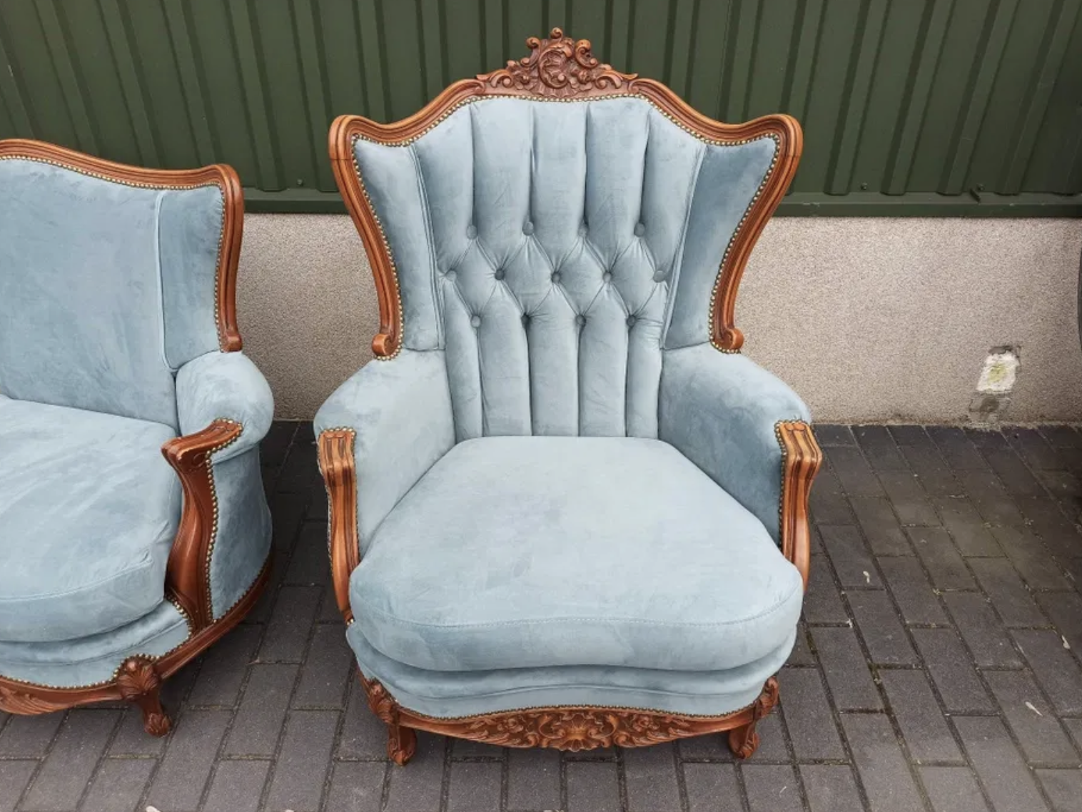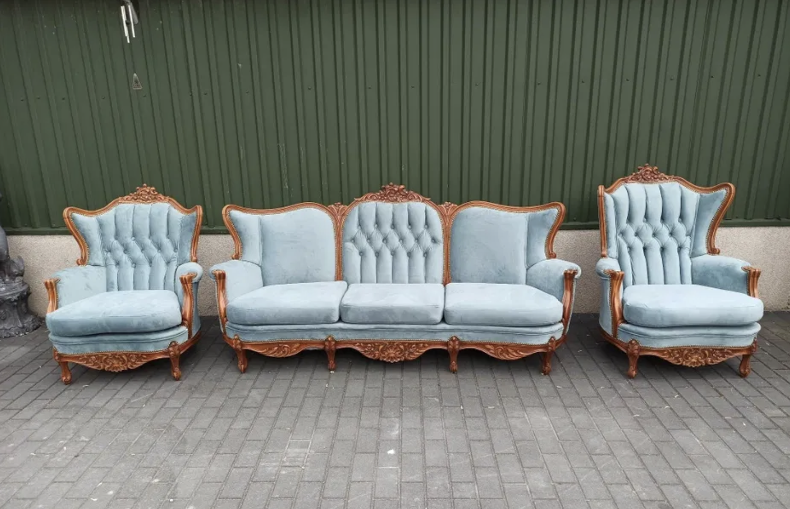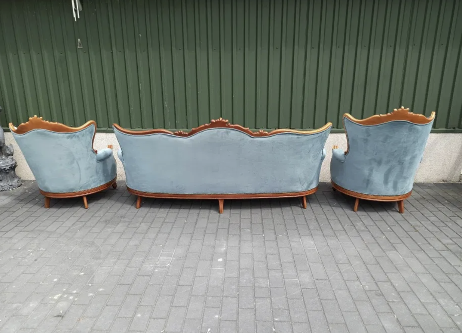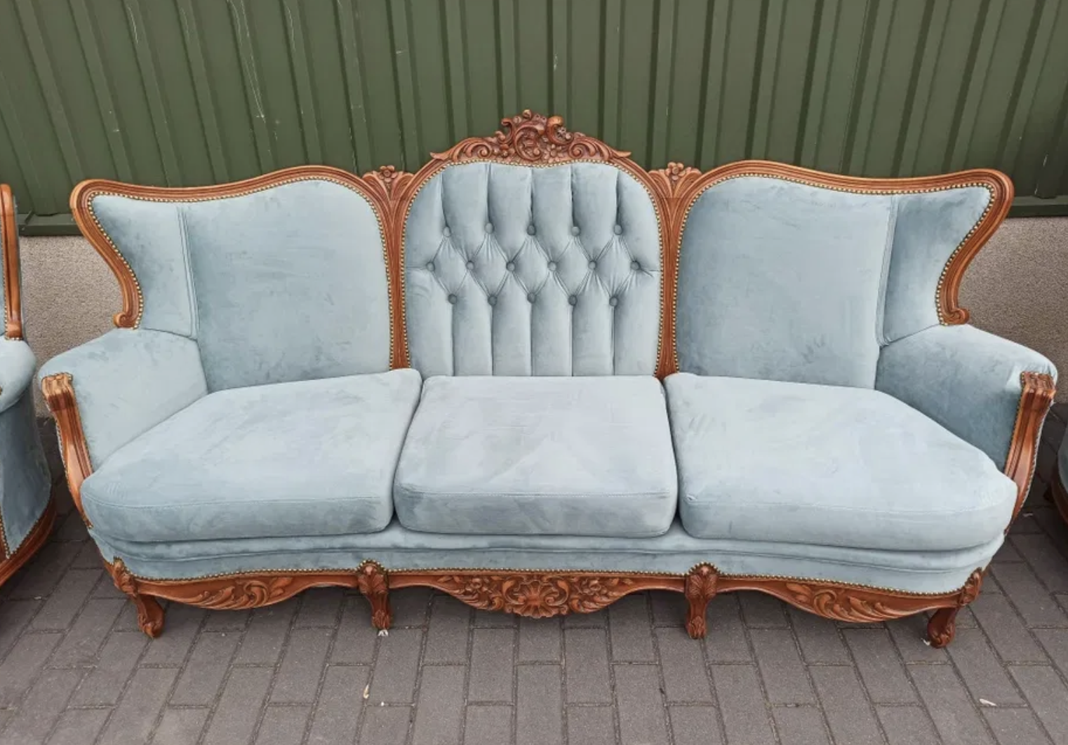 Zestaw ludwikowski – błękitna kanapa z dwoma fotelami