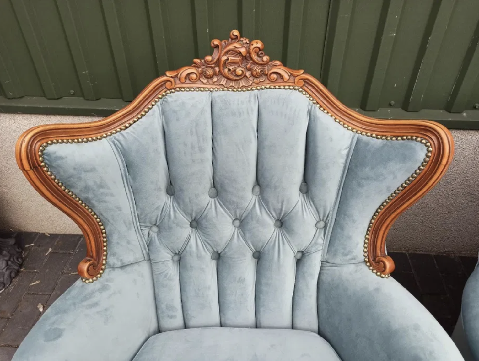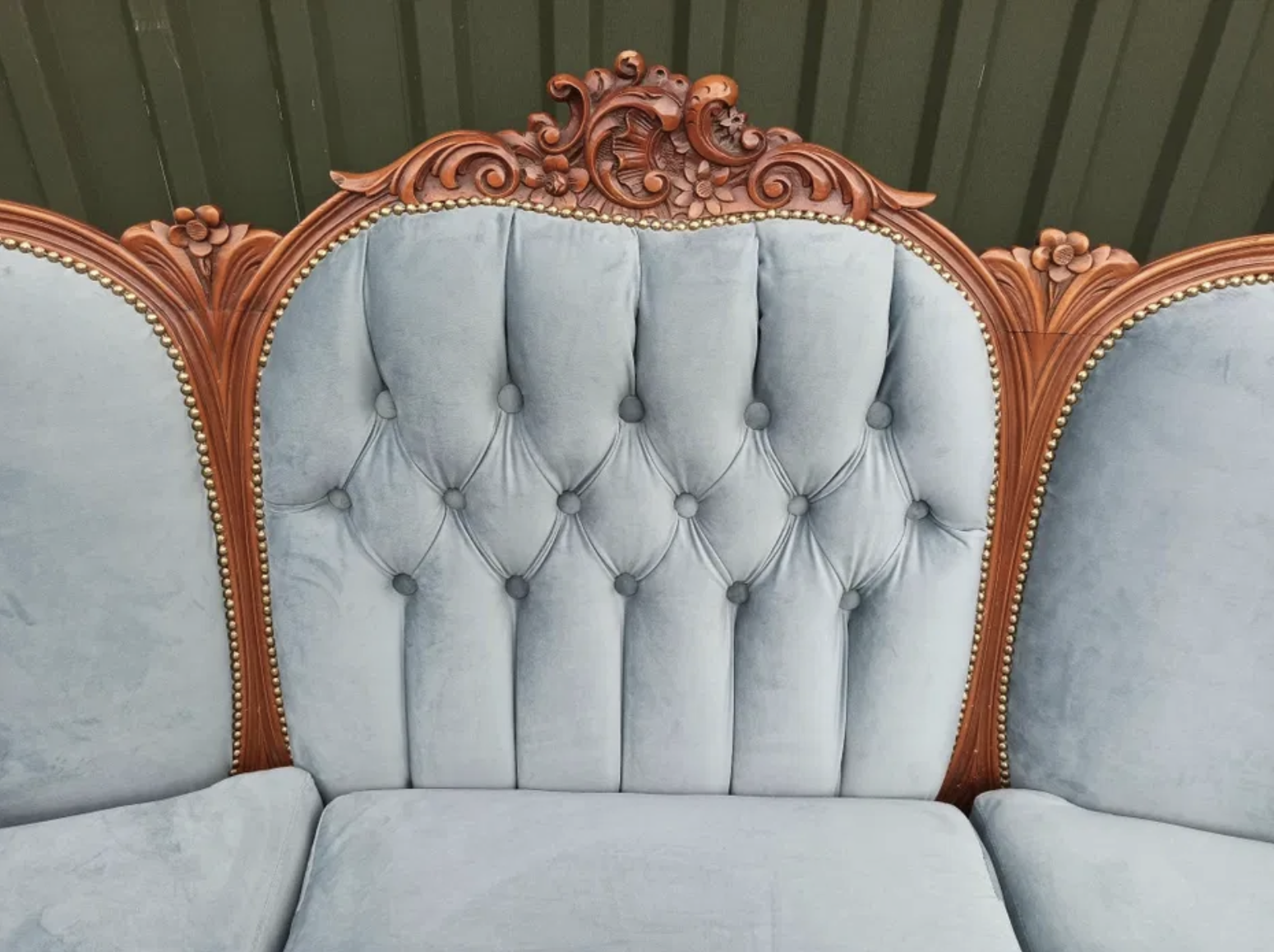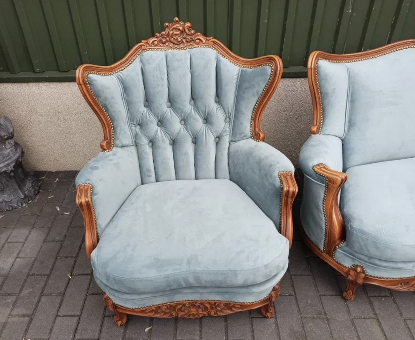 Komplet świetnie się prezentuje. Zdobiony jest rzeźbieniami oraz nową wspaniałą tapicerką.