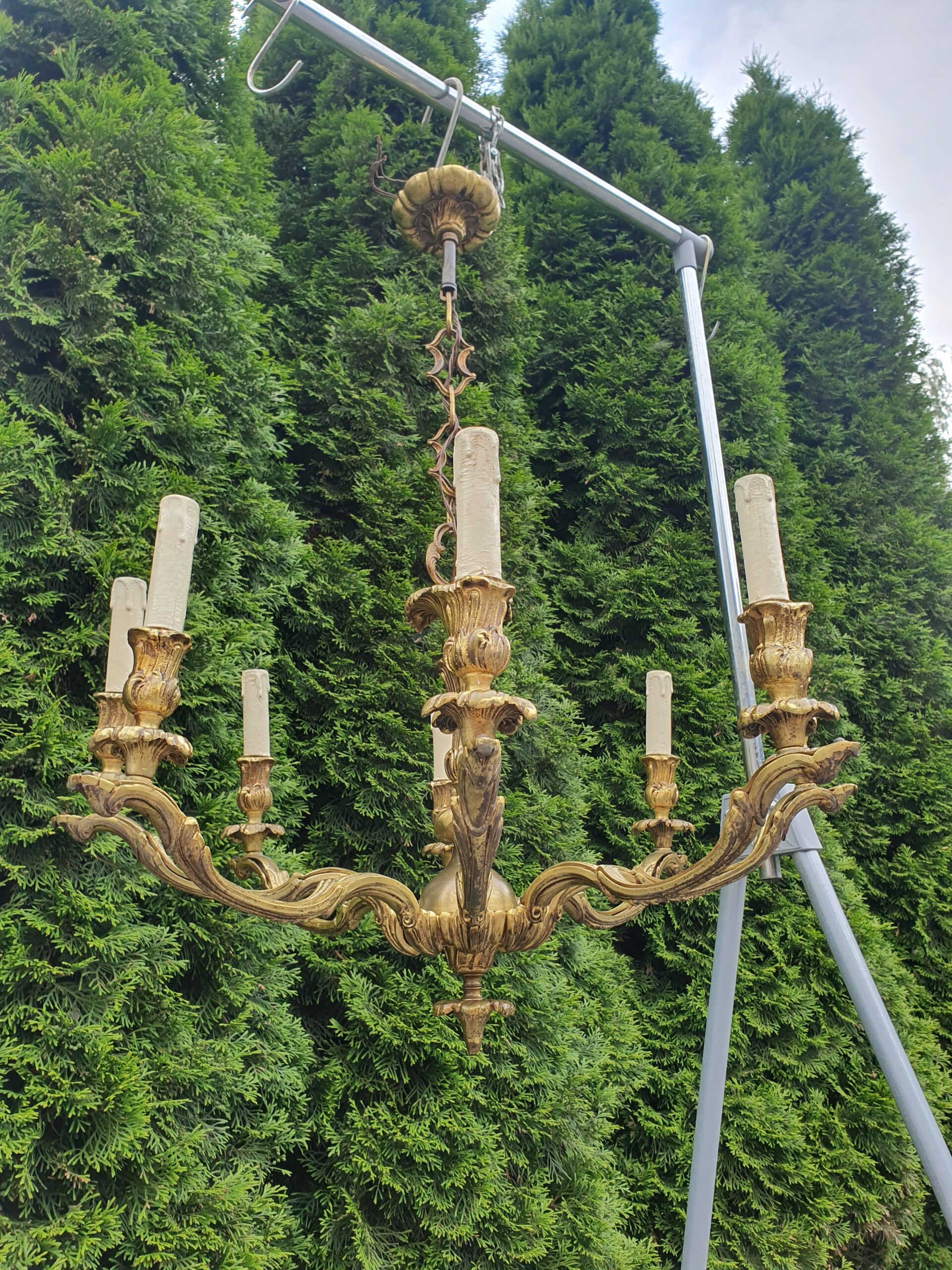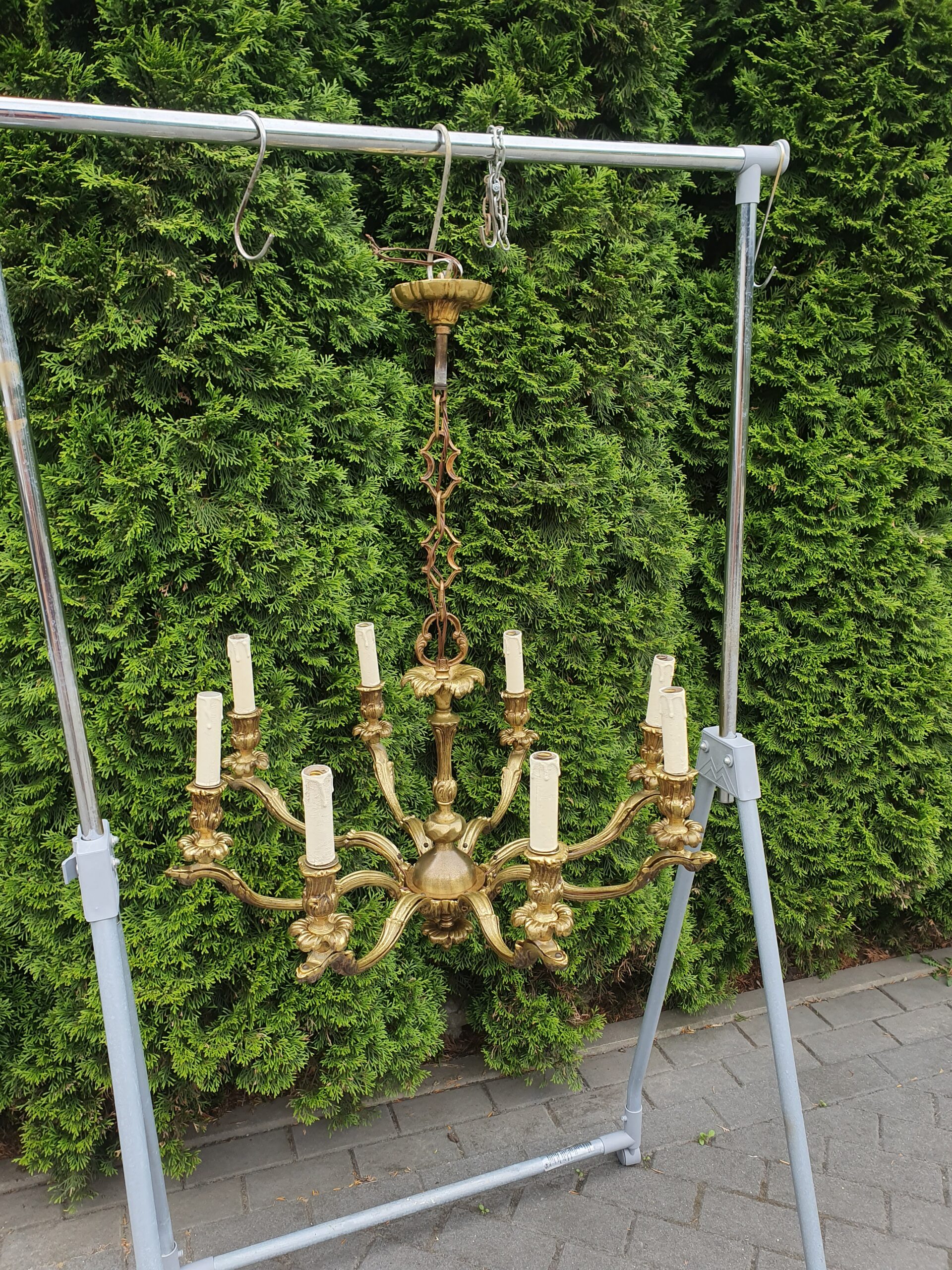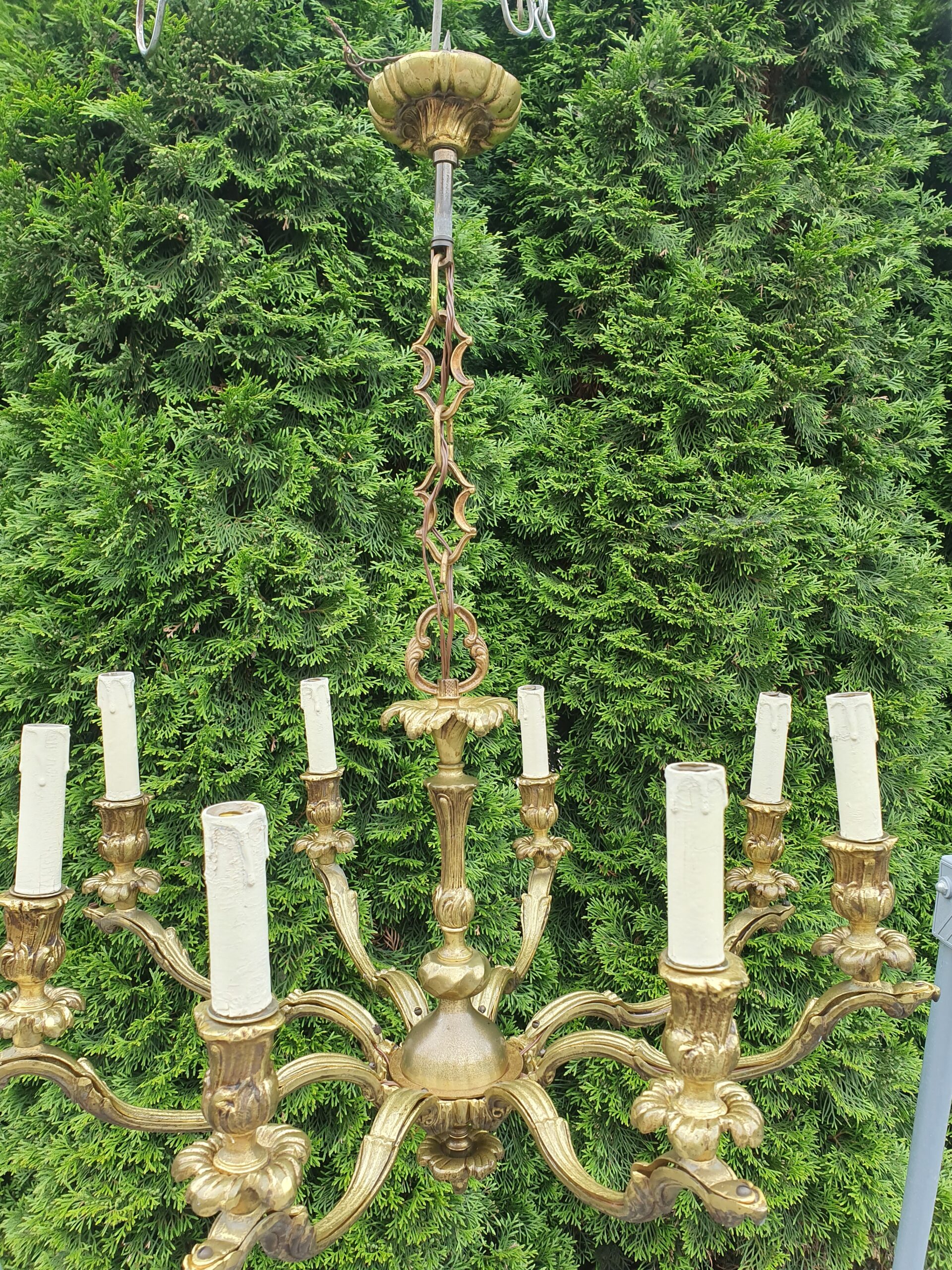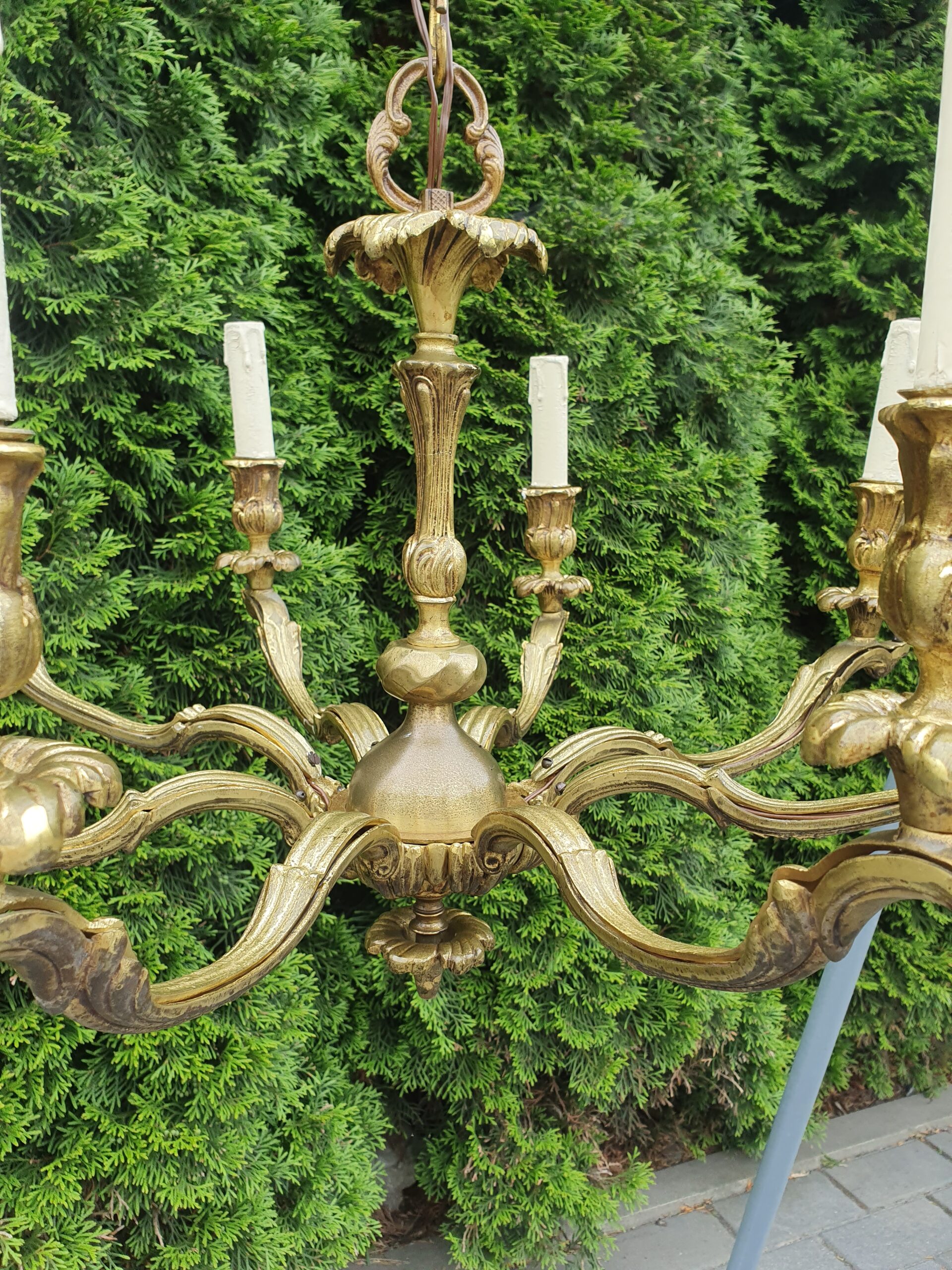 Stary żyrandol wykonany z mosiądzu. Wystarczy wkręcić 8 żarówek z małym gwintem.