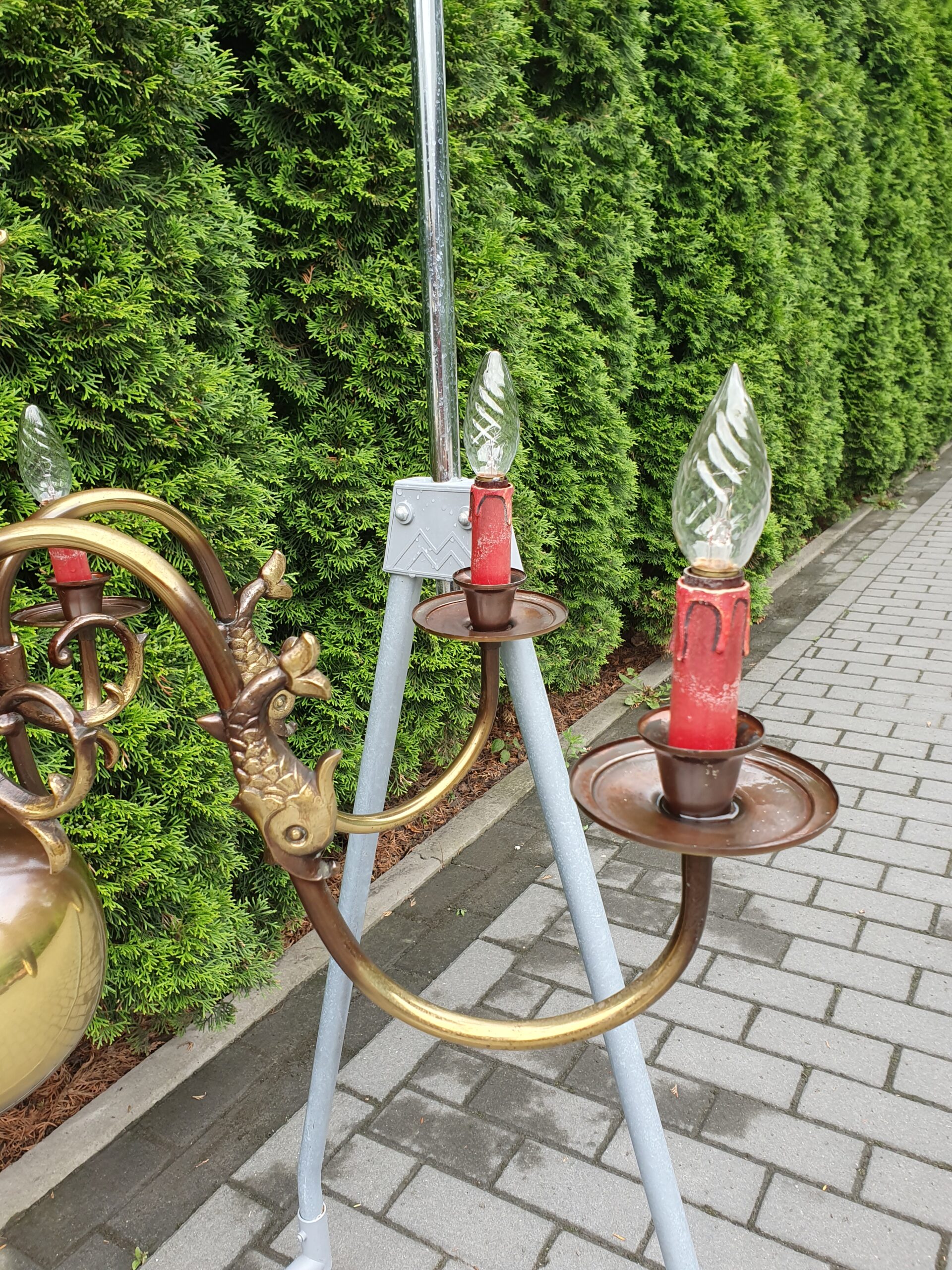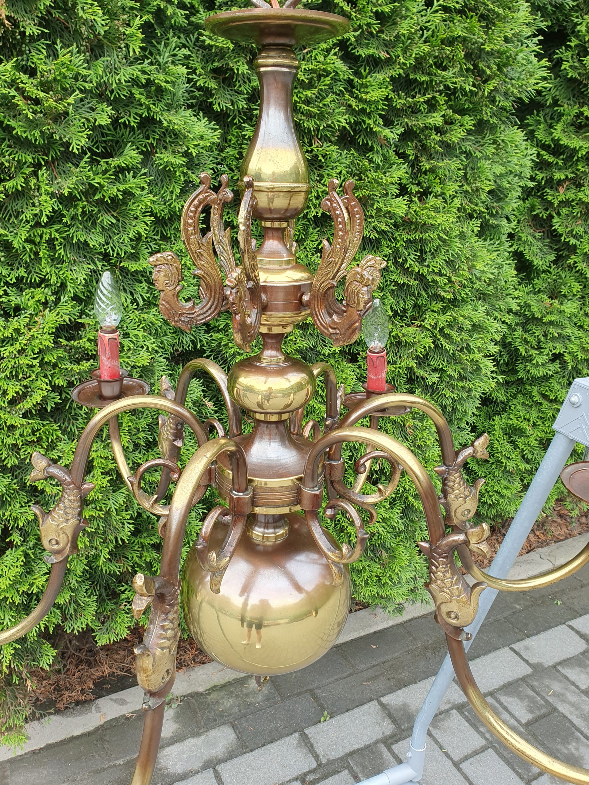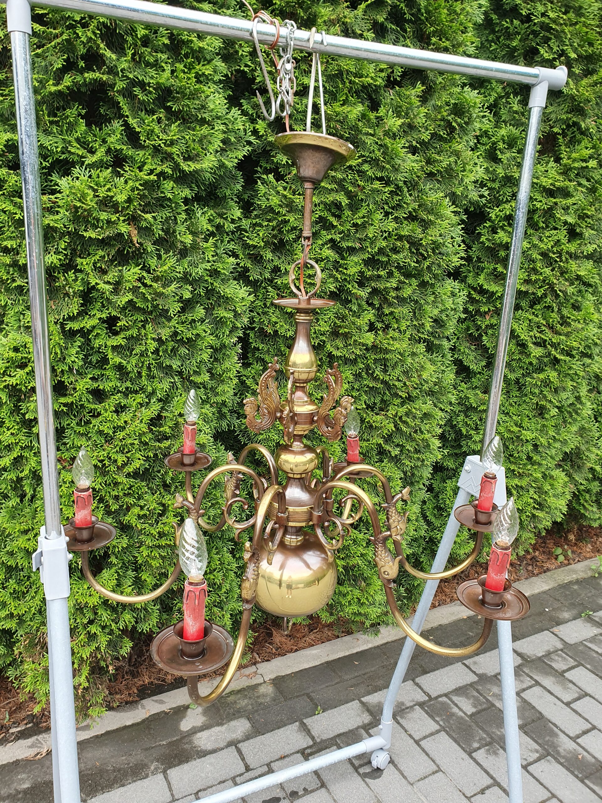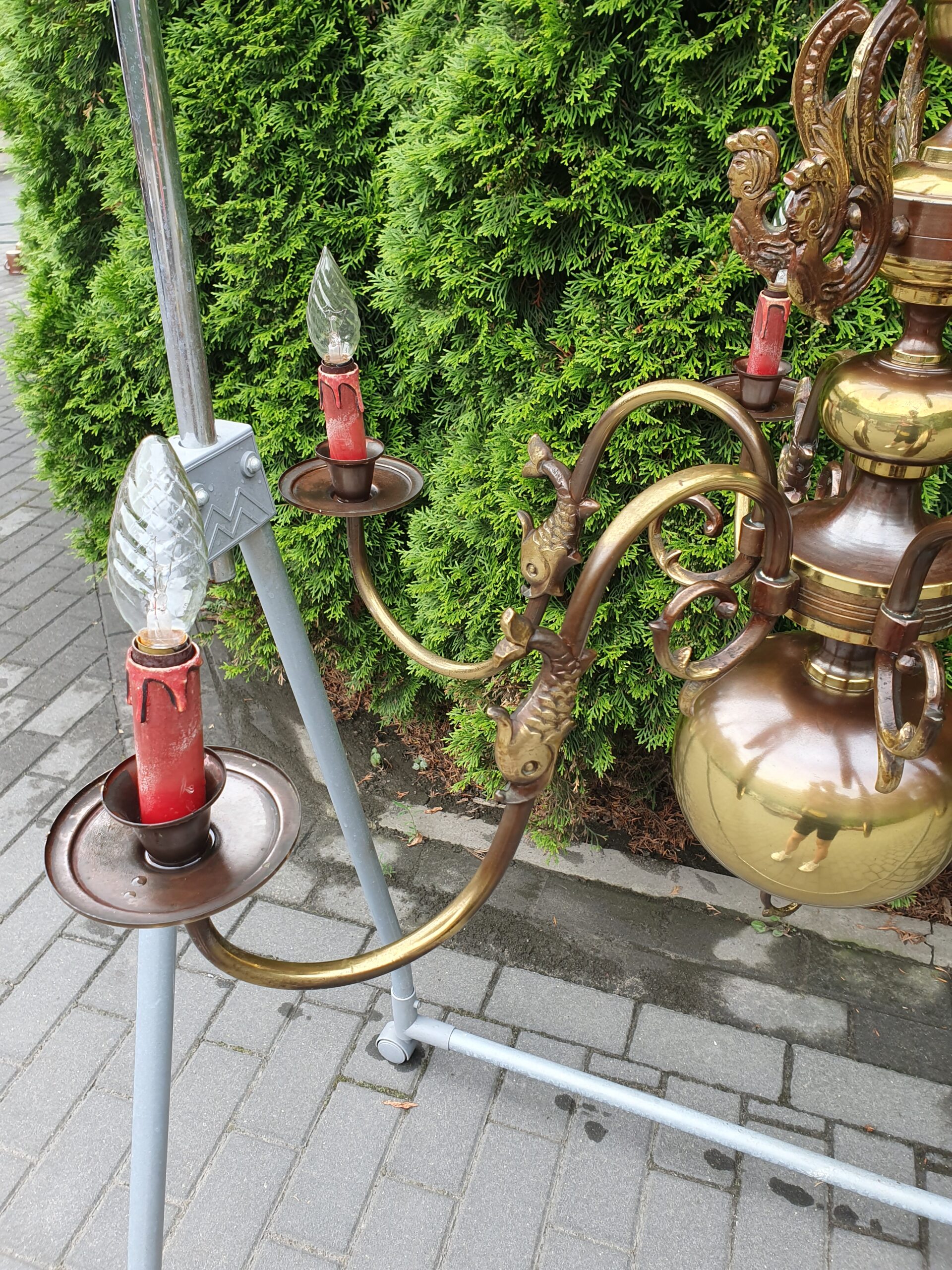 Stary żyrandol typu pająk ozdobiony rybkami. Wystarczy wkręcić 6 żarówek z małym gwintem.